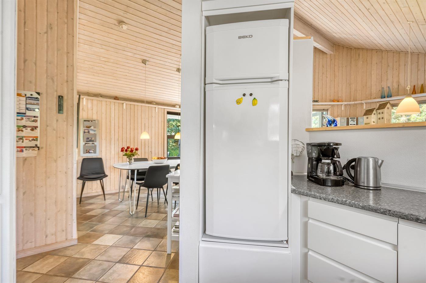 Køkkenet er udstyret med 1 køleskab. Der er 4 keramiske kogeplader, varmluftovn, mikrobølgeovn samt opvaskemaskine.