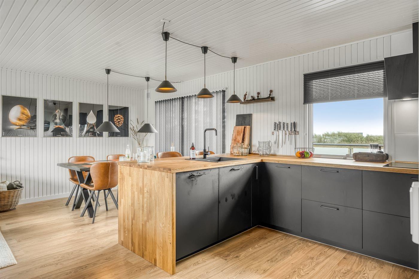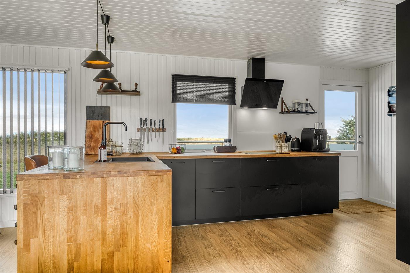 Køkkenet er udstyret med 1 køleskab. Der er 4 induktionskogeplader, varmluftovn, mikrobølgeovn samt opvaskemaskine.