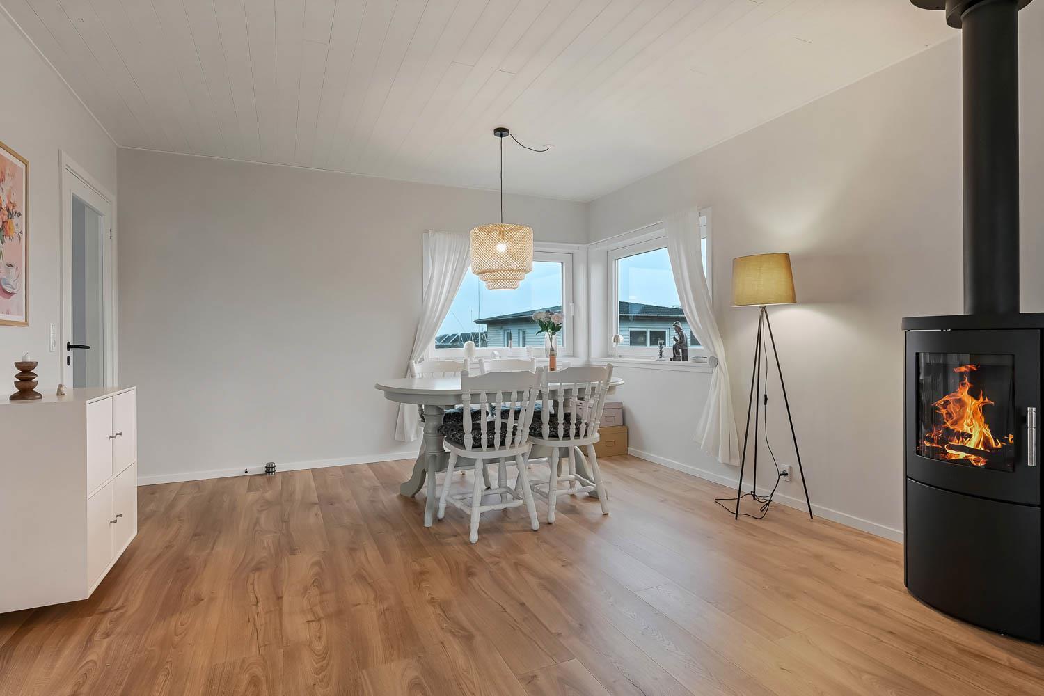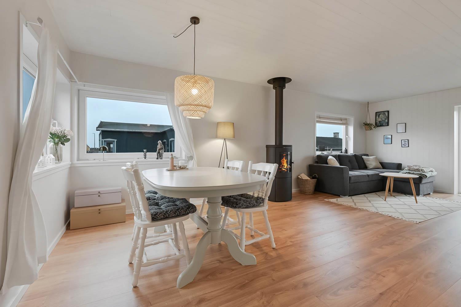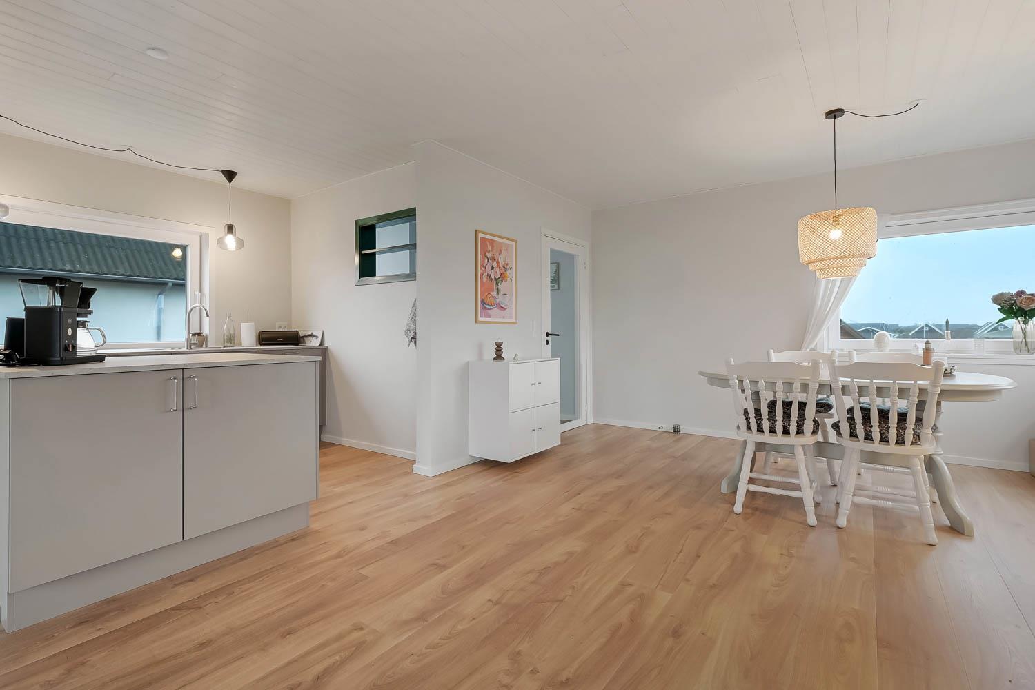Det 113 m² store hus er oprindeligt bygget i 1945 og gennemgribende renoveret i 2025, så det fremstår lyst, moderne og komfortabelt.