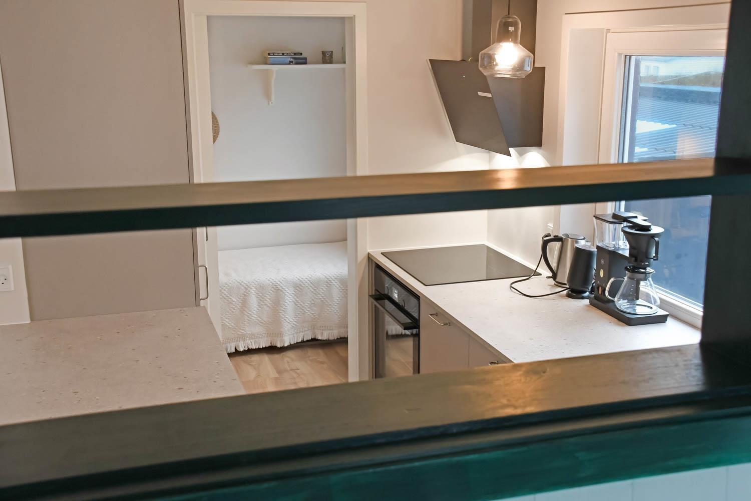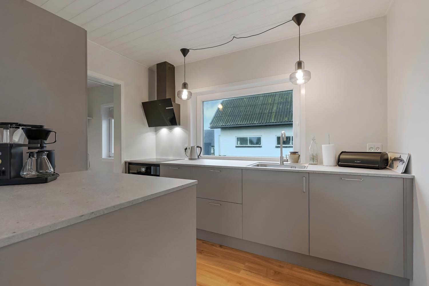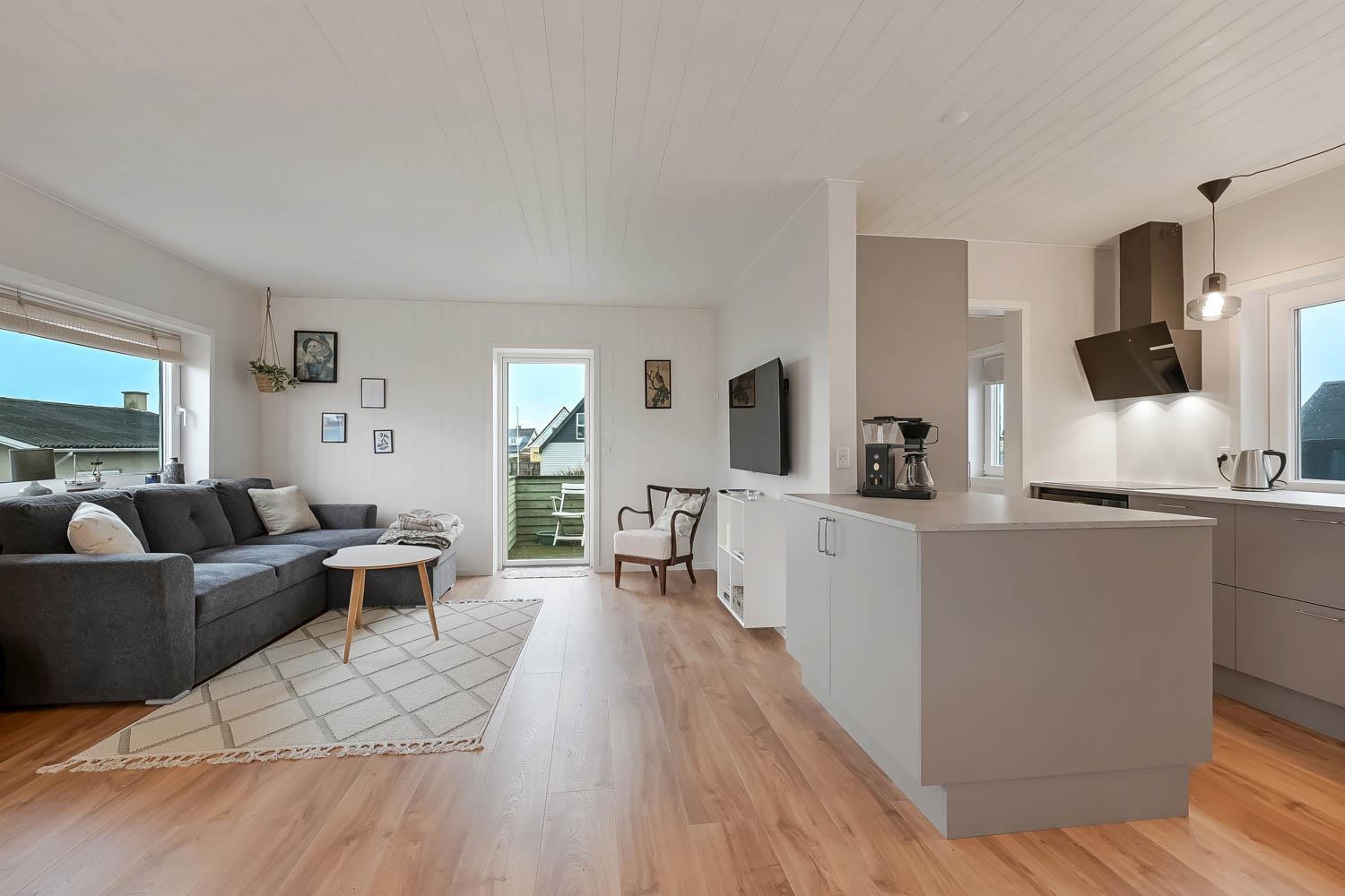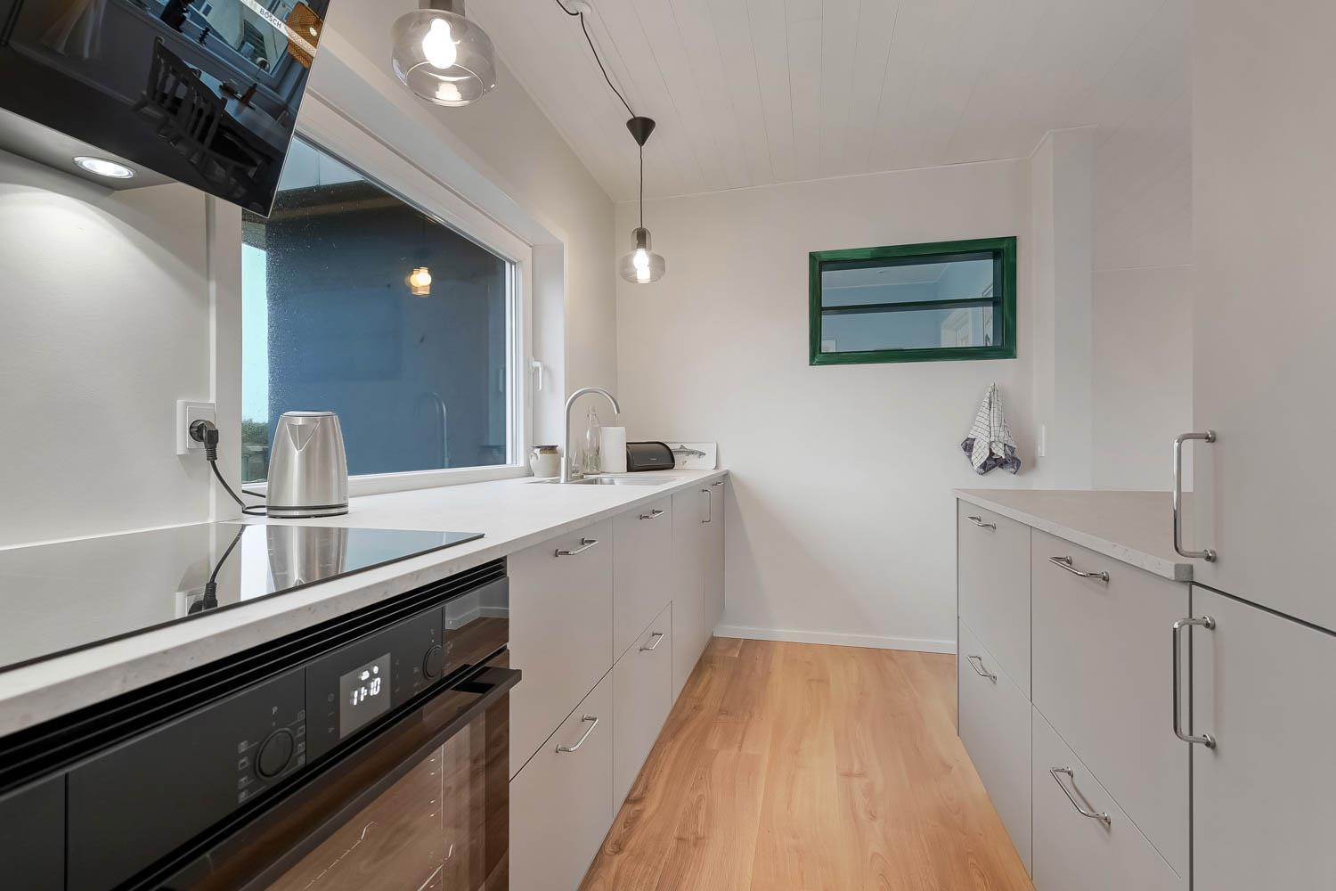 Det veludstyrede køkken har alt, hvad I behøver: glaskeramisk komfur, indbygningsovn, emhætte, køle-/fryseskab, opvaskemaskine og naturligvis gulvvarme.