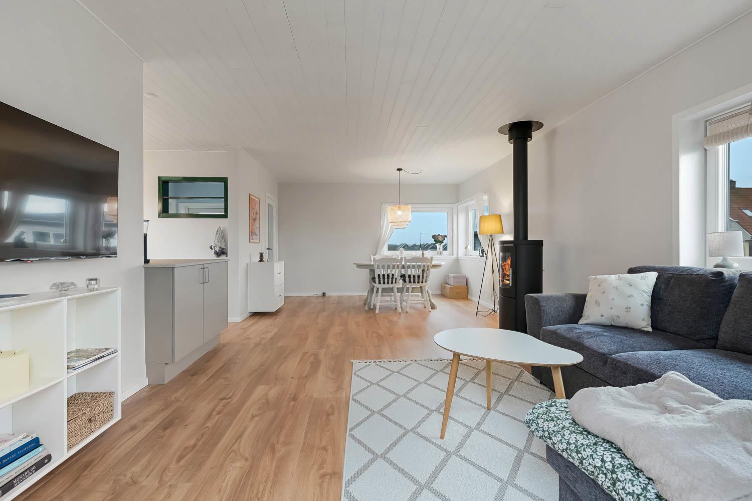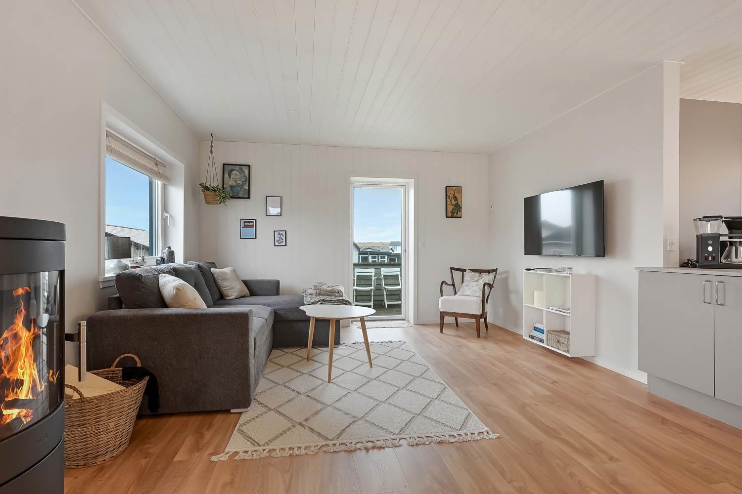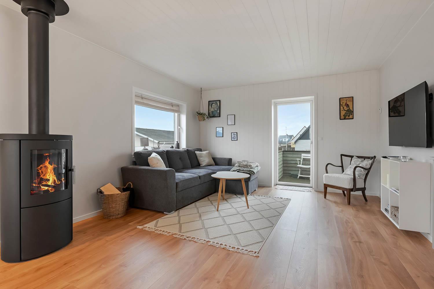 Den hyggelige stue byder på polstrede møbler, brændeovn, TV med danske programmer og behagelig gulvvarme – perfekt til afslapning efter en dag ved havet.