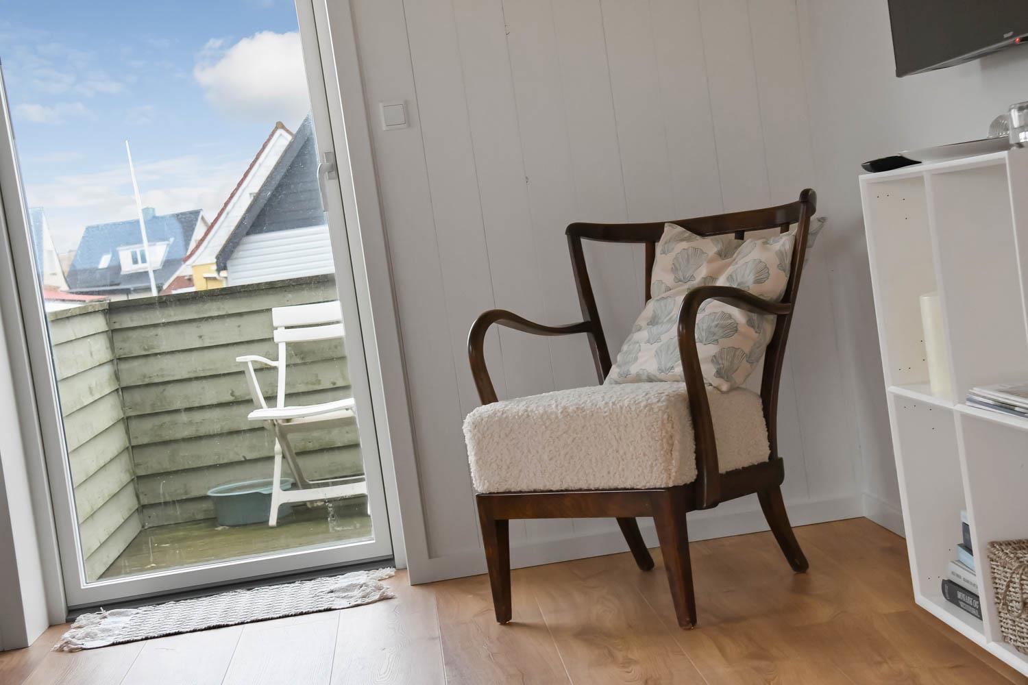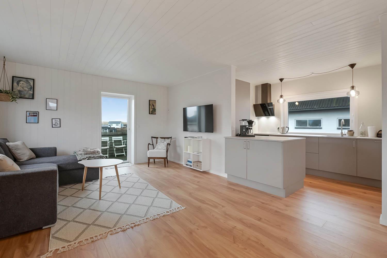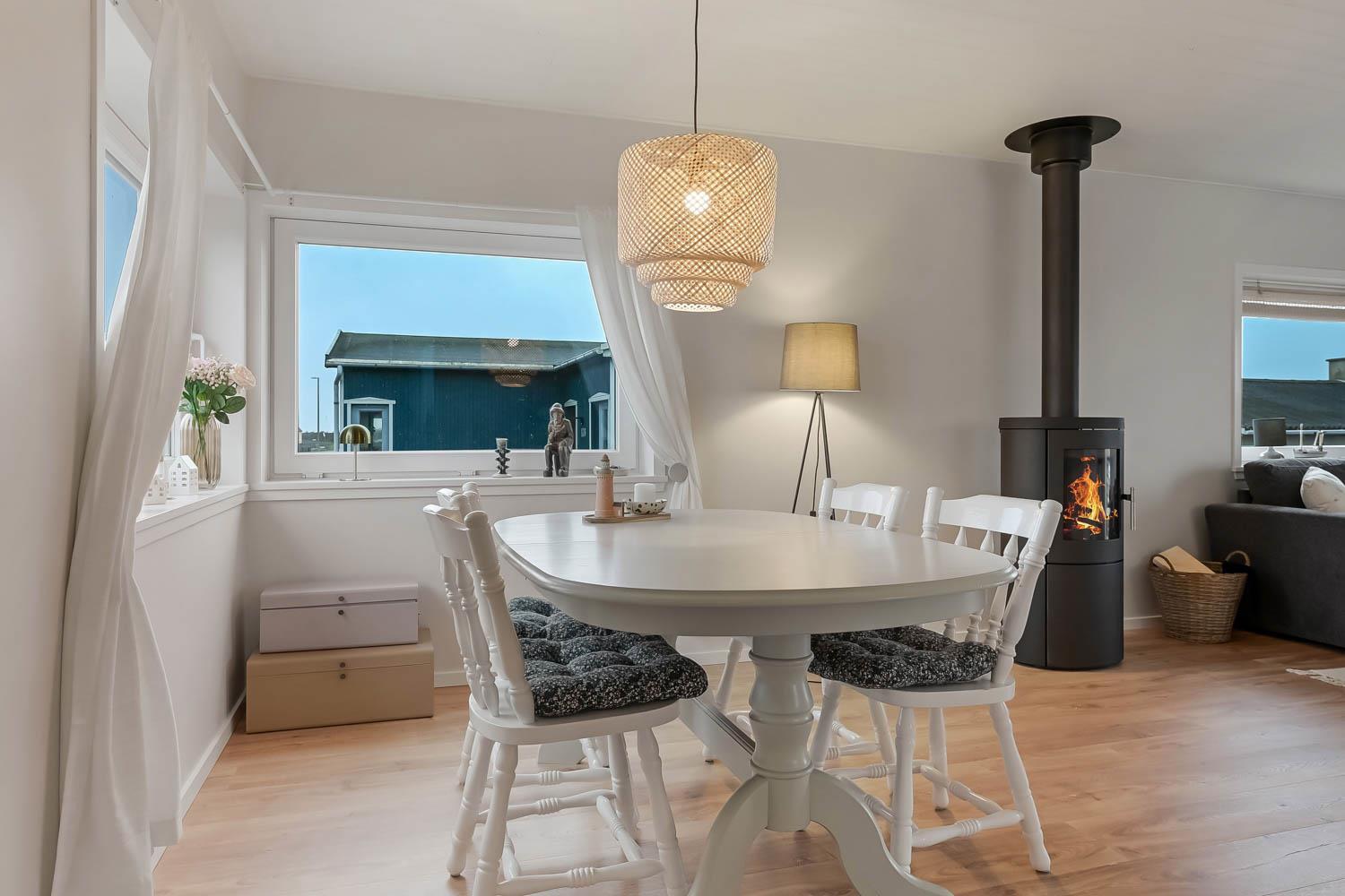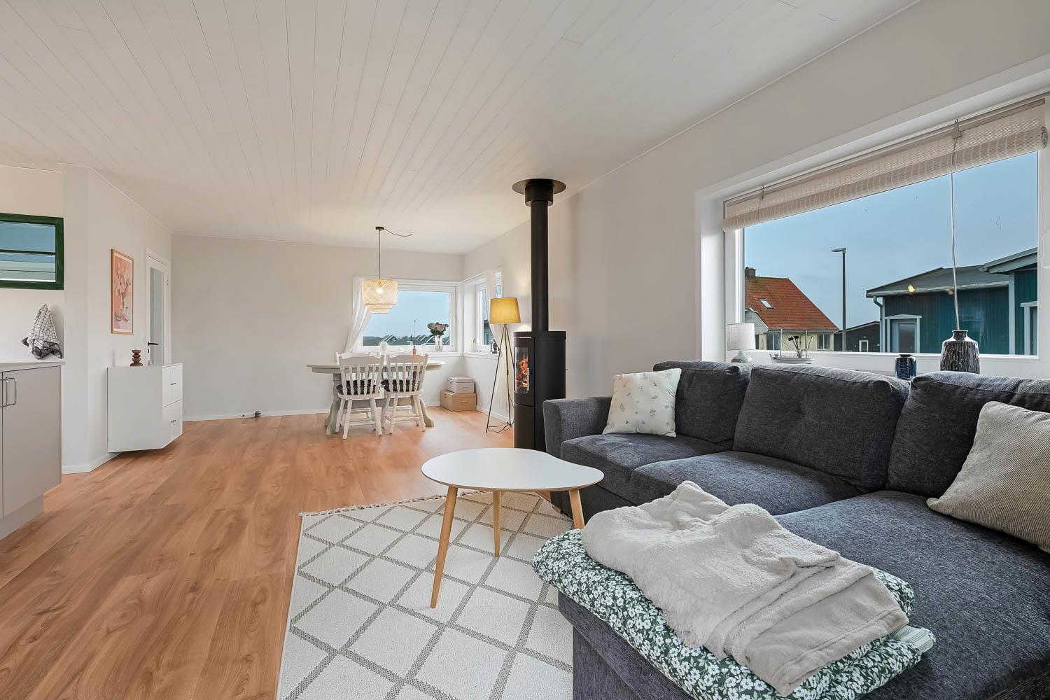 Den hyggelige stue byder på polstrede møbler, brændeovn, TV med danske programmer og behagelig gulvvarme – perfekt til afslapning efter en dag ved havet.
