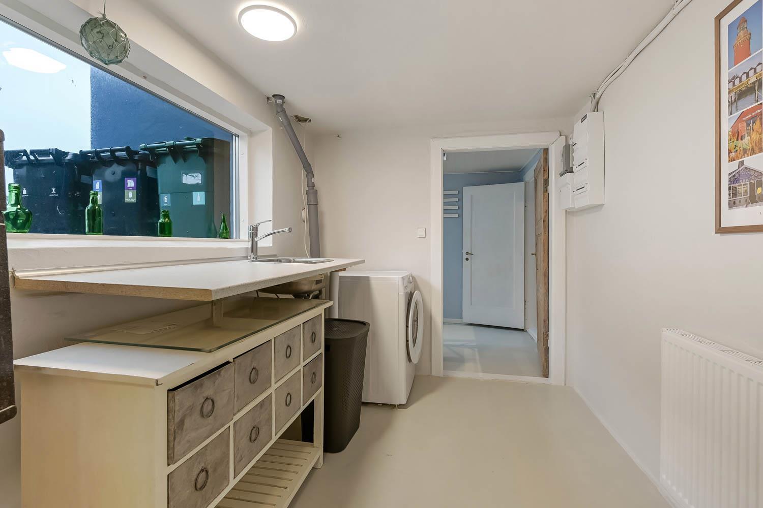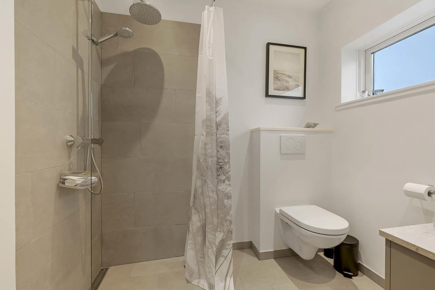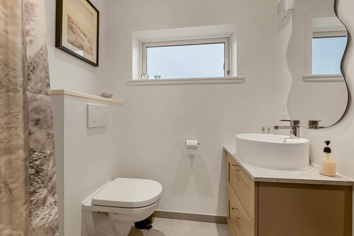 Det pæne badeværelse er udstyret med toilet, håndvask, bruser og gulvvarme. Derudover findes både vaskemaskine, internet, barnestol til de mindste – og huset er naturligvis et ikke-rygerhus. Har man el-bil eller en Plug-In hybrid, så er der opsat ladeboks ved huset.