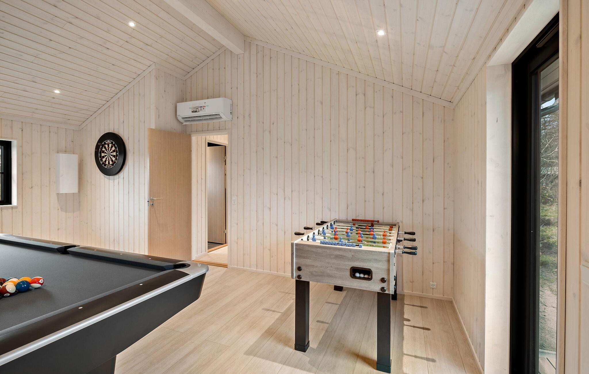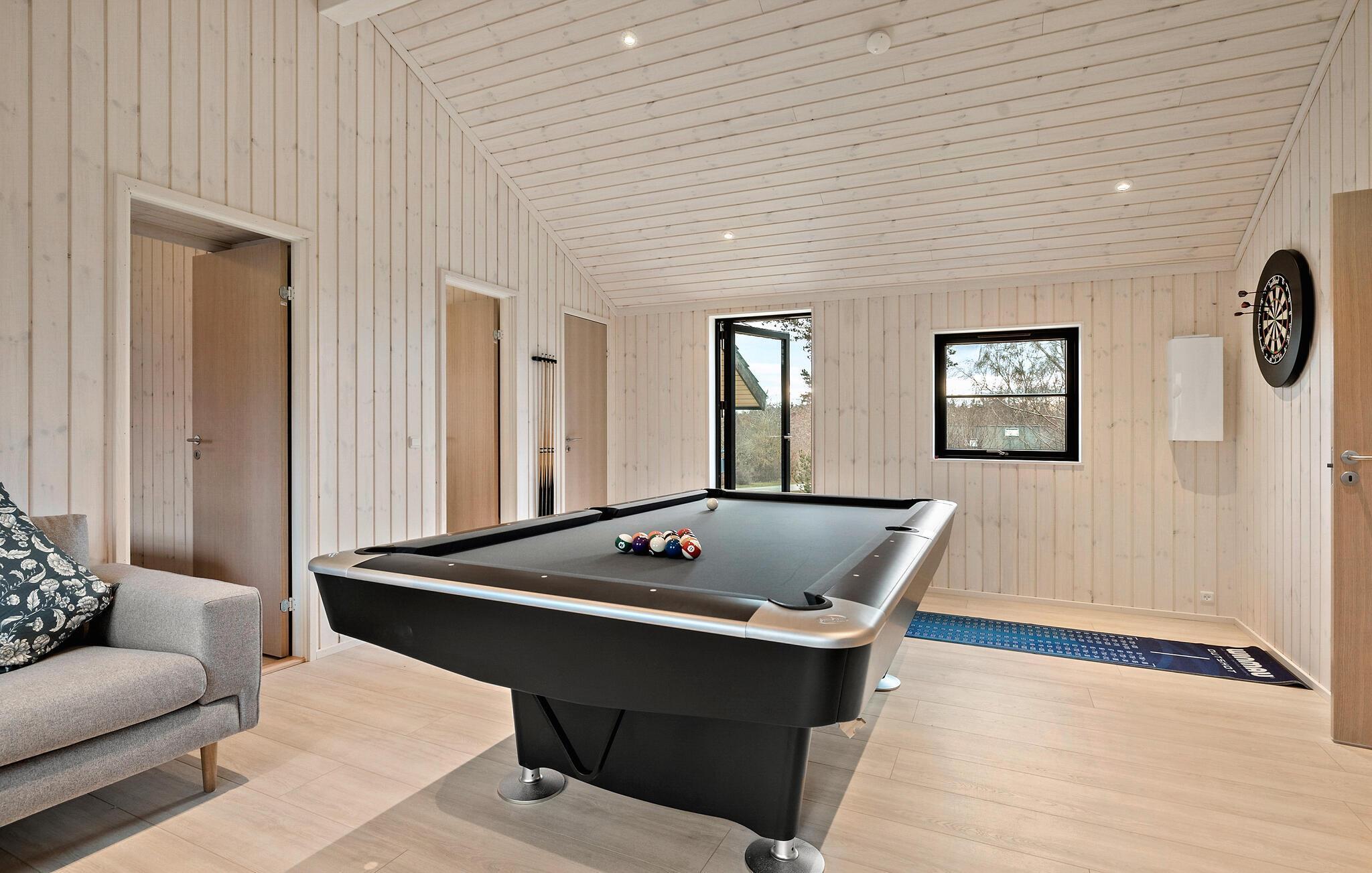 Dette rummelige feriehus tilbyder jer en stilfuld atmosfære med møbler af høj kvalitet og masser af plads til at slappe af. Opholdsstuen med brændeovn lægger op til hyggelige timer, mens spillelokalet med billard, dart og bordtennis byder på underholdning for hele familien.