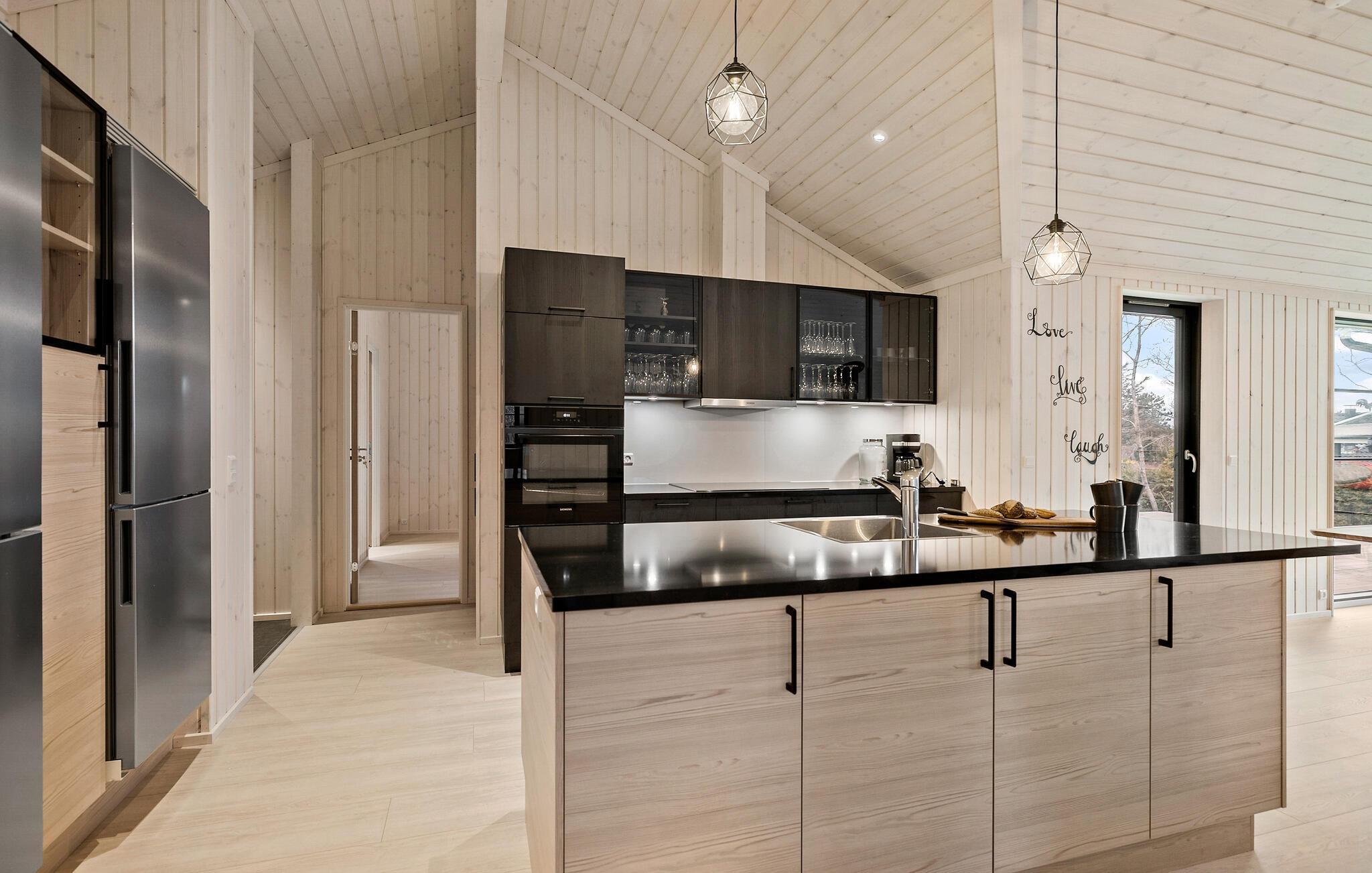 Nyd afslappende dage i dette lyse træhus med moderne bekvemmeligheder og store terrasser.