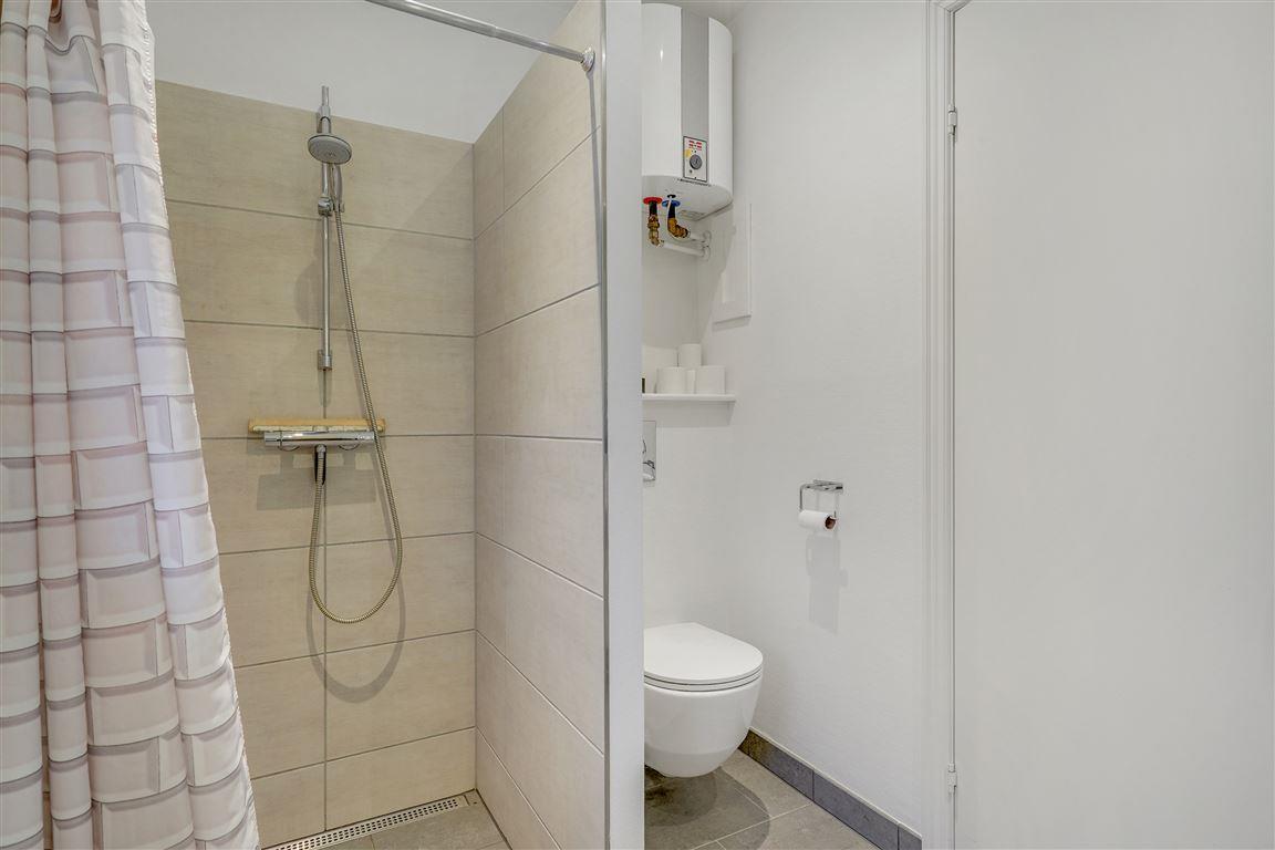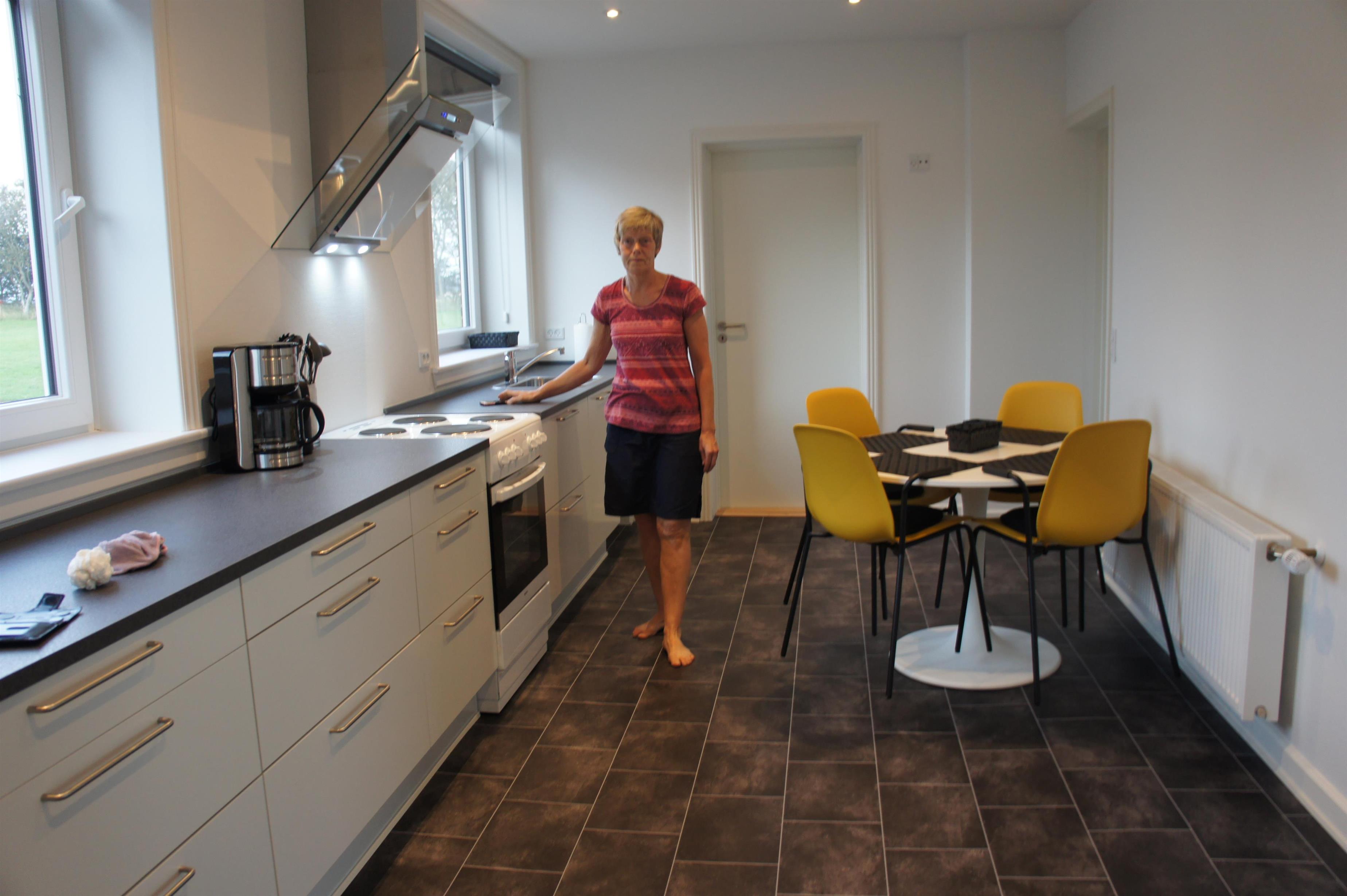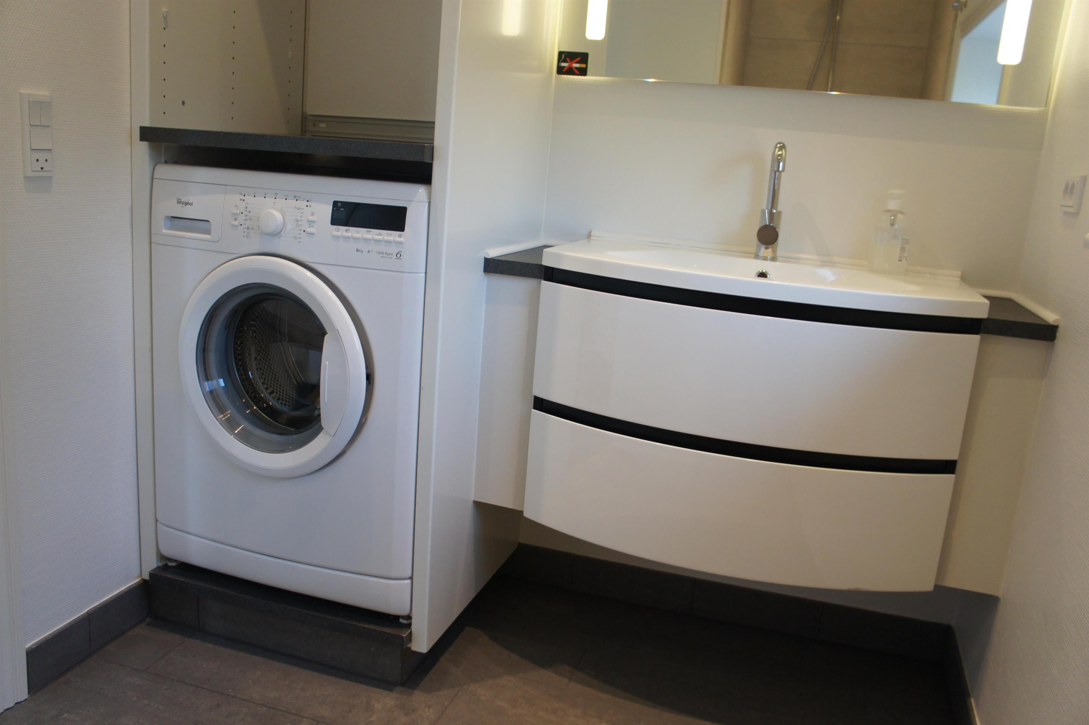 Badeværelse med gulvvarme og vaskemaskine. Køkken med køleskab, kaffemaskine, mikrobølgeovn, komfur og emhætte.