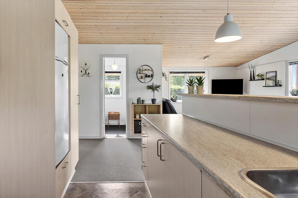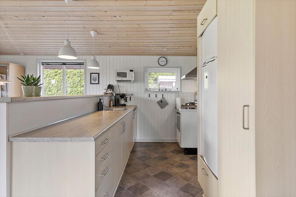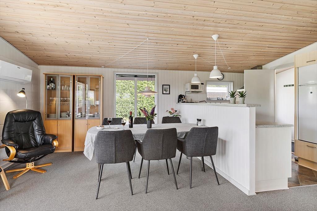 Så snart I træder ind i sommerhuset, vil I mærke den afslappede og imødekommende stemning, der kendetegner stedet. Den lyse indretning og de hyggelige detaljer skaber et rum, hvor det er let at føle sig hjemme – uanset om I er en lille familie eller flere generationer, der holder ferie sammen. I stuen er der plads til fælles stunder med kortspil, gode bøger og lange samtaler over et glas vin, og når aftensmaden skal tilberedes, kan hele familien samles i det åbne køkken, så ingen går glip af hyggen. Huset rummer plads til både voksne og børn, og jeres firbenede ven er naturligvis også velkommen.