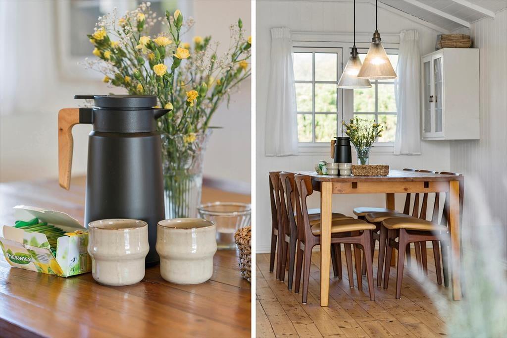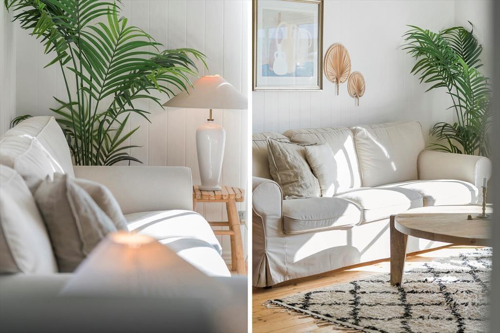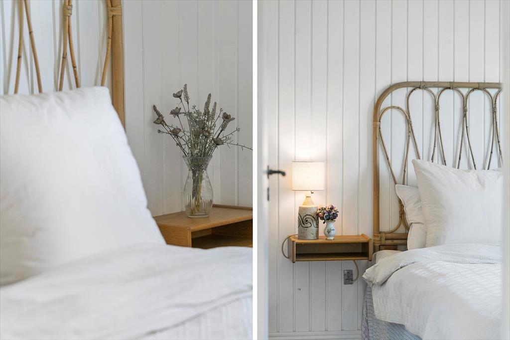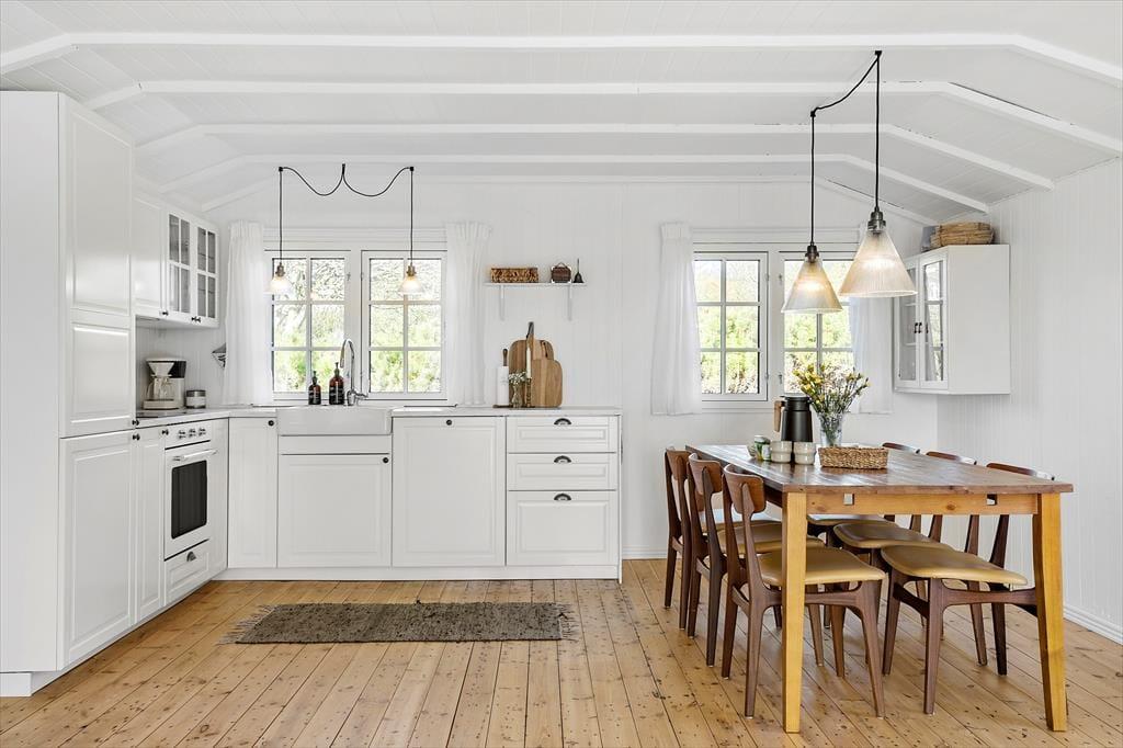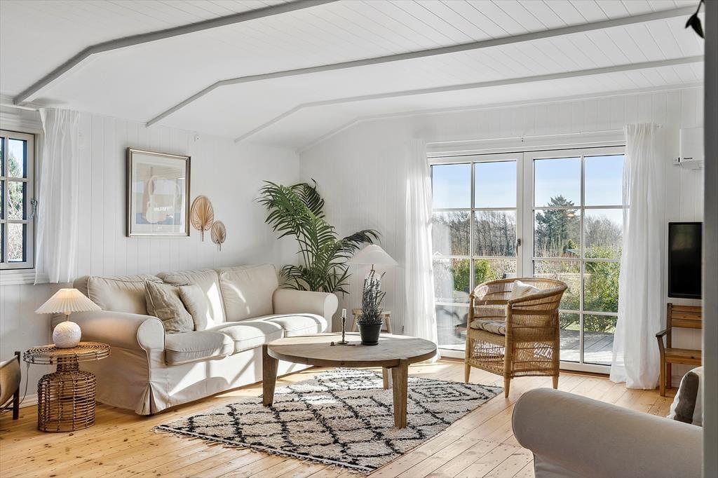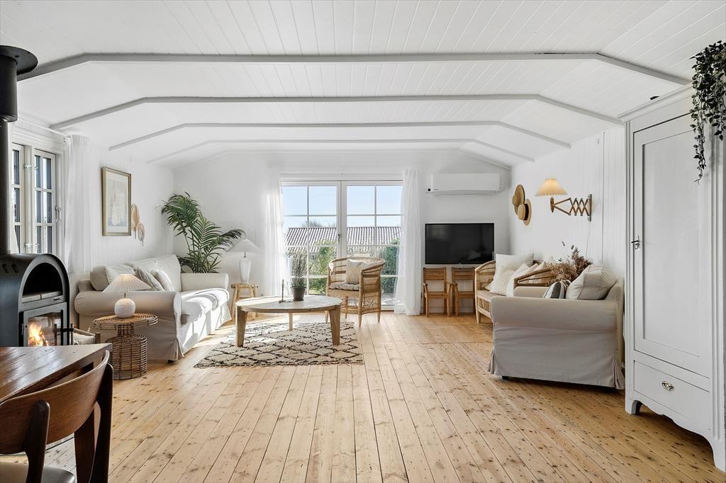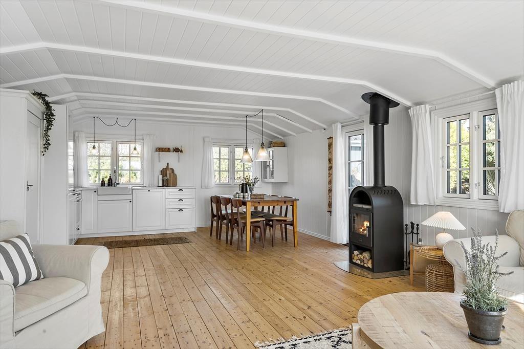 Som du træder ind i sommerhuset, mødes du af et lyst og åbent rum, hvor stuen, spisepladsen og køkkenet glider naturligt sammen. Den lyse indretning giver en umiddelbar følelse af ro, og når du sidder i sofaen og nyder varmen fra brændeovnen, er der kun én ting at gøre: slappe af. Huset er indrettet med komfort og hygge i fokus, så du kan nyde kvalitetstid med dine nærmeste, mens du kigger ud på den grønne have gennem de store vinduer. Den åbne atmosfære gør det nemt at være sammen, uanset om du laver mad, spiller spil eller bare slapper af. Efter en lang dag kan du trække dig tilbage til de indbydende soveværelser og få en god nats søvn, klar til nye oplevelser.