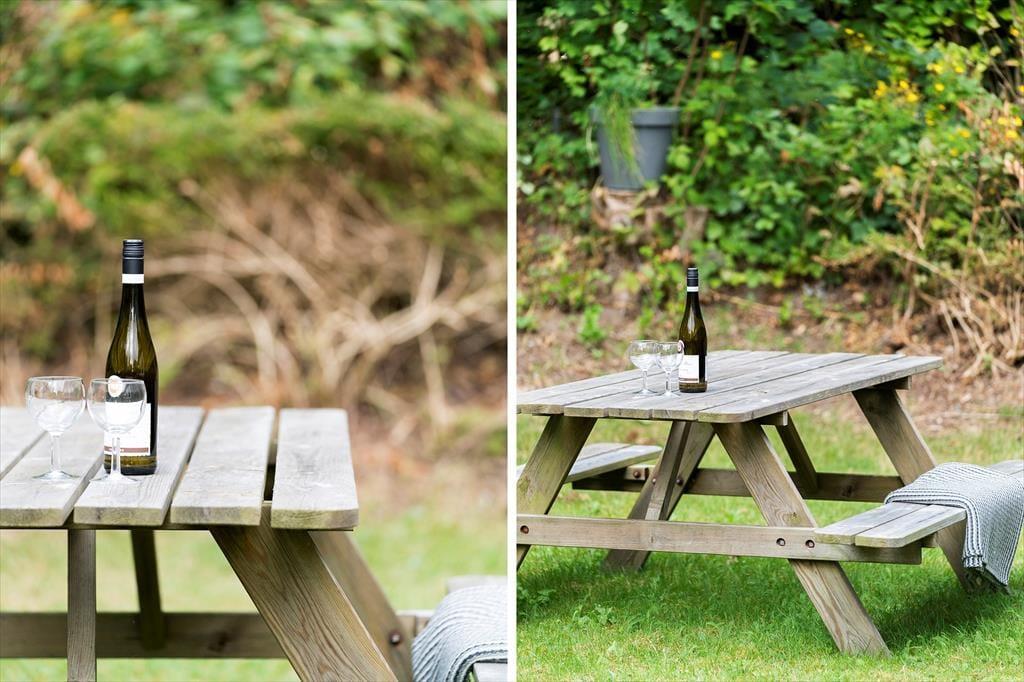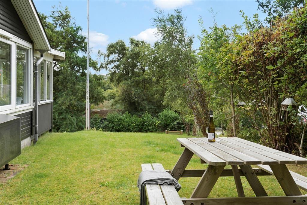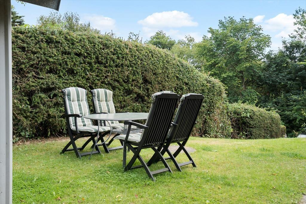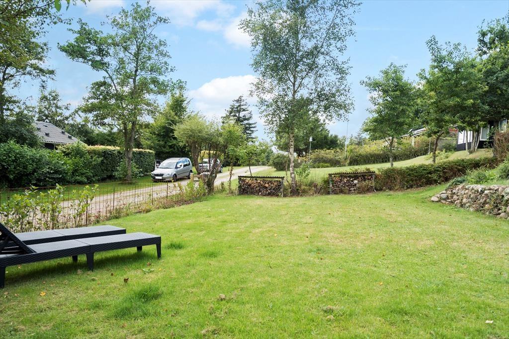 I forlængelse af stuen ligger en overdækket terrasse, der er afskærmet til flere sider, så her kan du slappe af i læfyldte omgivelser, mens du nyder solen og udsigten til haven. Her er godt at være, men det kan selvfølgelig også være, at du vil foretrække at rykke helt ud for at slænge dig i en liggestol i solen eller samles med dine kære ved havebordet til en lækker frokost under åben himmel. Grunden er kuperet, og der er både græsarealer og bede med stensætninger, så I har noget kønt at kigge på og har god plads til at lege.