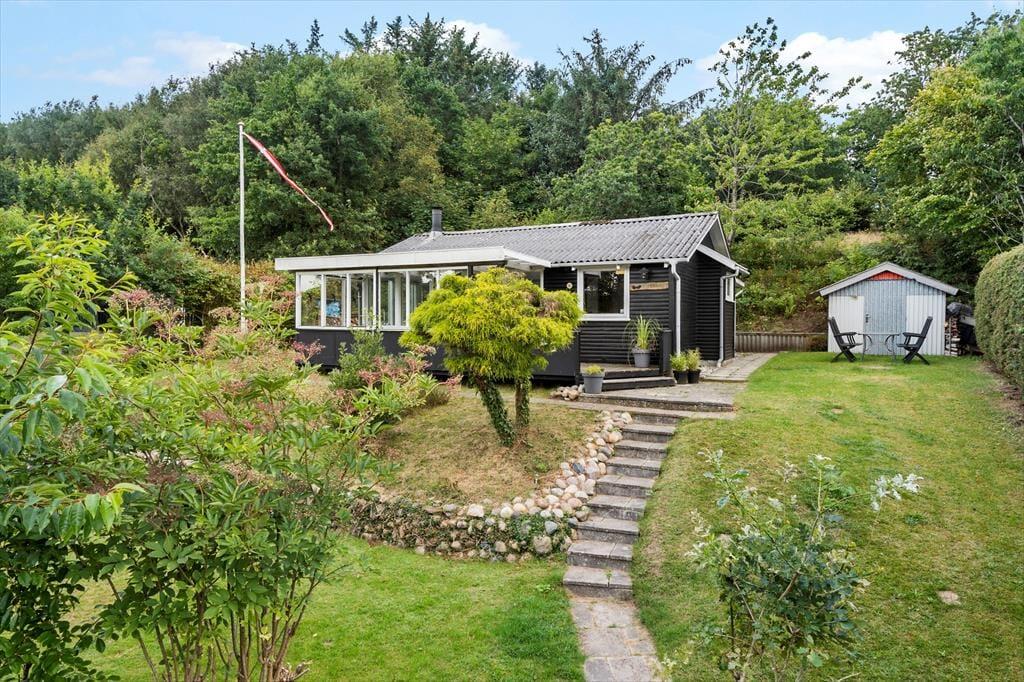 Stuens brændeovn, den overdækkede terrasse og den grønne beplantning på den kuperede grund – alt det og meget mere er med til at give dig en hyggelig og stemningsfuld ramme om ferielivet i dette sommerhus i Toftum Bjerge.