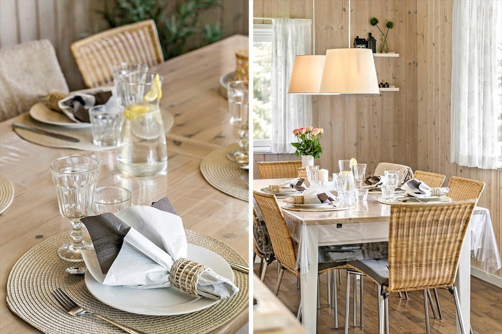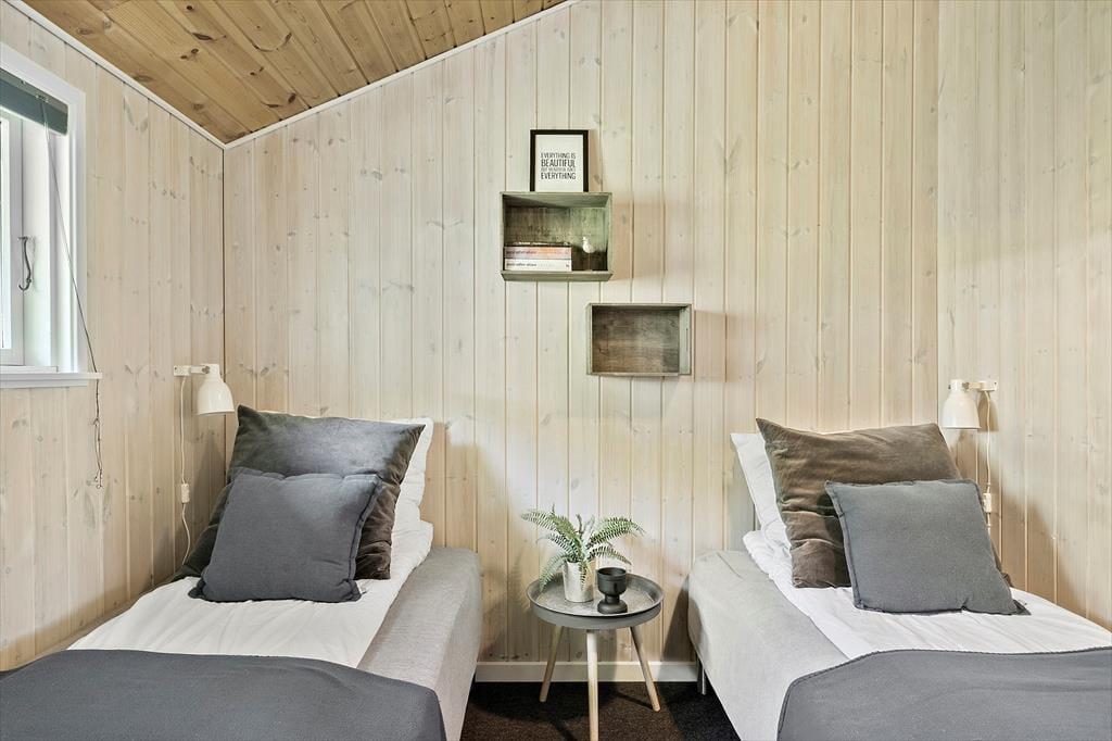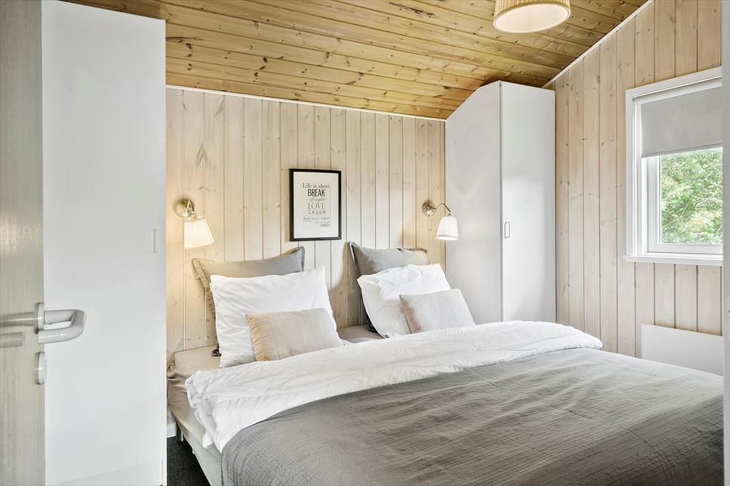 Fordelt på tre niveauer har I 100 m2 at brede jer på, så der er god plads til otte personer inden døre. Fire soveværelser er fordelt både oppe og nede, og der er også to badeværelser, hvilket er rart, hvis I er mange samlet i sommerhuset. Badeværelset i nederste niveau er stort og udstyret med et hjerteformet spabad og en sauna, så ferien kan byde på wellness og tilbagelænet afslapning. I øverste niveau ligger et veludstyret køkken-alrum med direkte adgang til en skøn terrasse, og en trappe fører ned til en opholdsstue med brændeovn, varmepumpe, tv og komfortable siddemøbler.
