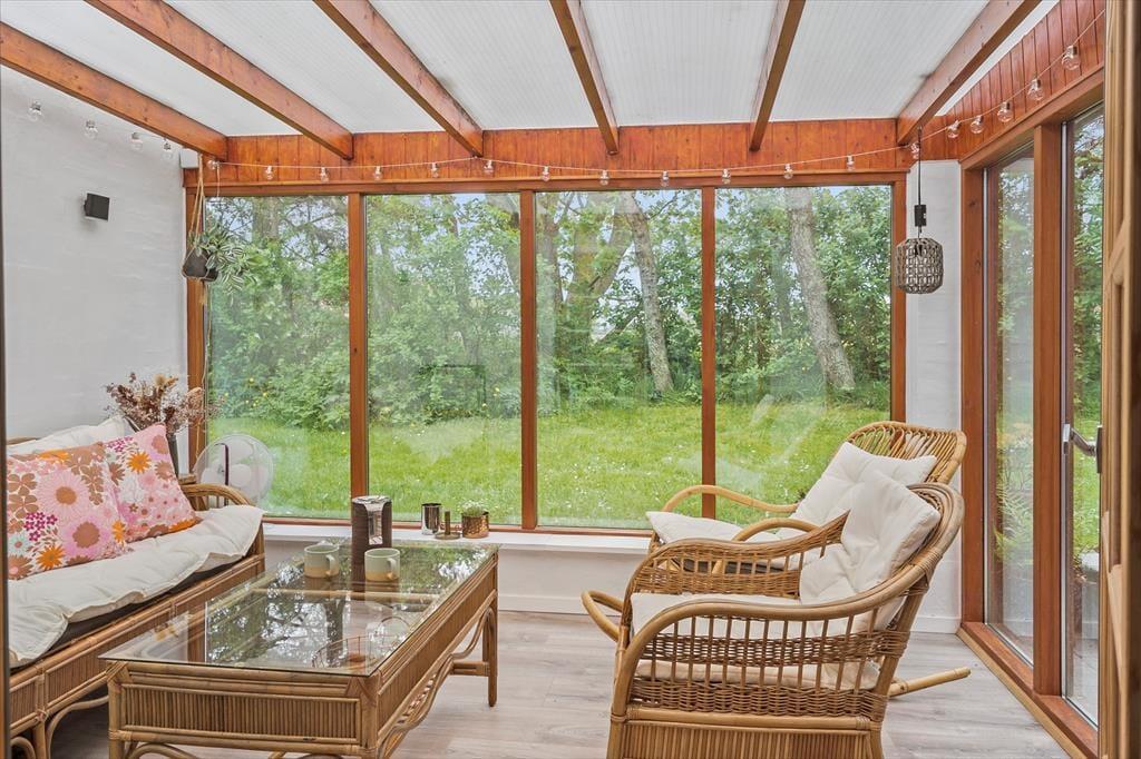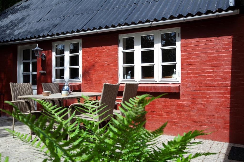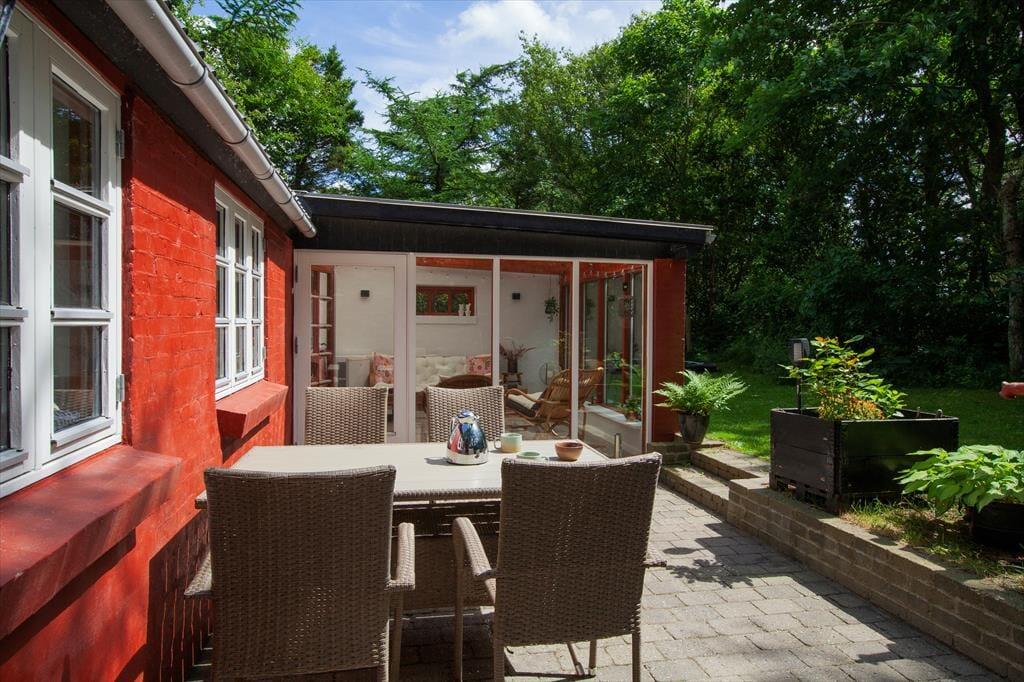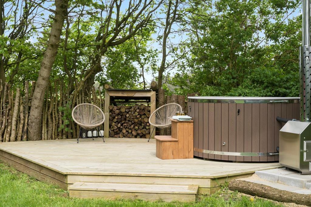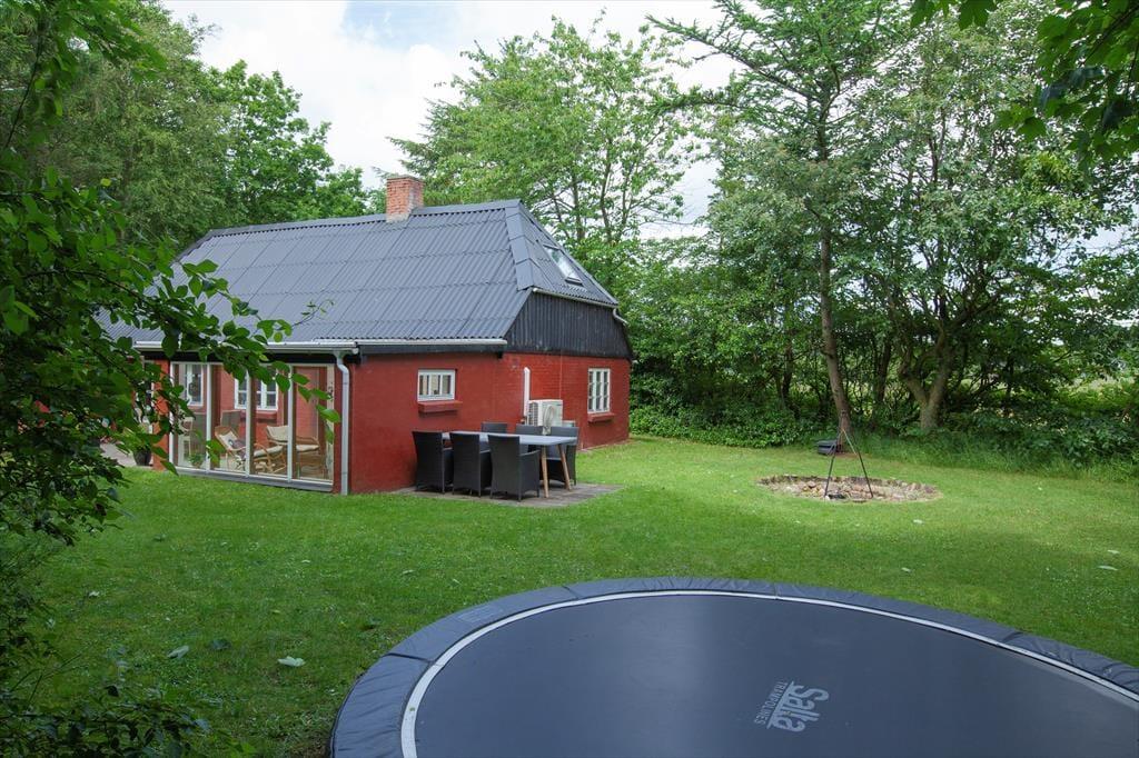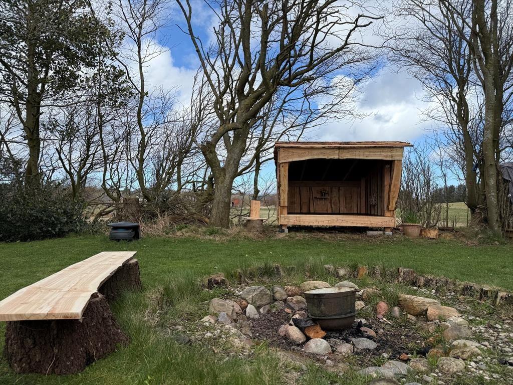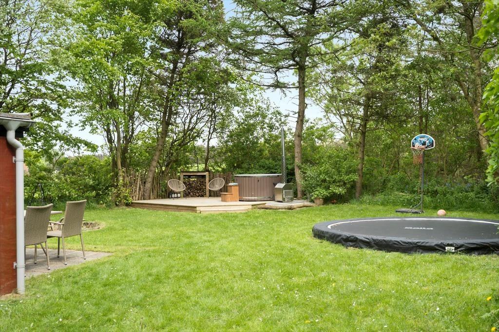 Sommerhusets udestue er et skønt opholdssted, hvis du vil have udsigt til den grønne have – men når vejret er lunt og sommerligt, vil du måske hellere sidde helt ude i det fri. Her kan du lytte til fuglesang og vindens susen i granerne, mens du slapper fuldstændig af i solen på terrassen. På græsplænen er der god plads til leg og boldspil, og med bålsted og trampolin er der flere hyggelige ting at tage sig til i de grønne omgivelser. Og takket være vildmarksbadet er det muligt at fylde eftermiddagen eller aftenen med varme bade og fuldendt livsnyderi, når dagens udflugter er ovre.