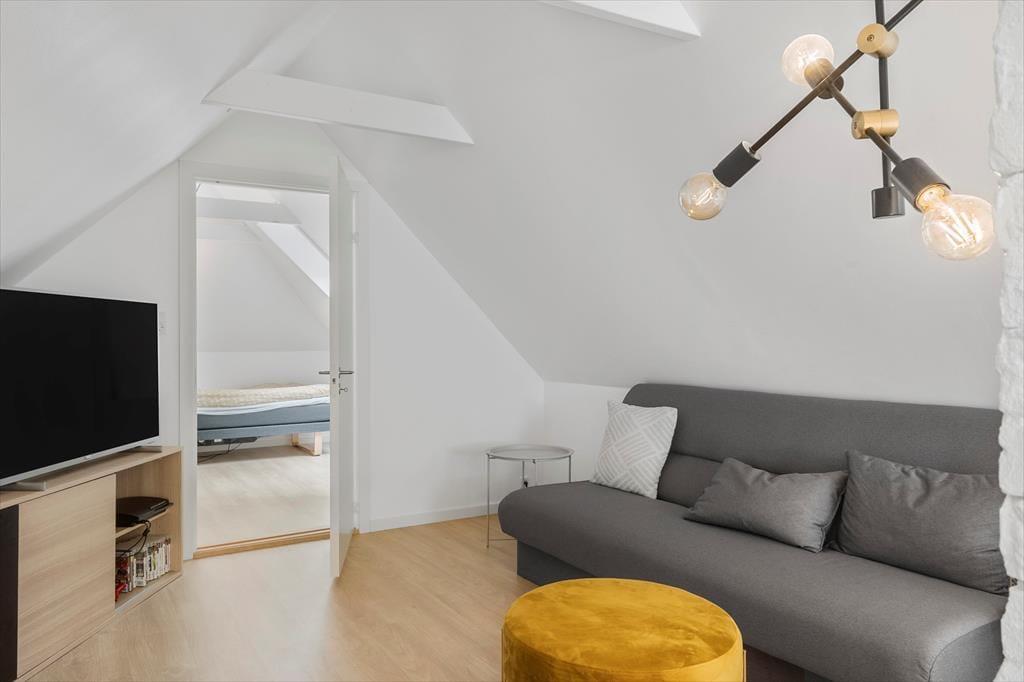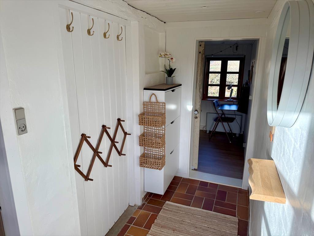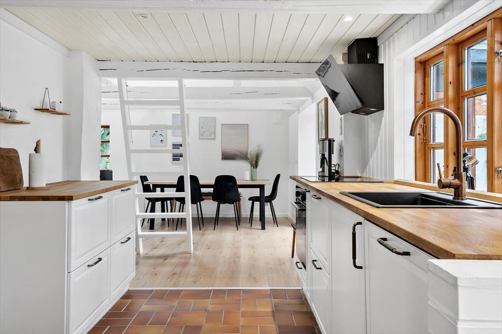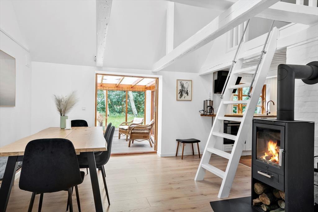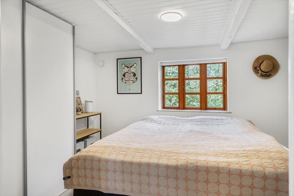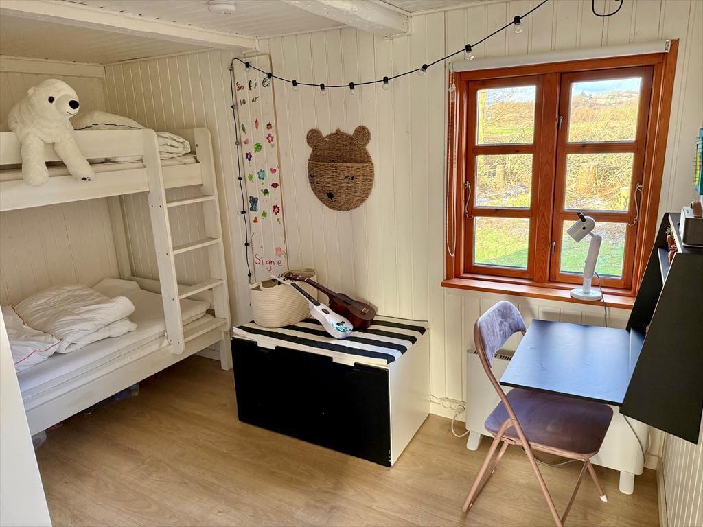 Husets historie går helt tilbage til 1877, så det har haft god tid til at fremelske sin særlige ånd og rare atmosfære. Samtidig har bondecharmen fået en opgradering, for huset blev renoveret i 2022, hvilket tydeligt fremgår af det flotte køkken, det moderne interiør og de lyse farvetoner. En effektiv brændeovn er placeret i den velindrettede stue, og herfra går en stejl trappe op til den flot møblerede førstesal, der byder på et soverum og en ekstra hyggekrog med sofa og fladskærm. I stueplan finder du to soveværelser, og derfor er der i alt mulighed for at være seks personer i huset.