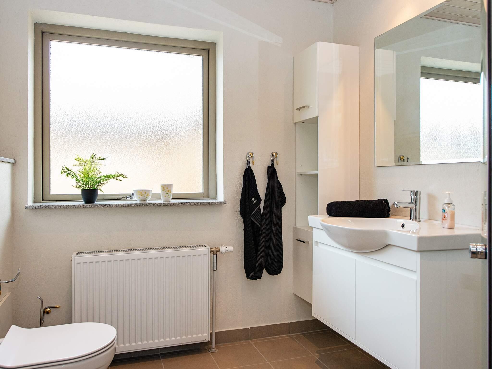 Badeværelse med bruser, badekar og toilet. Gæstebadeværelse med badekar og toilet.
