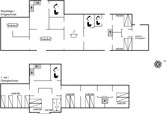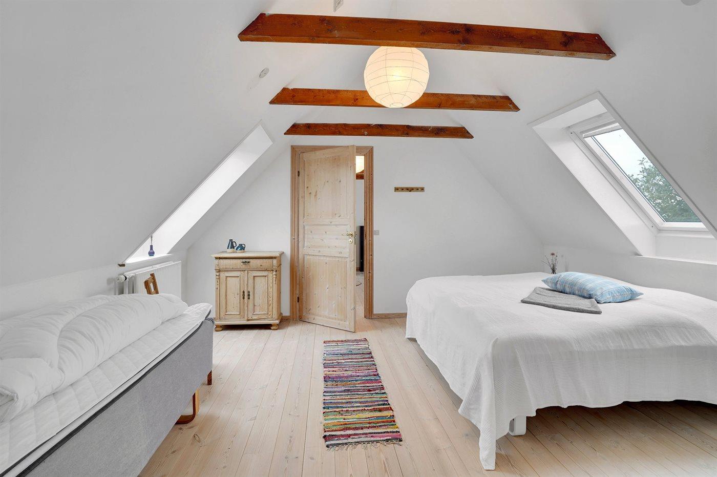 Der er i alt 7 soveværelser. Sovepladserne fordeler sig på: 12 sovepladser i dobbeltsenge. 4 sovepladser i enkeltsenge. 2 sovepladser i sovesofa (dobbelt). Derudover er der 1 stk. barneseng.