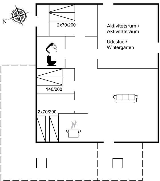Der er i alt 3 soveværelser. Sovepladserne fordeler sig på: 4 sovepladser i dobbeltsenge. 2 sovepladser i enkeltsenge. Derudover er der 1 stk. barneseng.