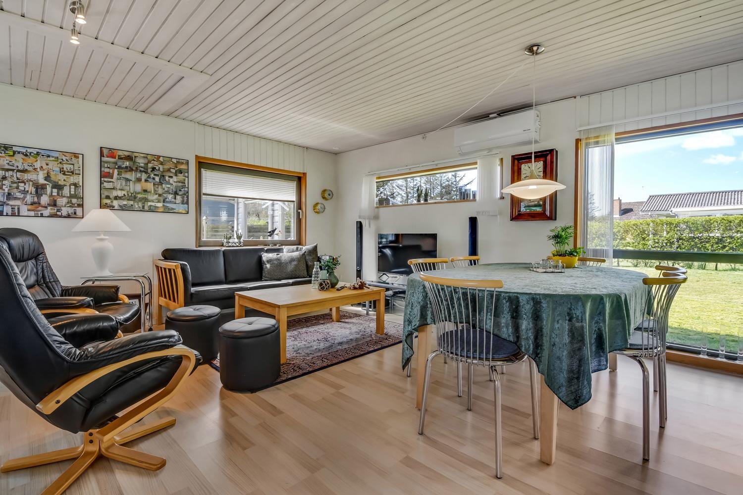 Huset er beliggende på en 771 m2 grund med indkørsel, hvor bilen kan holde tæt på hoveddøren og derudover er der en stor græsplæne rundt om huset. Fra udestuen er der udgang til en overdækket terrasse. Her er der en grill, havemøbler og solvogne, som kan flyttes efter behov. Terrassen kan også afskærmes med en udtræks-afskærmning, så man kan sidde i læ for vind og kraftig sol. Der er altså mulighed for at sidde ude i alt slags vejr.