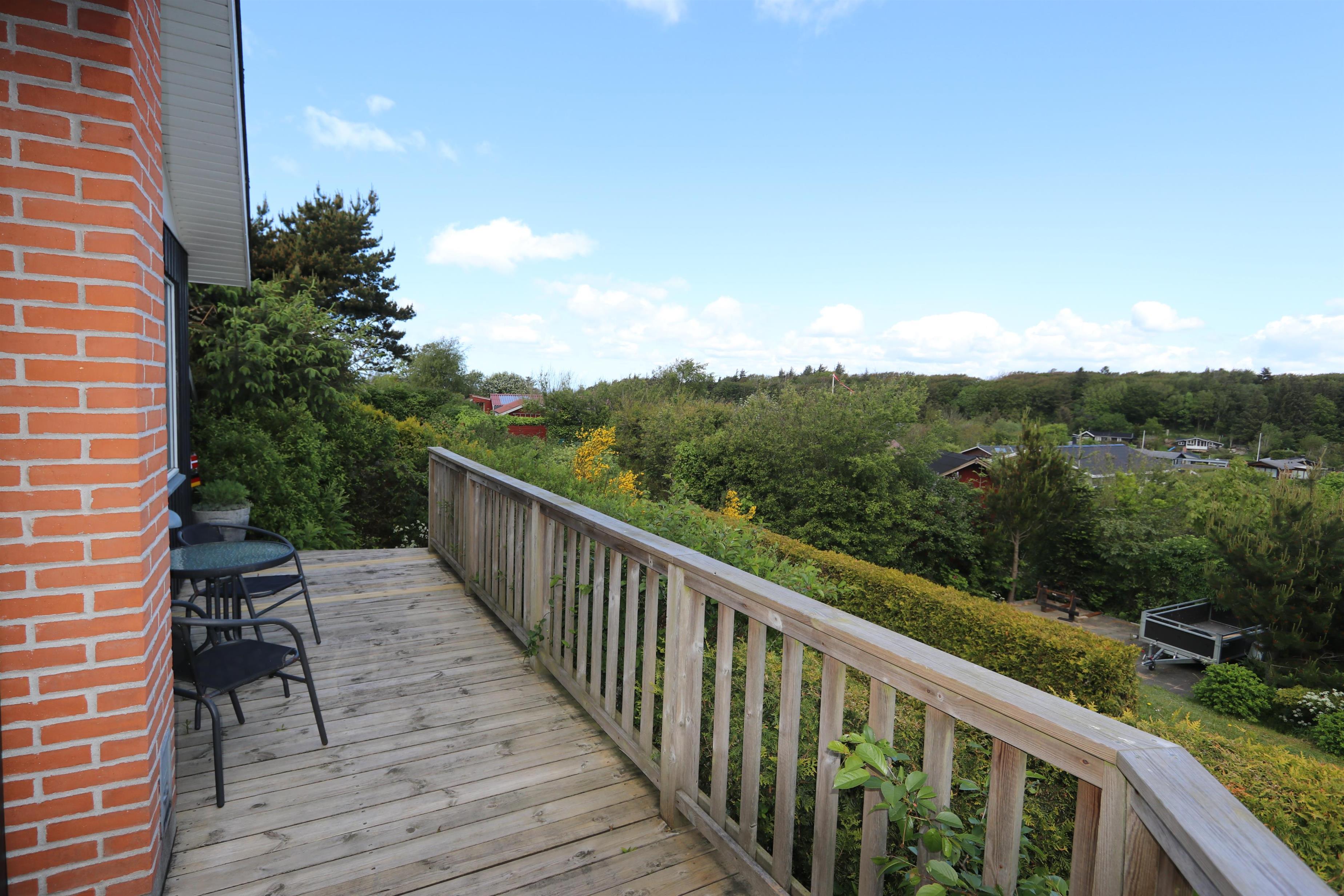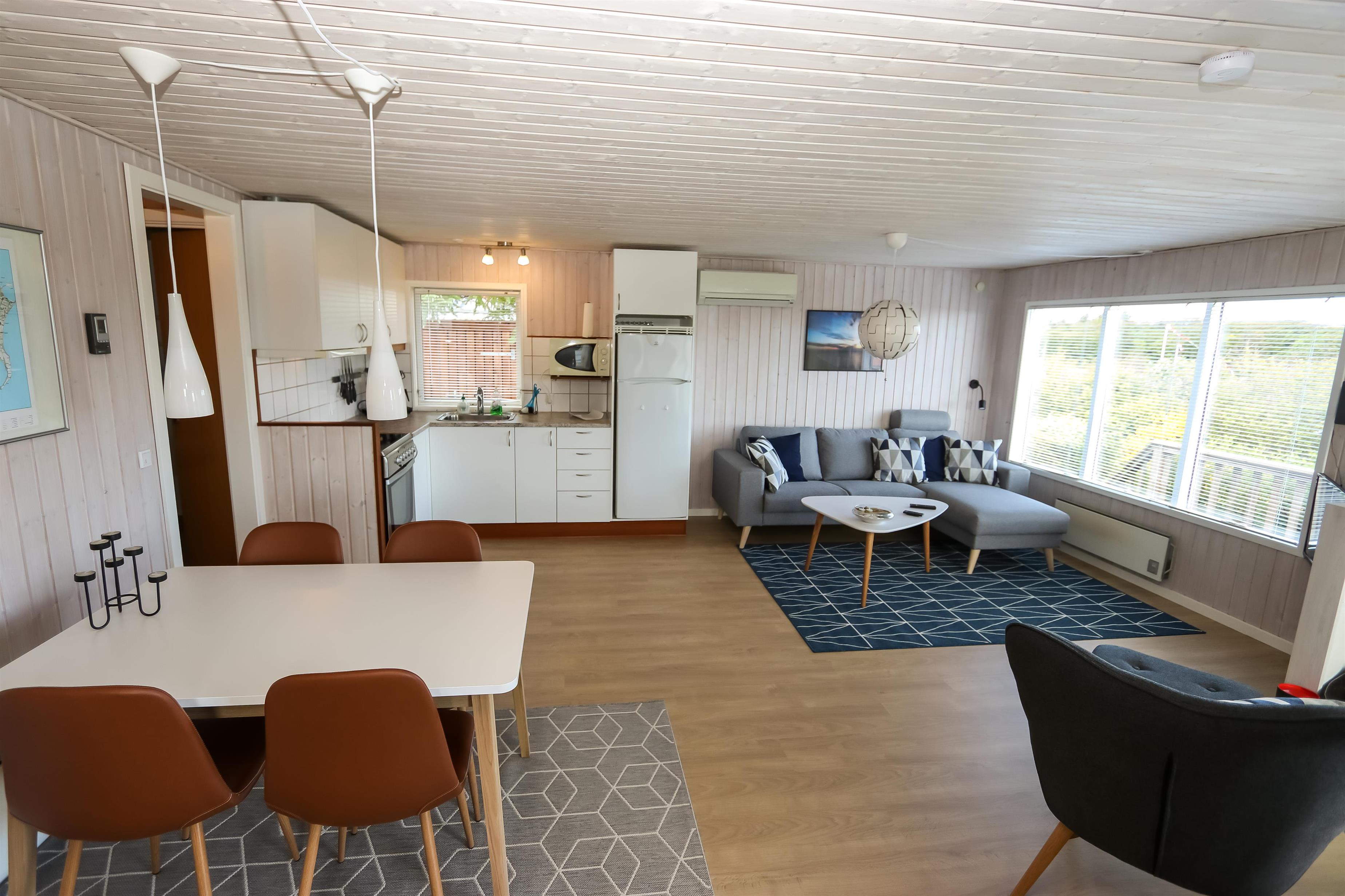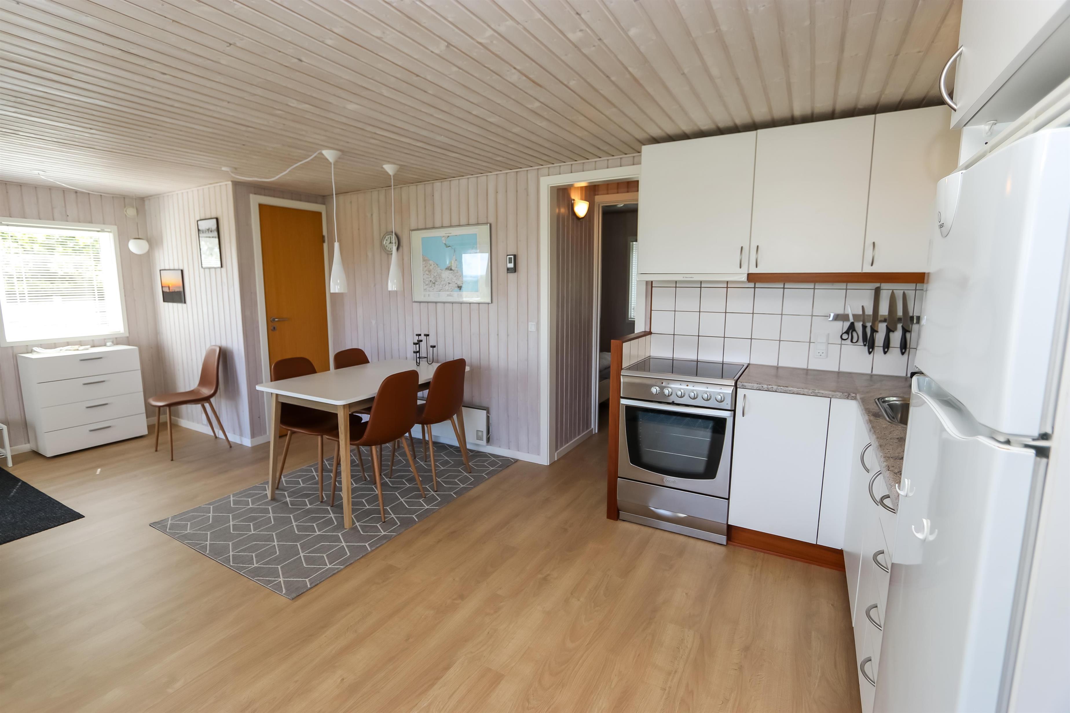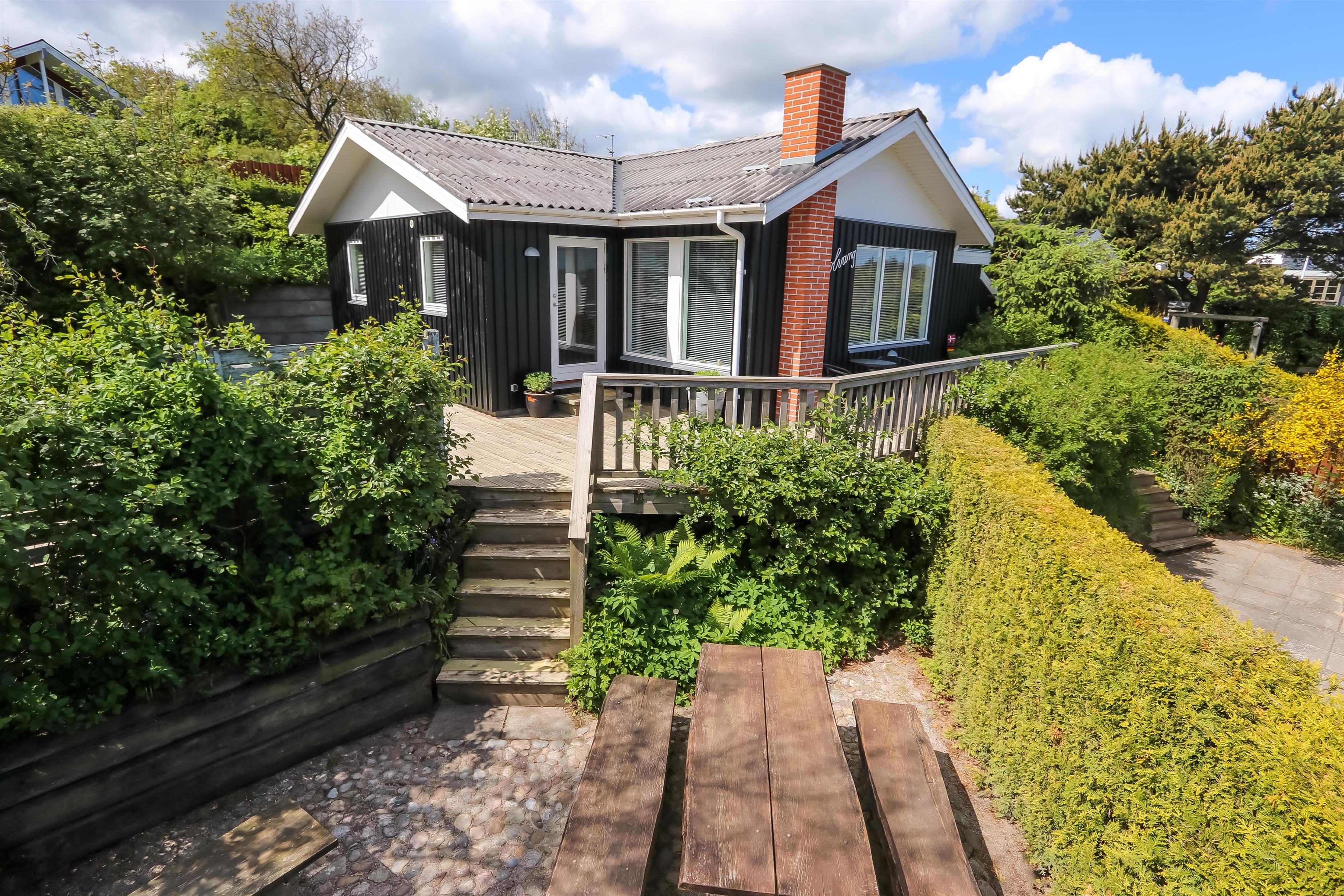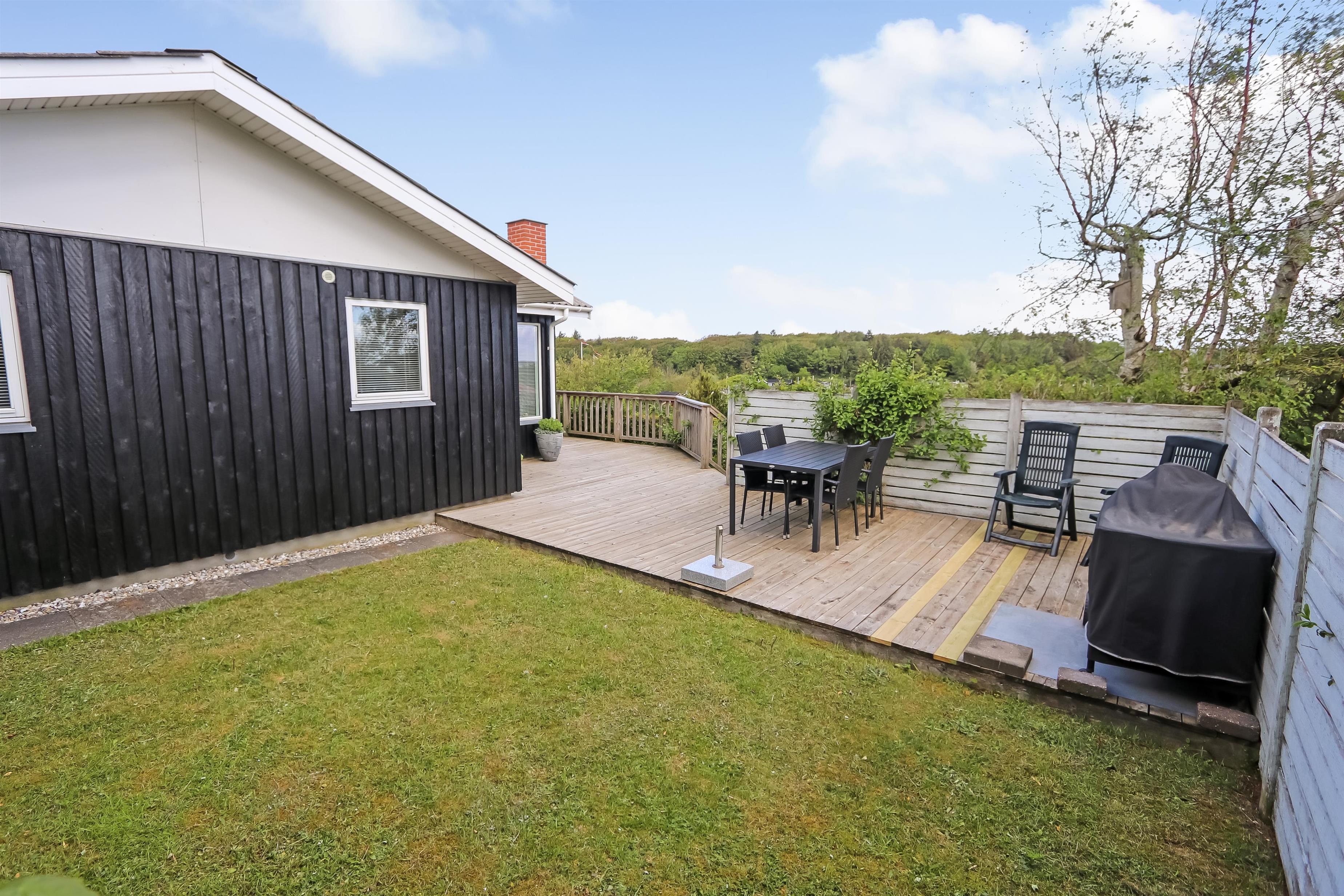 Lyst og pænt sommerhus, højt beliggende i roligt ferieområde ved Toftum Bjerge. Der er trappe op til huset. Sommerhuset er indrettet med kombineret køkken og stue. Køkkenet er pænt og indrettet med keramiskkomfur, emhætte, mikrobølgeovn, køleskab med frostboks. Stuen er lyst og pænt indrettet med trægulve og pæne komfortable møbler. Der TV med enkelte danske programmer og tilsluttet parabol med tyske og enkelte engelske kanaler. Der DVD-afspiller, stereoanlæg med CD-afspiller, Bluetooth højtaler og gratis trådløst internet til gæsterne rådighed. Til en kølig sommeraften eller en efterårsaften med regn og rusk er der brændeovn til at sprede hygge og varme. Der er desuden energivenlig varmepumpe i huset som også kan afkøle på varme sommerdage. Der er pænt badeværelse som er indrettet med toilet, håndvask, bruseniece, praktisk håndklædetørrer og behageligt gulvvarme. Huset er indrettet til fire personer, fordelt på to gode soveværelser. Et er indrettet med dobbeltseng og et med to enkeltsenge. Fra stuen er der adgang til husets store terrasser hvor i næsten altid kan finde læ. Der kan i tilberede og nyde aftensmaden på husets grill. På den lille terrasse er der indrettet hyggelig bålplads. Et dejligt sommerhus velegnet til familier som ønsker en rolig og afslappet ferie.