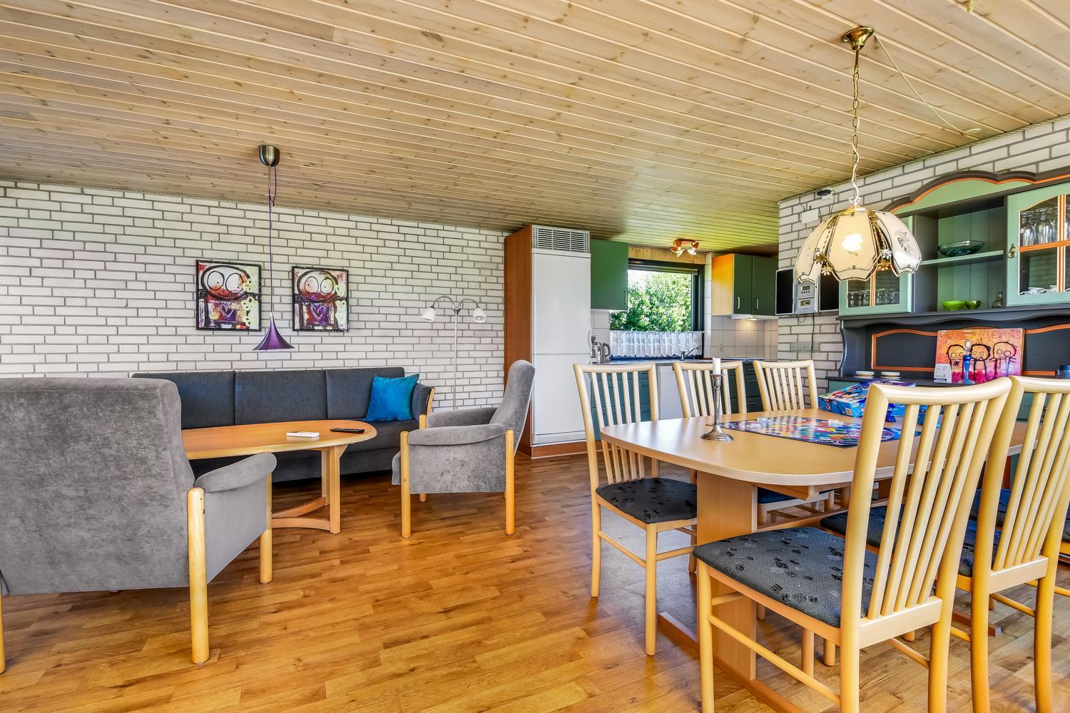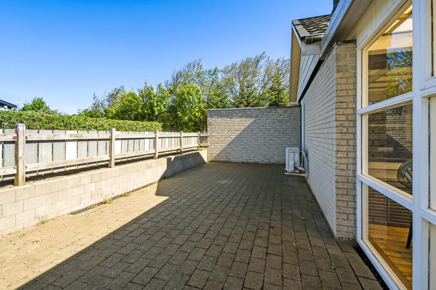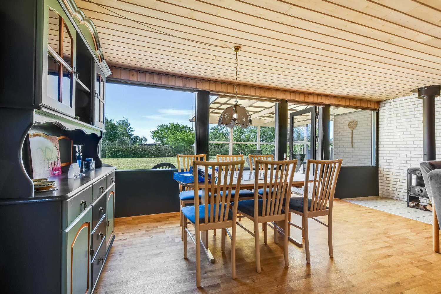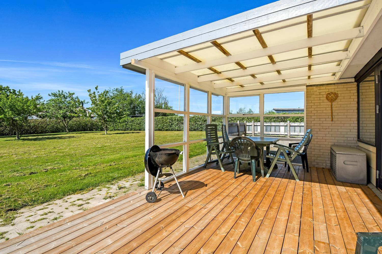 Fra stuen er der udgang til en stor delvis overdækket terrasse med massere af mulighed for en finde en plads i solen. Den store overdækket del udgør næsten en hel udestue og selv på gråvejsdage en det er dejligt sted at opholde sig. Der er grill, solvogne og havemøbler Stor åben, velholdt grund med massere af mulighed for boldspil og andre sjove aktiviteter. Efter en gåtur på ca. 600 m nåes Limfjorden. Det rolige og lave vand virker beroligende på alle og der er mulighed for en dejlig gåtur eller måske en lille dukkert i det rolig vand. Et hus til en god pris som er nemt at overskue og perfekt til parret eller den mindre familie.