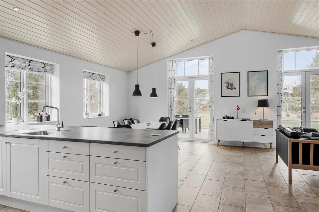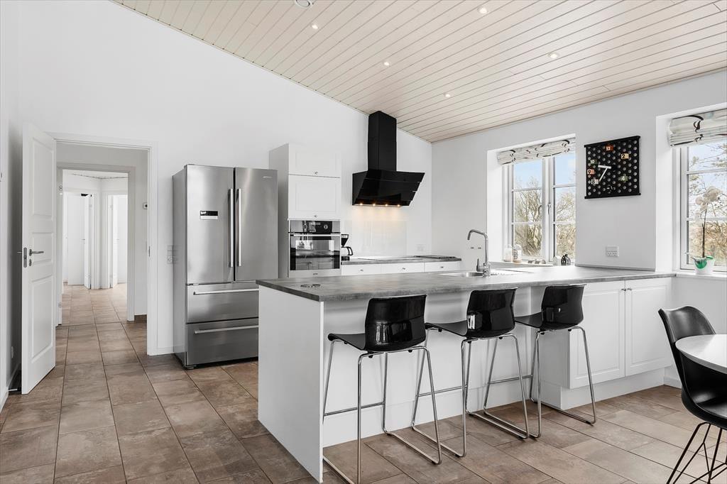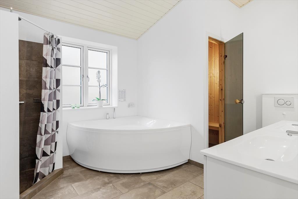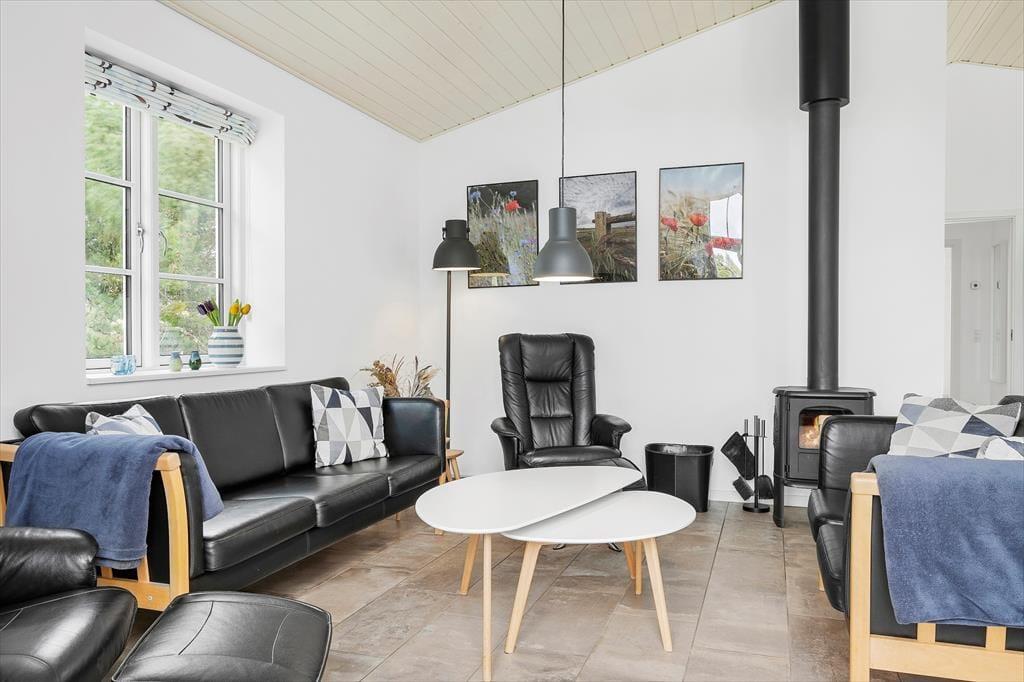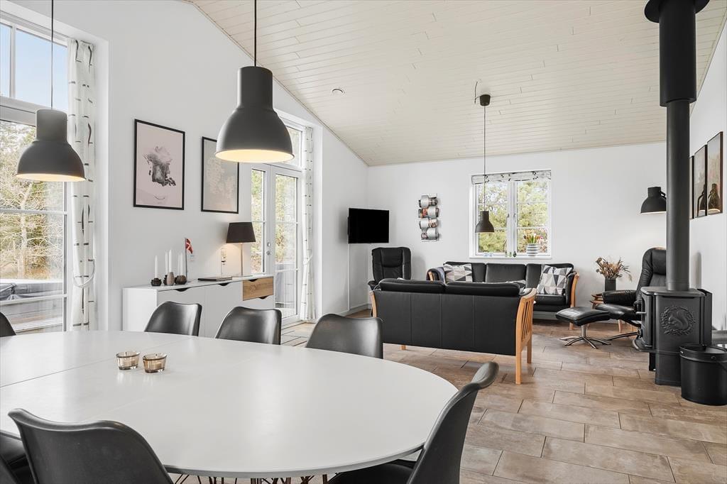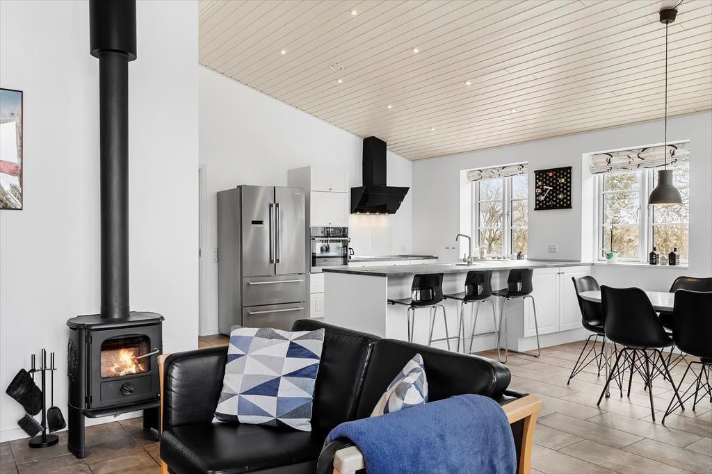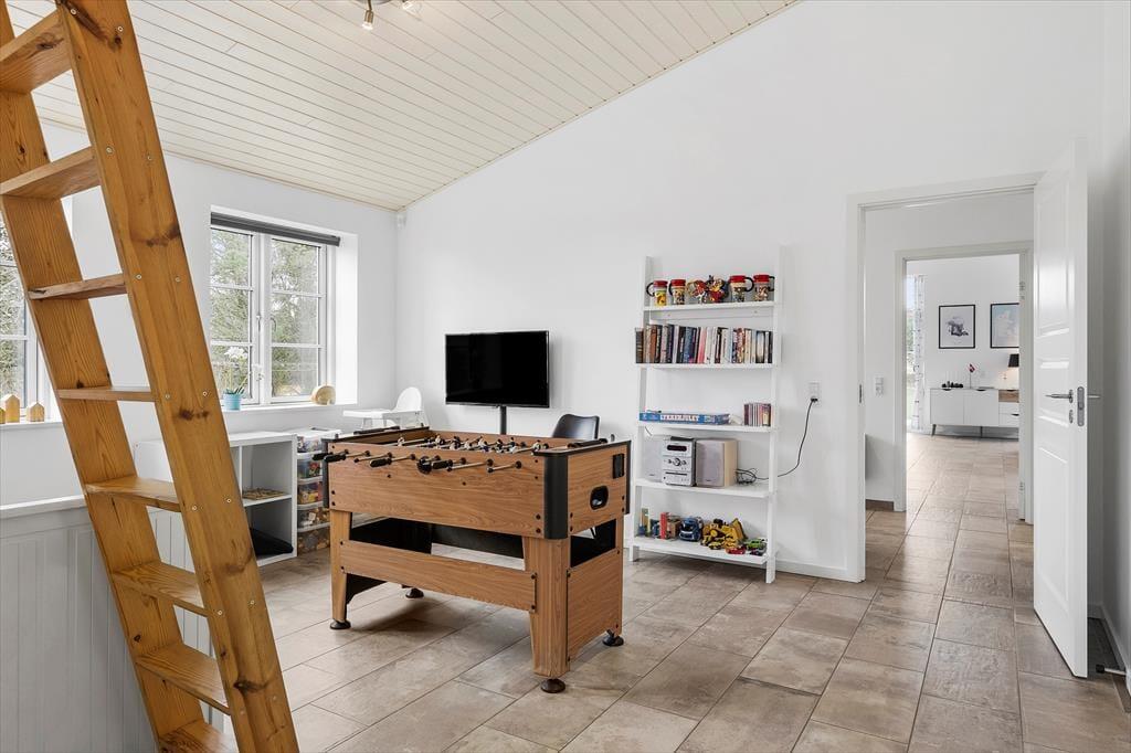 Sommerhuset er et gedigent murstensbyggeri fra 2017 på hele 146 m2, så rammen om ferielivet er både moderne og rummelig. Alle rum er lyse og indbydende – også entréen og de to badeværelser, hvoraf det ene er udstyret med både sauna og spabad. Husets store, højloftede opholdsrum er et skønt sted at samles, for her kan I hygge jer med at lave mad i køkkenafdelingen, spille brætspil ved spisebordet og flade ud i sofakrogen nær brændeovnen. De sociale stunder kan alternativt foregå i aktivitetsrummet, der er udstyret med både bordfodbold og PlayStation 3, så her kan store og små lege og game til den store guldmedalje. I rummet står også en dobbelt sovesofa, som er et godt supplement til sengepladserne på de tre soveværelser og på hemsen.