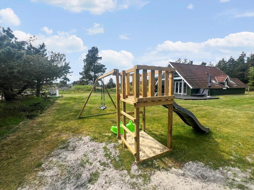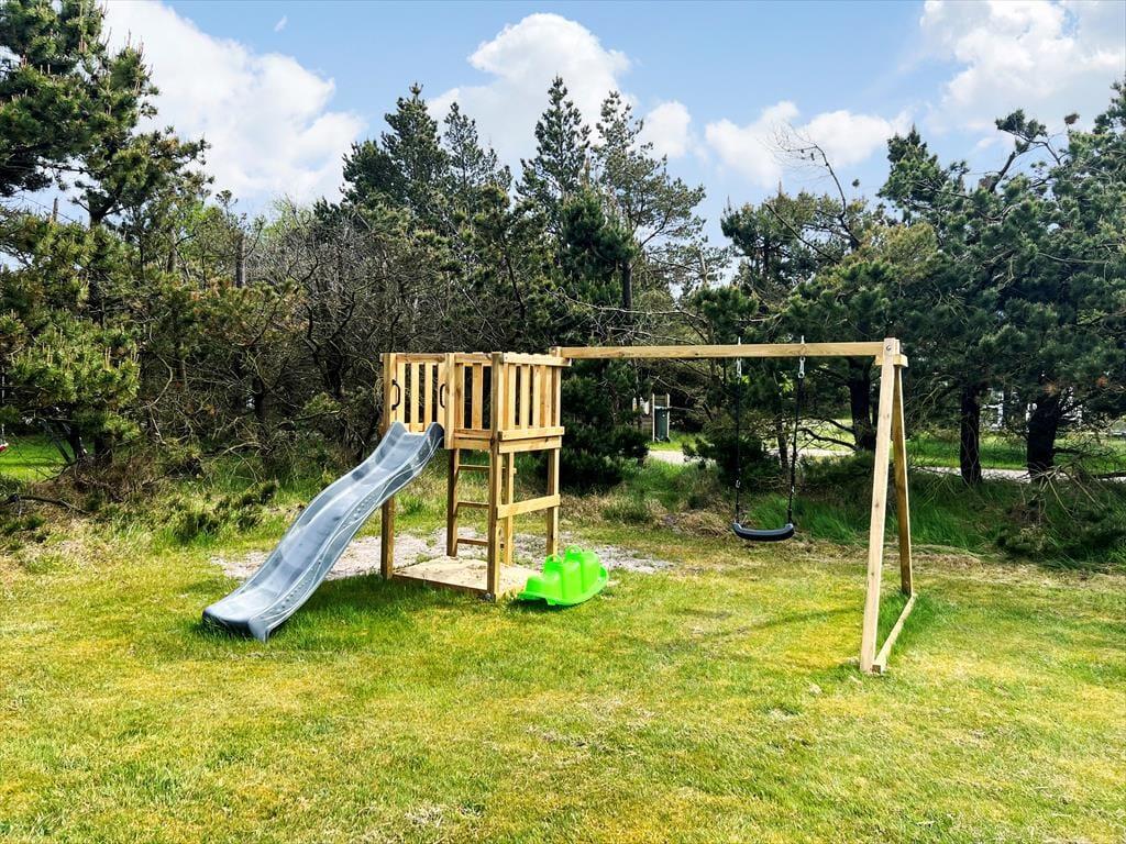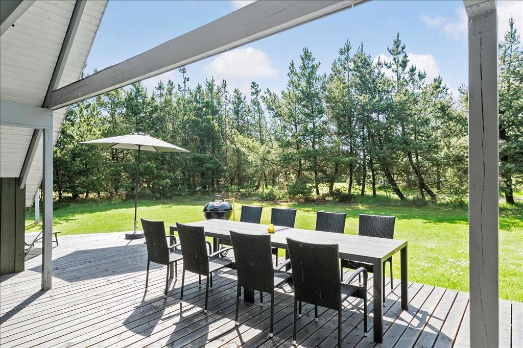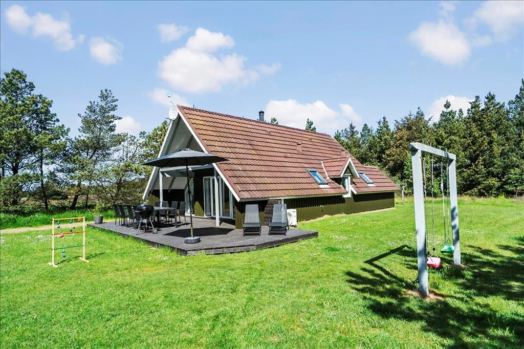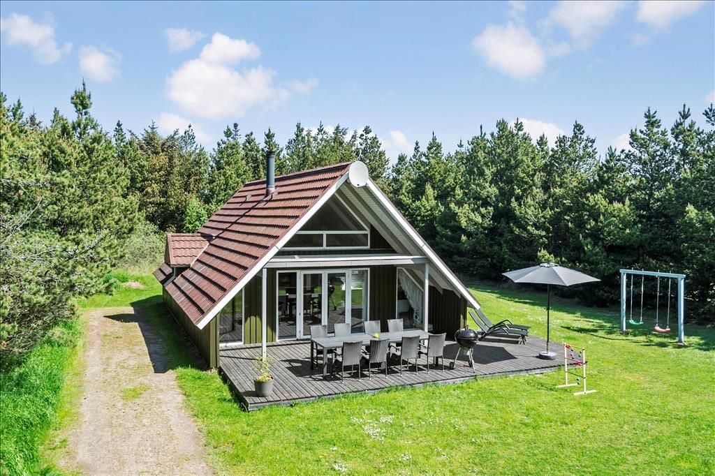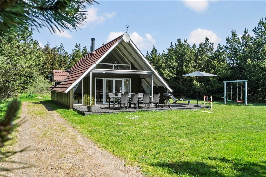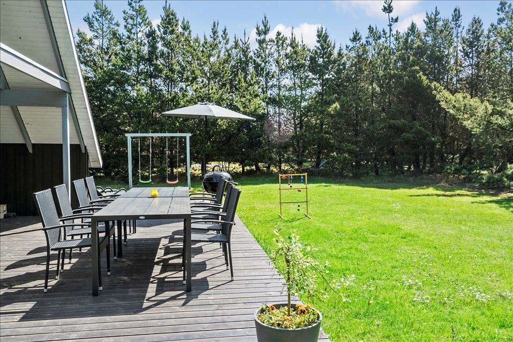 Ferieboligen er placeret på en 1500 m2 stor naturgrund, der omkranses af fyrretræer til alle sider. Derfor kommer udelivet til at foregå helt ugeneret, uanset om I soler jer på den sydvendte, delvist overdækkede terrasse eller spiller fodbold, gynger og slår kolbøtter på græsplænen.