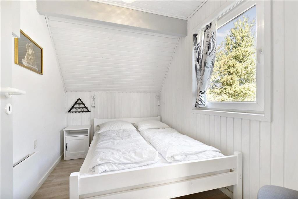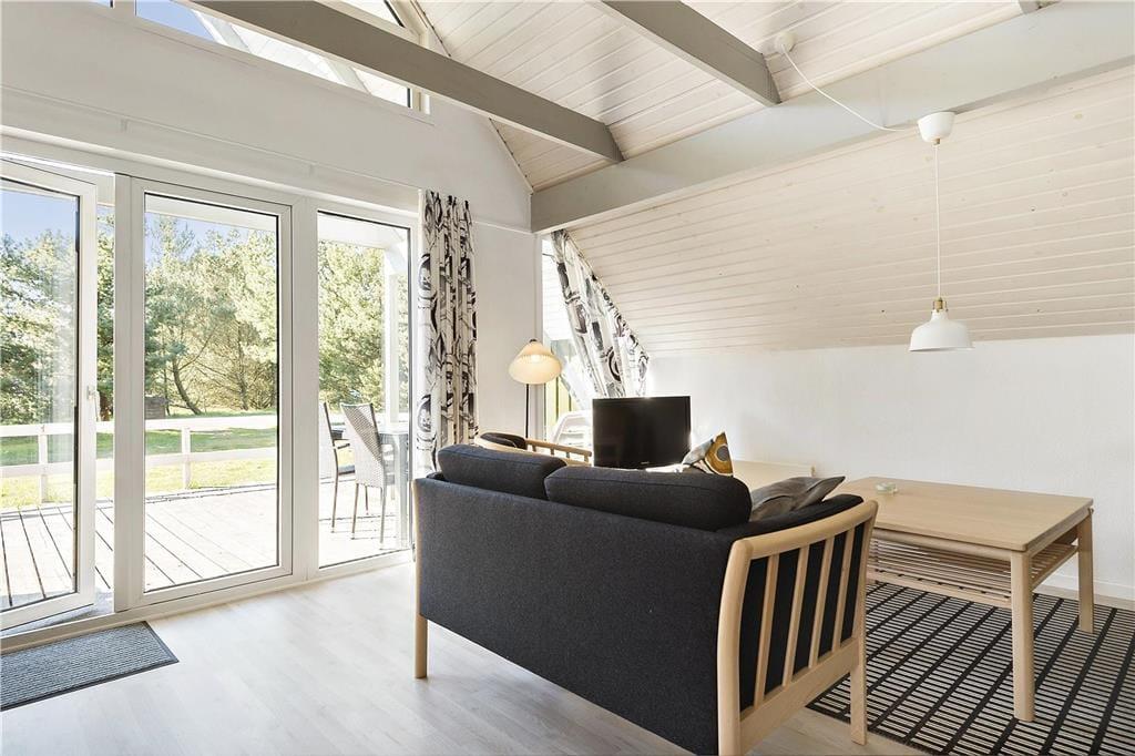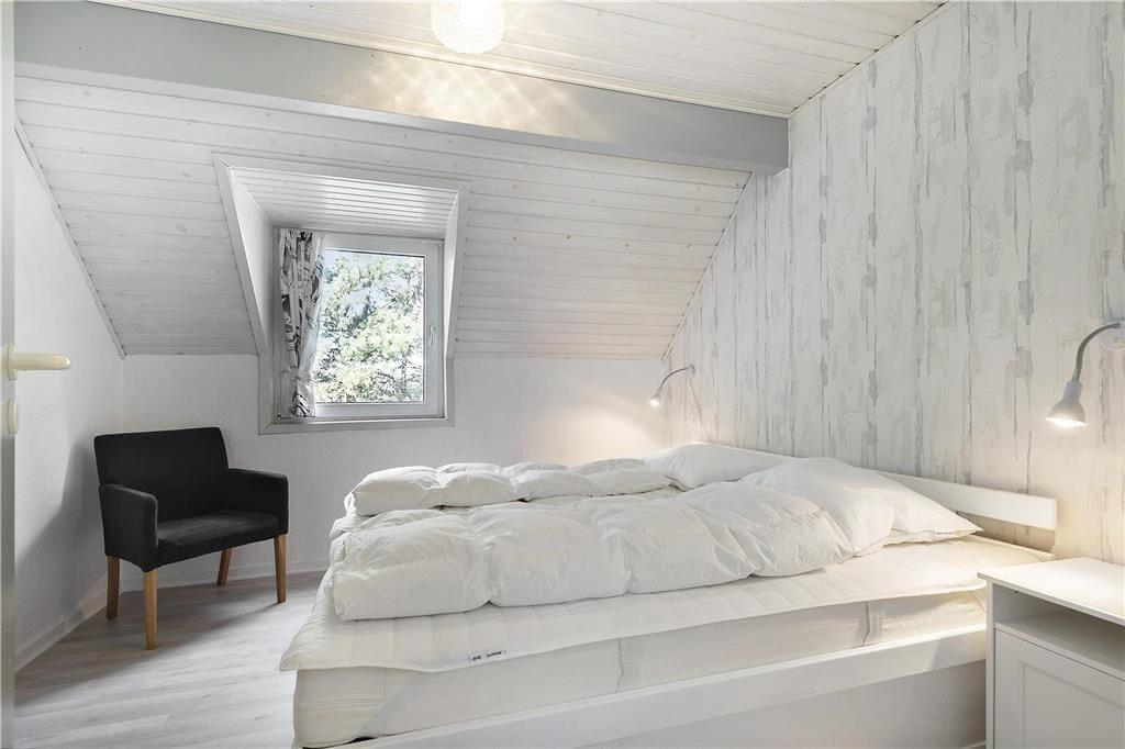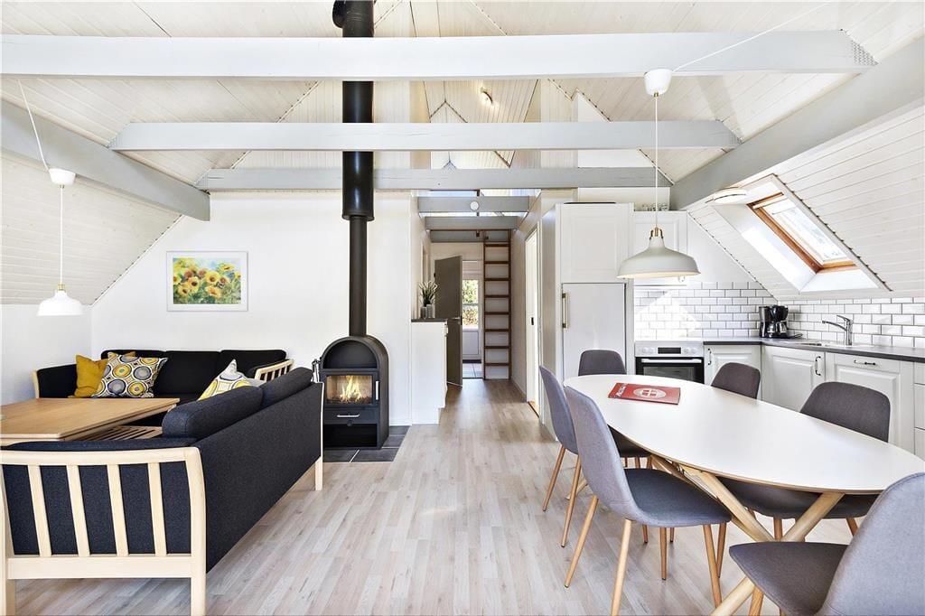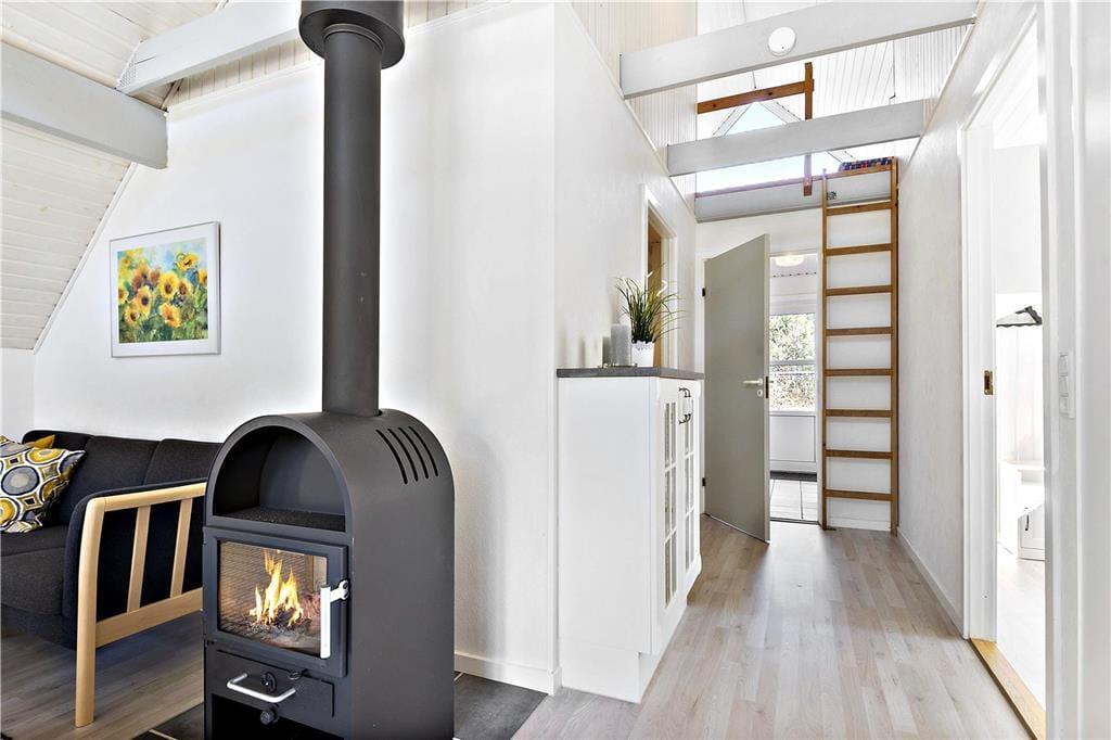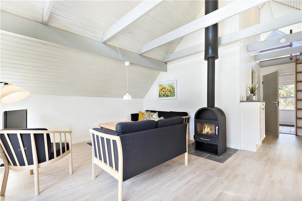 Da sommerhuset blev moderniseret i 2019, gik man grundigt til værks, hvilket især er tydeligt i opholdsrummet, som præsenterer sig på indbydende vis. Det lyse og højloftede rum er indrettet med brændeovn og stilfuldt møblement, og I kan blandt andet glæde jer til det flotte, åbne køkken, hvor I nemt kan stå flere og kræse for madlavningen. Afslapningsstunderne kan foregå i sofaafdelingen – eller alternativt på badeværelset, for her er der nemlig installeret en dejlig sauna. Når det er sengetid, kan I fordele jer på husets tre soveværelser, som alle er indrettet med gode dobbeltsenge. Sommerhusets hems byder desuden på to ekstra sovepladser, og det kan meget vel blive børnenes foretrukne hyggekrog.