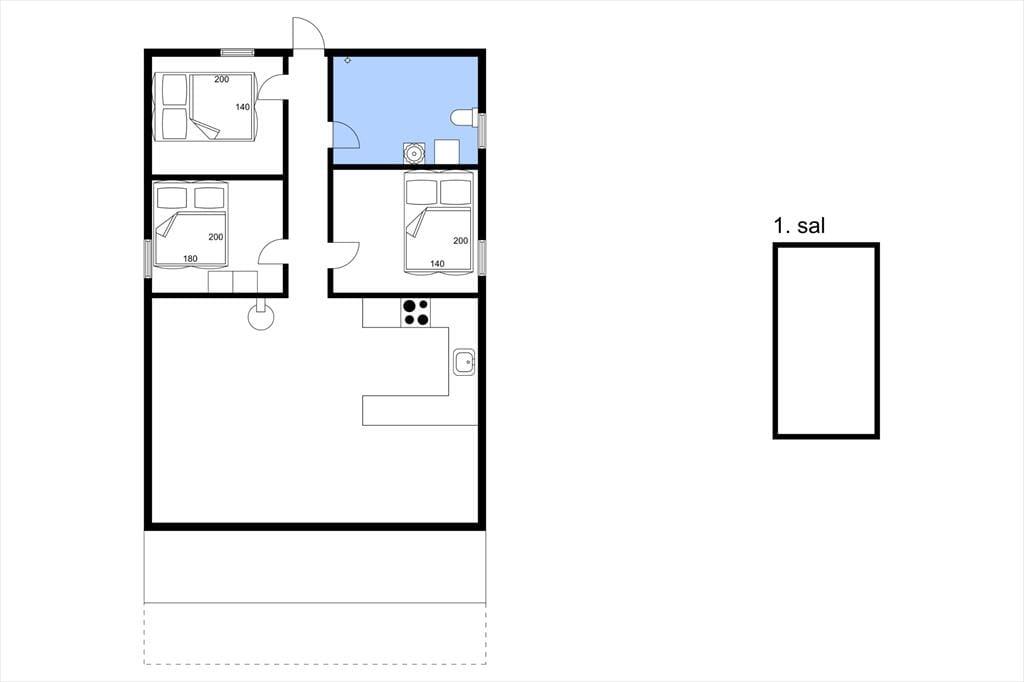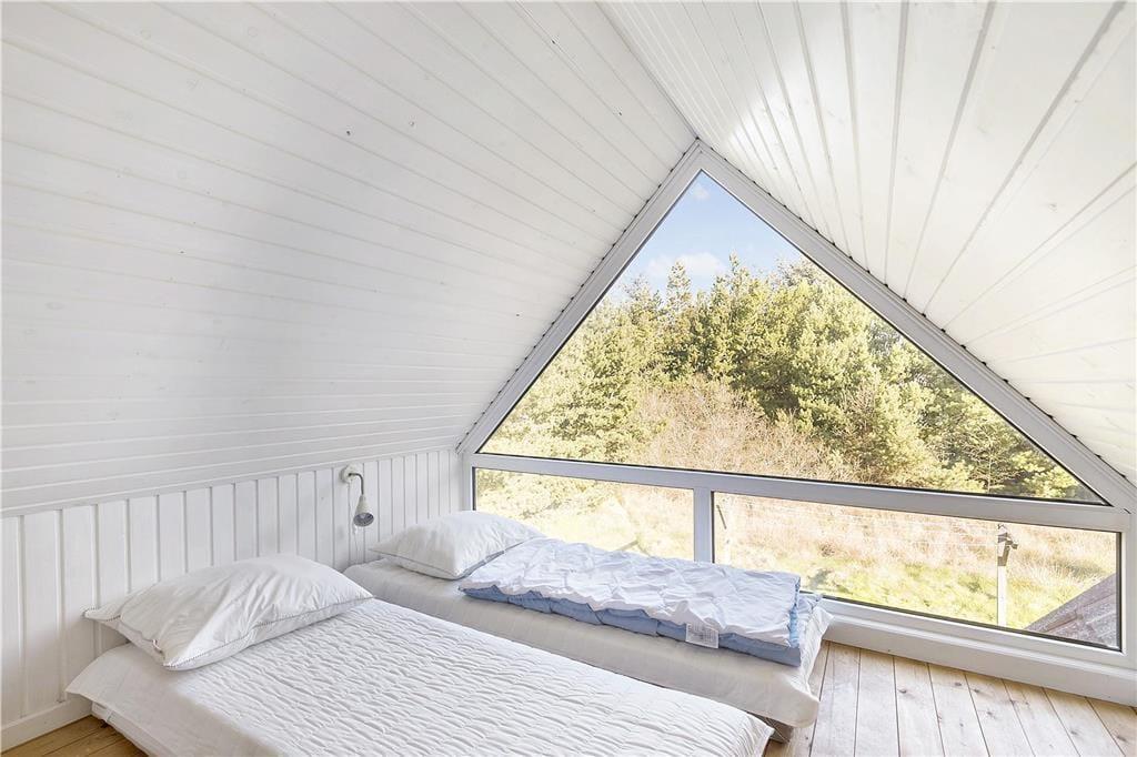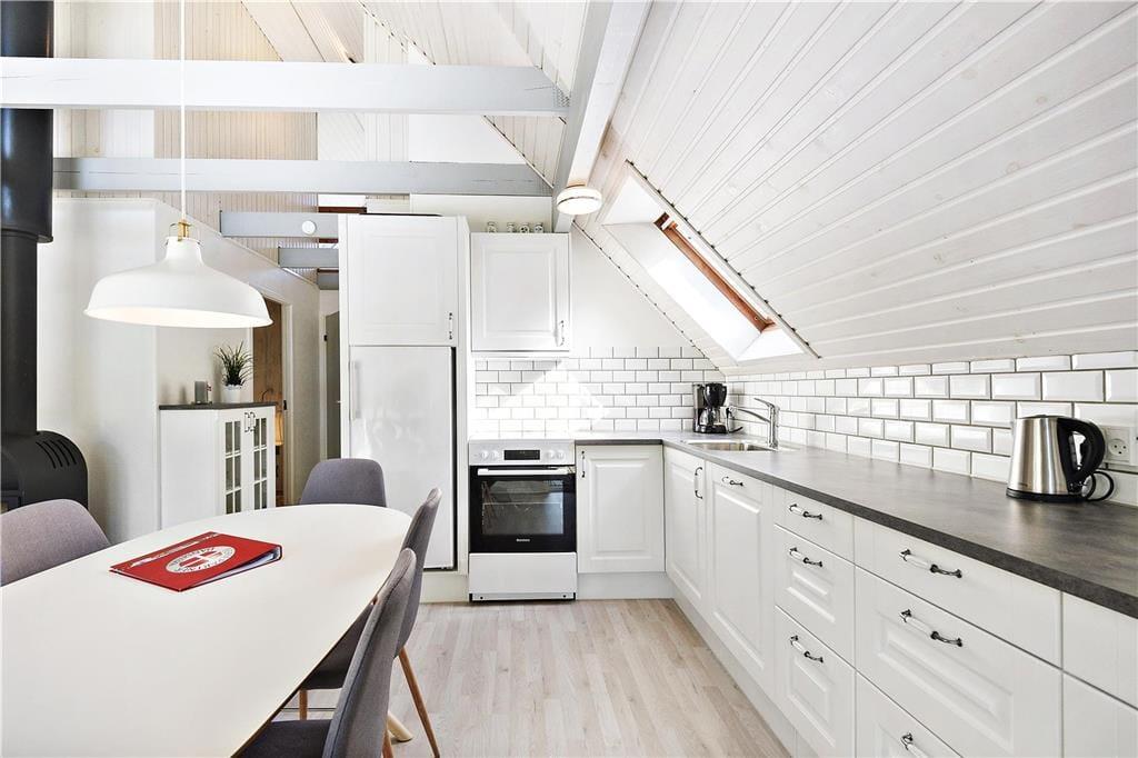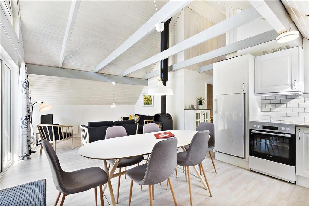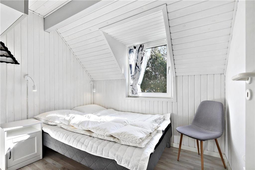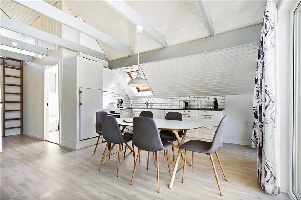 Da sommerhuset blev moderniseret i 2019, gik man grundigt til værks, hvilket især er tydeligt i opholdsrummet, som præsenterer sig på indbydende vis. Det lyse og højloftede rum er indrettet med brændeovn og stilfuldt møblement, og I kan blandt andet glæde jer til det flotte, åbne køkken, hvor I nemt kan stå flere og kræse for madlavningen. Afslapningsstunderne kan foregå i sofaafdelingen – eller alternativt på badeværelset, for her er der nemlig installeret en dejlig sauna. Når det er sengetid, kan I fordele jer på husets tre soveværelser, som alle er indrettet med gode dobbeltsenge. Sommerhusets hems byder desuden på to ekstra sovepladser, og det kan meget vel blive børnenes foretrukne hyggekrog.
