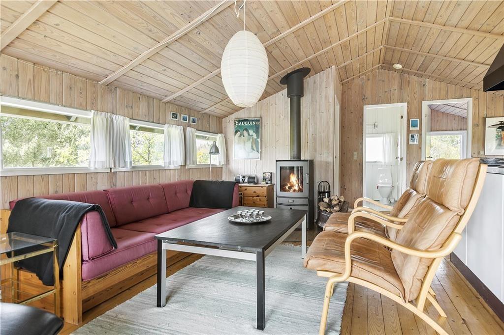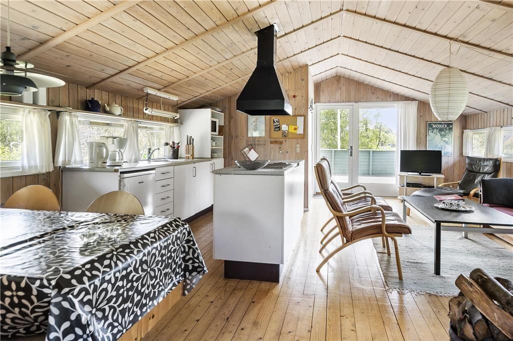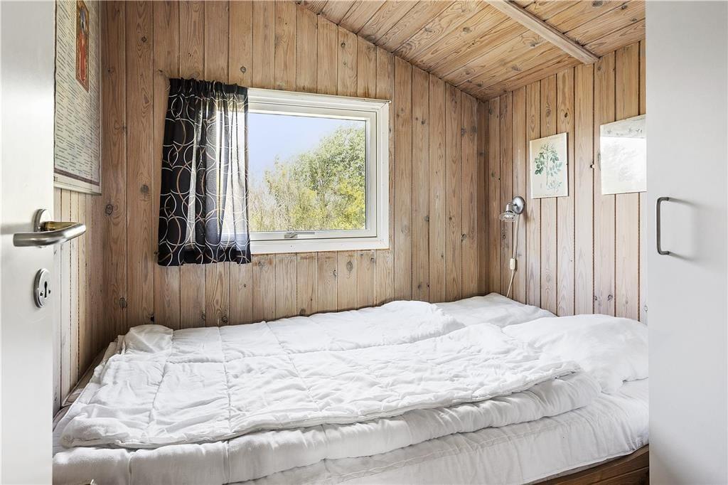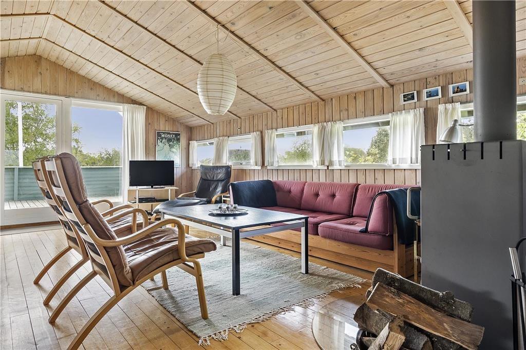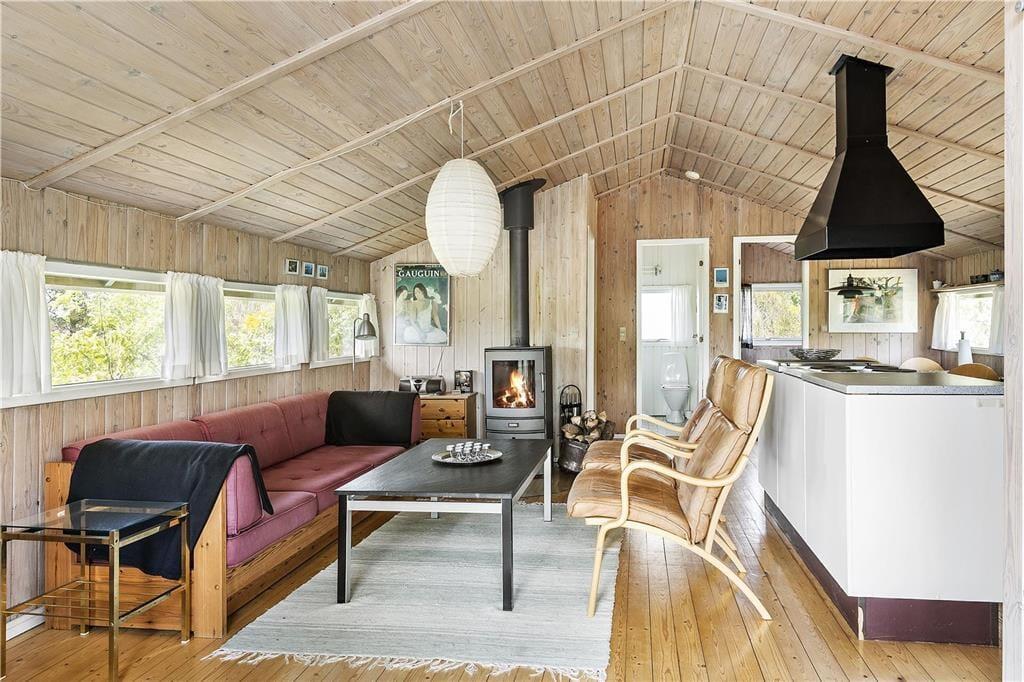 Sommerhuset er et kønt og klassisk eksemplar med lys træfacade, der passer fint ind i de naturskønne omgivelser. Inden døre er atmosfæren også helt i top, for her er der loft til kip og træbeklædte vægge, og de mange vinduer sørger for et fint lysindfald fra flere verdenshjørner. I opholdsrummet er et flot og veludstyret køkken integreret med stuen, så det er her, I kan kræse om madlavningen, spille brætspil, læse gode bøger nær brændeovnen og se film på fladskærmen. Nærmer feriedagen sig sin afslutning, kan I se frem til en god nats søvn på de tre soveværelser – efter I har rundet badeværelset for at børste tænder, selvfølgelig. Og når I ligger godt til rette under dynerne, kan I hygge jer med at tænke på, hvilke dejlige ferieaktiviteter og eventyr morgendagen vil bringe.
