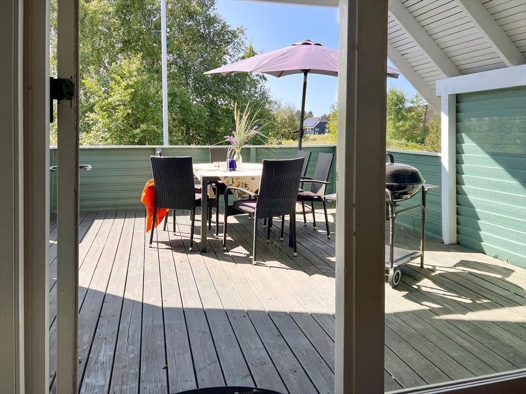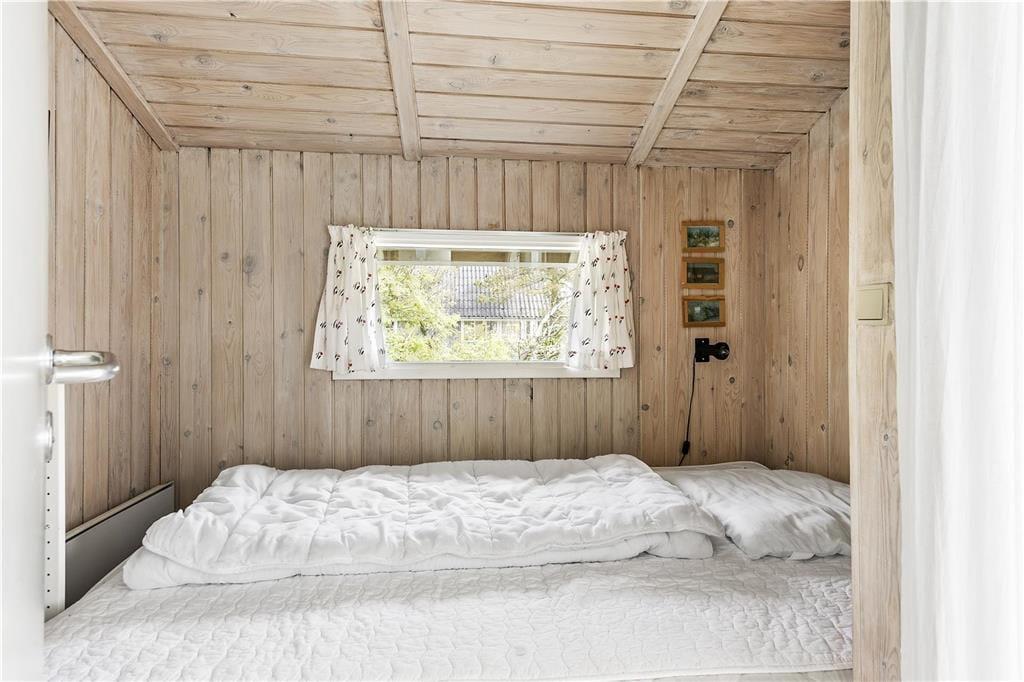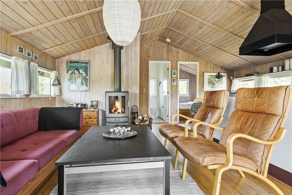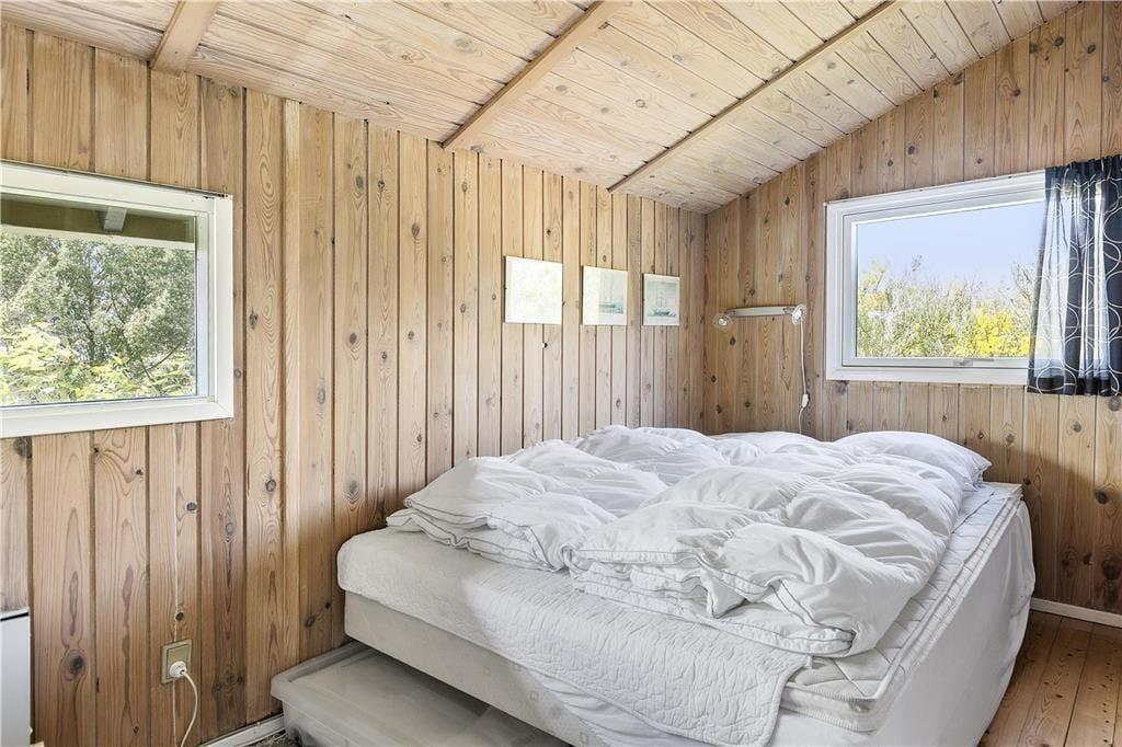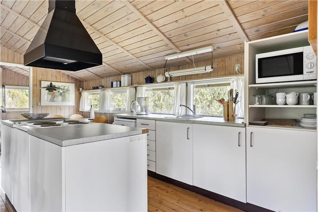 Sommerhuset er et kønt og klassisk eksemplar med lys træfacade, der passer fint ind i de naturskønne omgivelser. Inden døre er atmosfæren også helt i top, for her er der loft til kip og træbeklædte vægge, og de mange vinduer sørger for et fint lysindfald fra flere verdenshjørner. I opholdsrummet er et flot og veludstyret køkken integreret med stuen, så det er her, I kan kræse om madlavningen, spille brætspil, læse gode bøger nær brændeovnen og se film på fladskærmen. Nærmer feriedagen sig sin afslutning, kan I se frem til en god nats søvn på de tre soveværelser – efter I har rundet badeværelset for at børste tænder, selvfølgelig. Og når I ligger godt til rette under dynerne, kan I hygge jer med at tænke på, hvilke dejlige ferieaktiviteter og eventyr morgendagen vil bringe.
