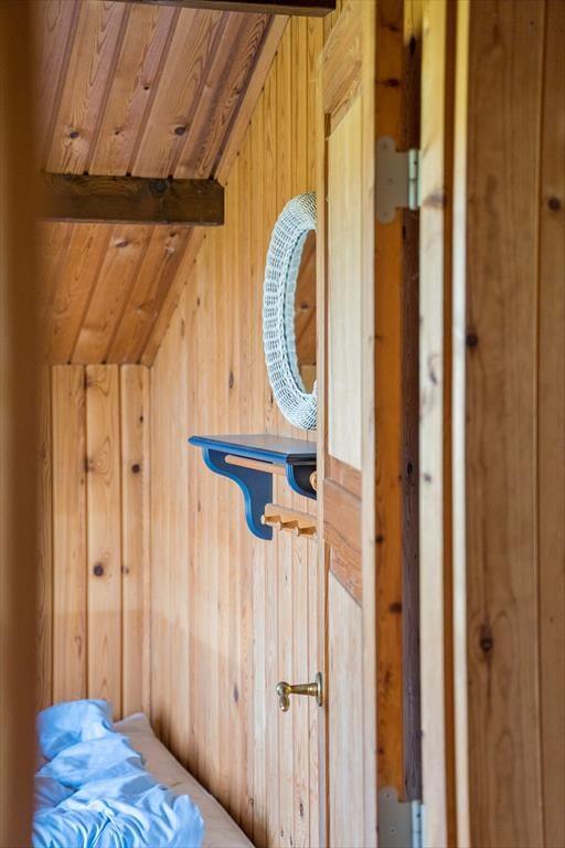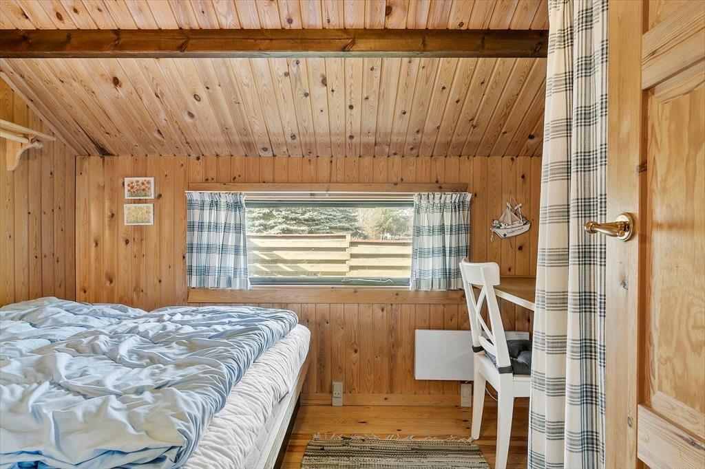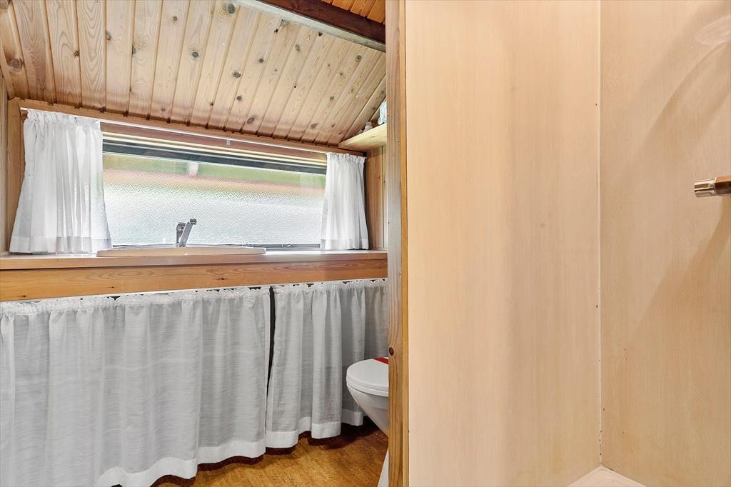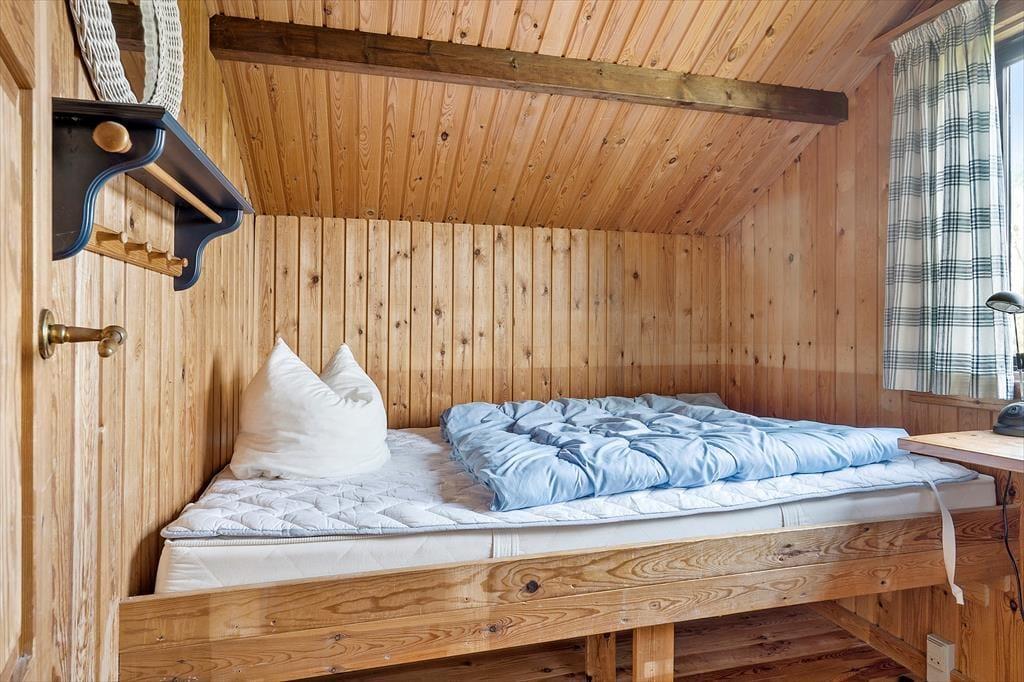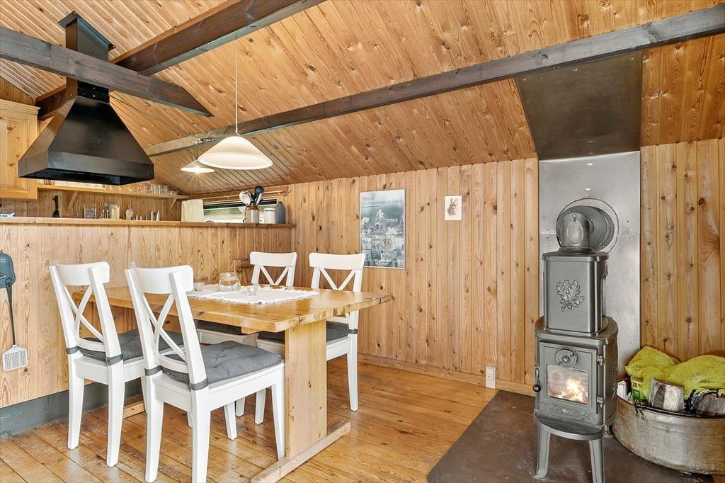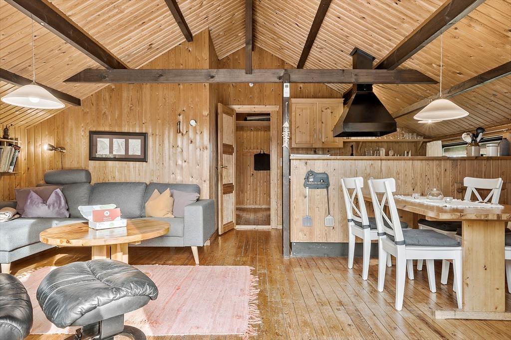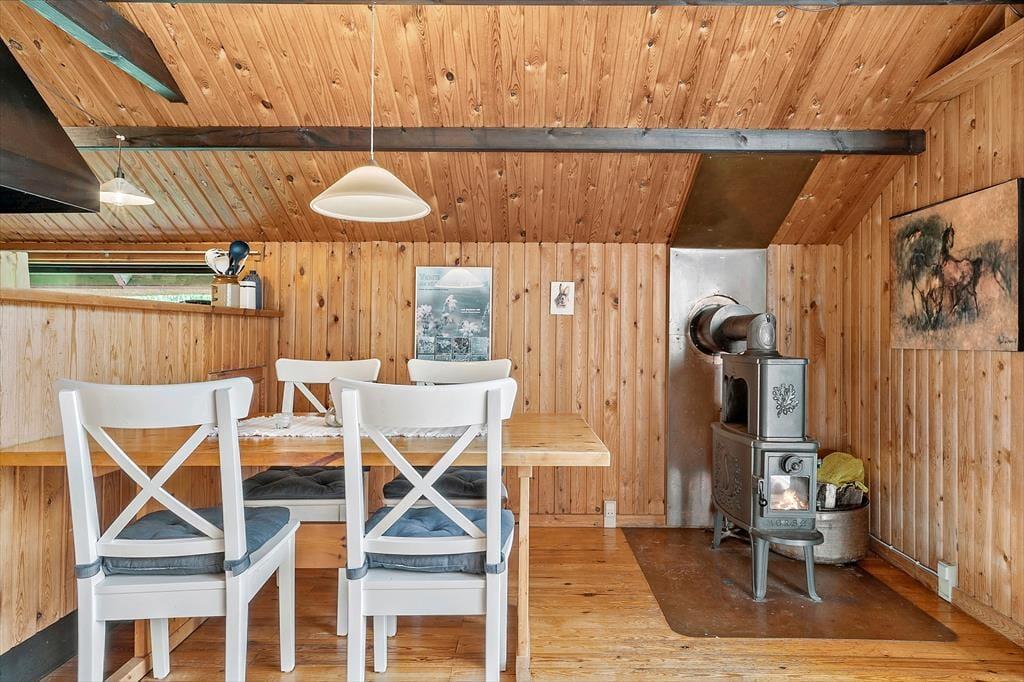 Selve sommerhuset er der også meget godt at sige om, for det er nemlig et særdeles charmerende eksemplar med rød træfacade, hvide skodder og stråtag. Inden døre fortsætter det gode indtryk i opholdsrummet, der består af køkken og stue i åben forbindelse. Med loft til kip, umalet træbeklædning og brændeovn er rummet lige præcis sådan, som man forventer af et klassisk sommerhus, så det er en perfekt ramme om familiens hyggestunder med gode bøger, brætspil, madlavning og lækre måltider ved spisebordet. Samme charmerende stil finder I også på badeværelset og de tre gode soveværelser, som i alt kan rumme fire personer. Som en praktisk detalje er der både fryser og vaskemaskine i redskabsrummet.