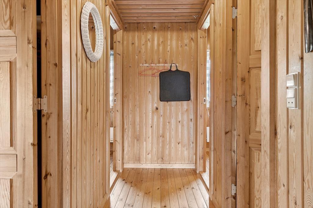 Stik syd for sommerhuset ligger en stor terrasse på den 2510 m2 store naturgrund. Orienteringen gør terrassen til et perfekt sted at nyde solen, og hvis en lille sommerbyge skulle passere forbi, kan I endda rykke ind under overdækningen. Har I små børn med på ferien, står der et gyngestativ på grunden, og der er god plads til at lege og spille bold på græsset.
