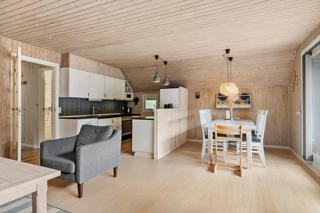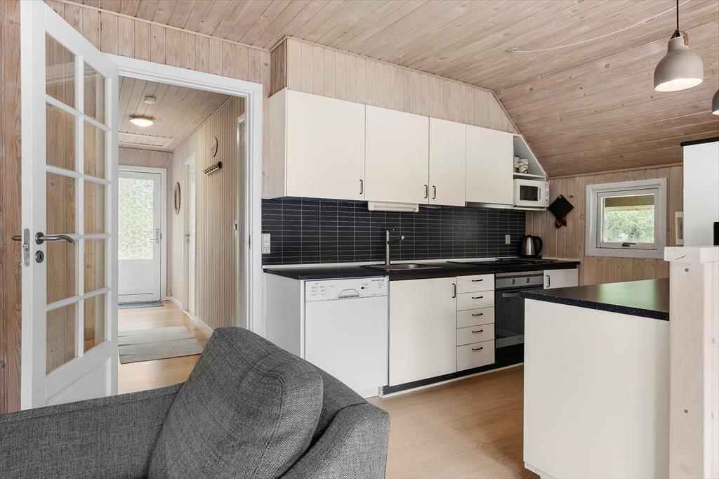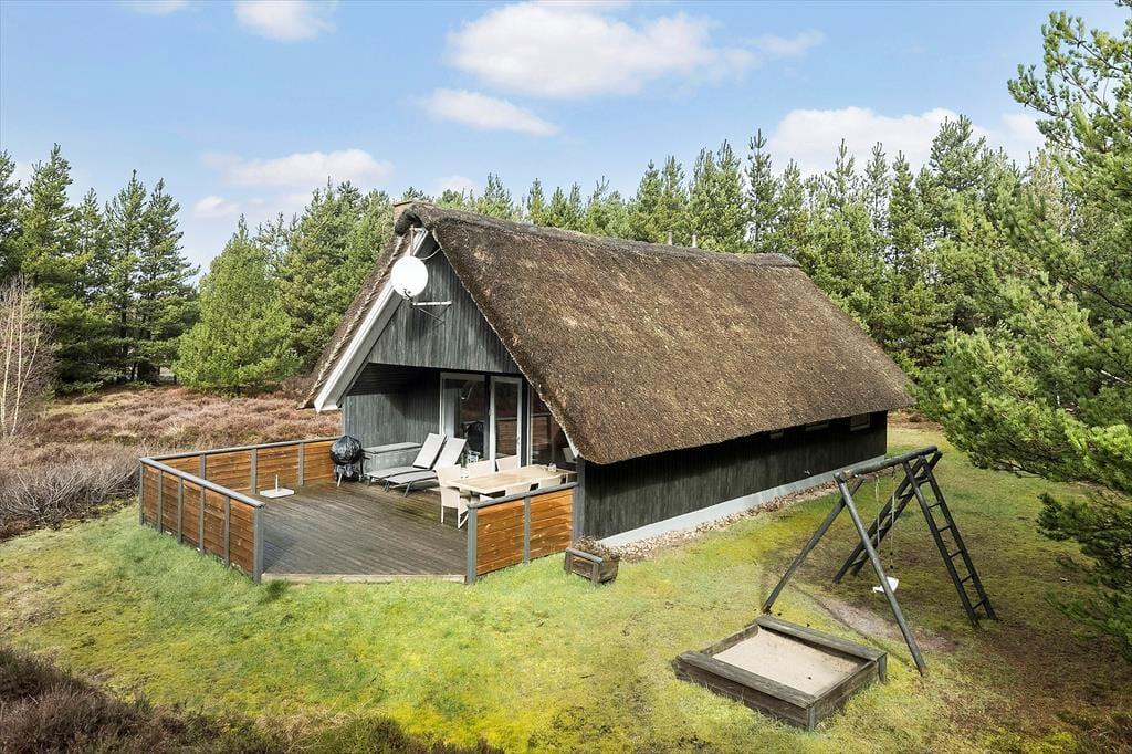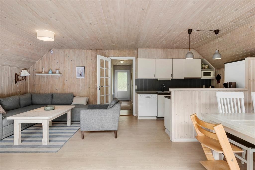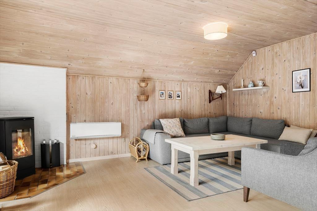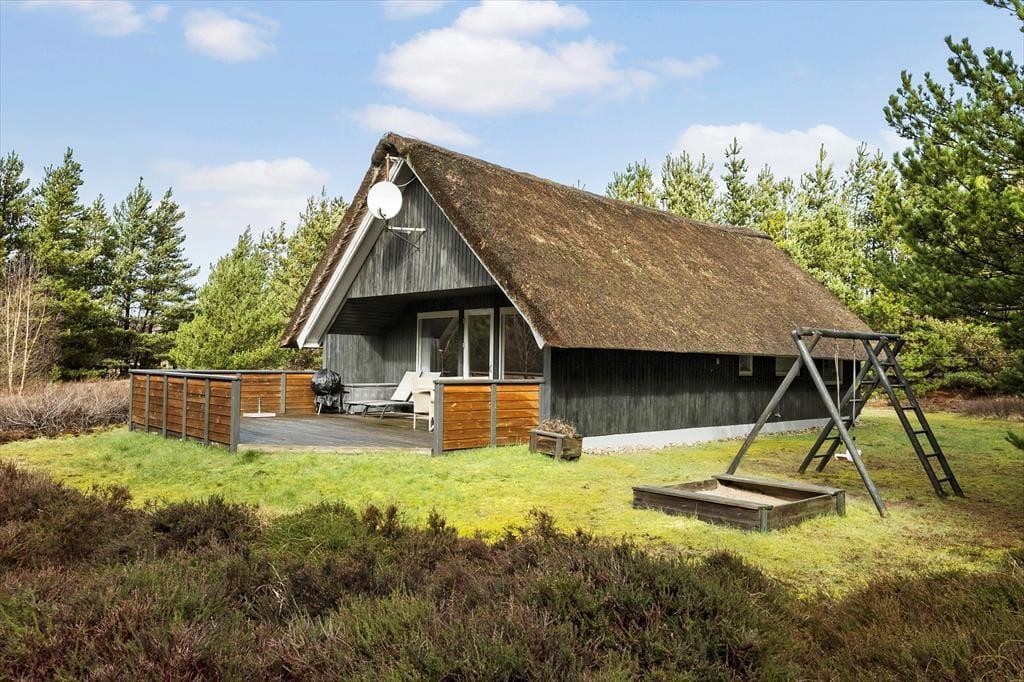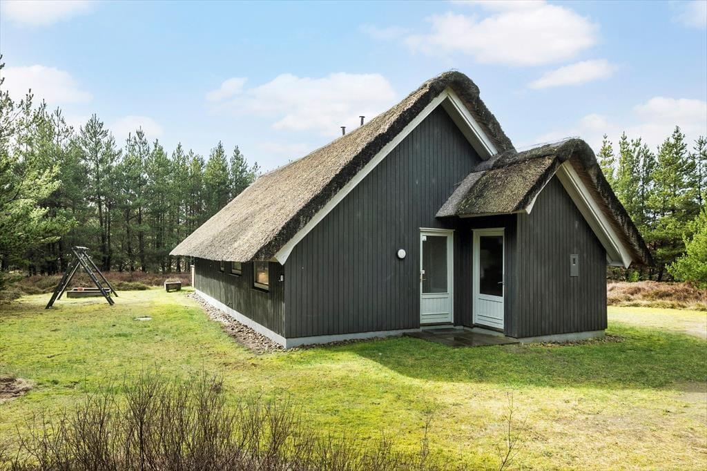 Det stråtækte sommerhus giver jer en dejlig ramme om feriens hyggestunder, der blandt andet kan bestå af brætspil samlet omkring spisebordet og sofaafslapning nær stuens brændeovn. Er I sultne, har I gode arbejdsforhold i det åbne køkken, så det er nemt at trylle noget lækkert frem – og der er for øvrigt også opvaskemaskine, der letter afrydningen efter måltidet. Fra sommerhusets gang har I adgang til husets øvrige rum, der tæller et pænt brusebadeværelse og tre gode soveværelser, der alle er udstyret med dobbeltsenge.