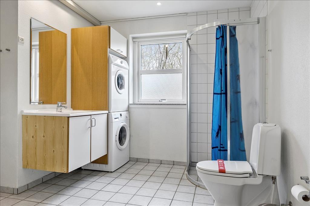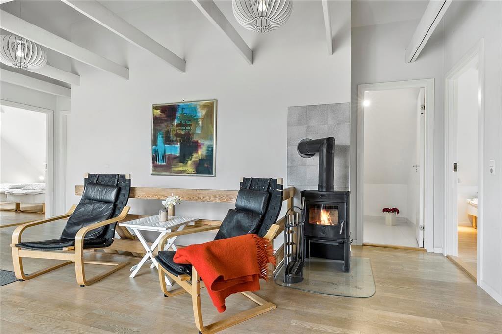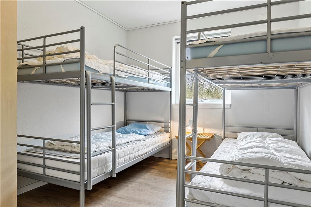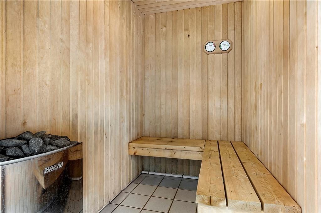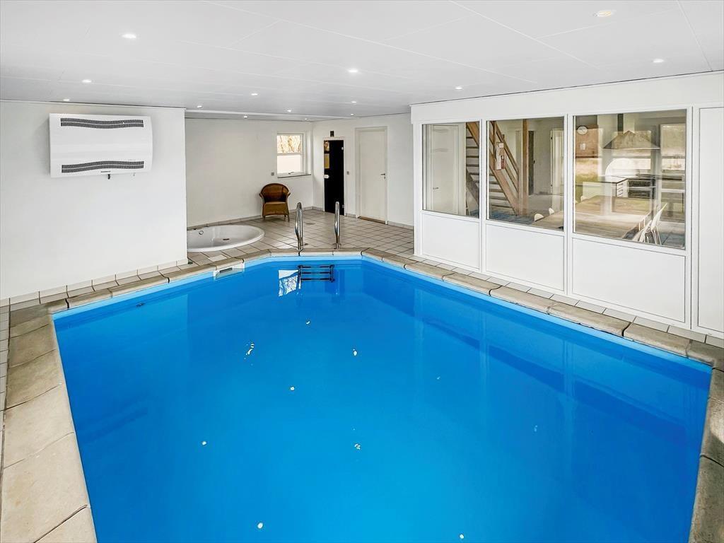 Sommerhuset er et særdeles rummeligt eksemplar på 203 m2, og derfor er der også plads til hele 14 feriegæster inden døre. Soveværelser er der seks af, og planløsningen byder desuden på to komplette badeværelser, der ligesom sovegemakkerne er placeret både i stueetagen og på første sal. I stueplan støder badeværelset på praktisk vis op til husets pool rum, som endnu bedre kan betegnes som en lækker wellnessafdeling: Her er der nemlig ikke bare en dejlig pool på 19 m2, men også et 4-personers spabad og en sauna. Når tiden ikke bliver brugt på at plaske i vandet eller læne sig tilbage i varmen, kan I samles i husets flotte køkken-alrum, der for øvrigt ligger med direkte udsyn til poolen. Går I op på førstesalen, kan I slå jer ned i stuen, som er et dejligt opholdsrum med brændeovn, fladskærms-TV og bløde siddepladser til mange mennesker.