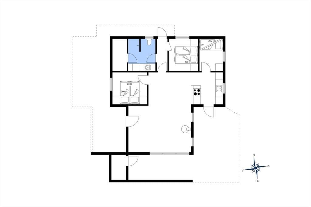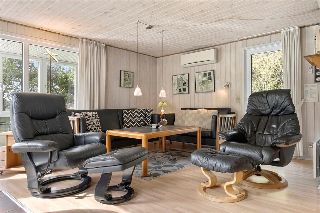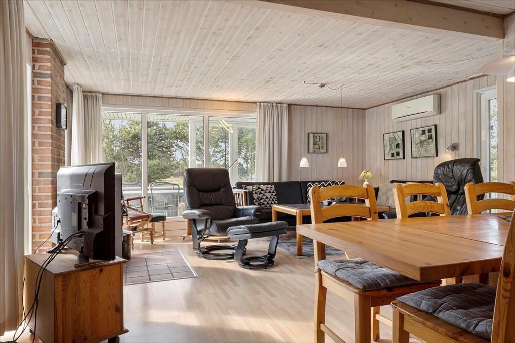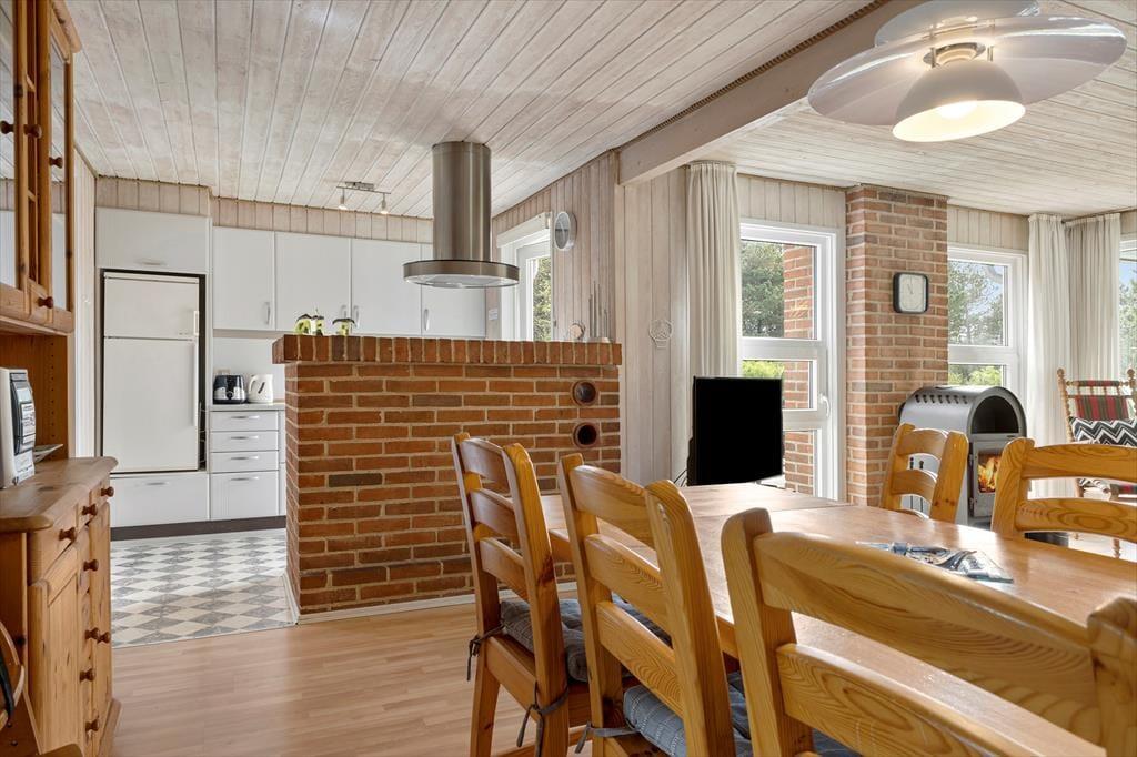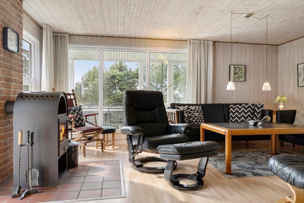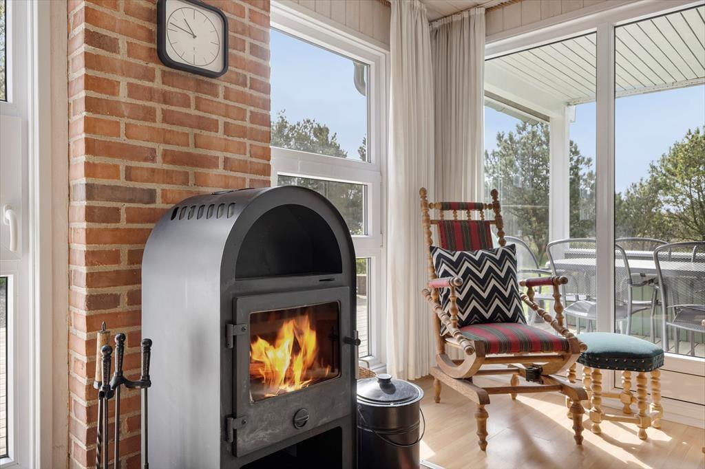 Når vejret er godt, er det selvfølgelig fristende at bruge mest muligt af tiden ude i det fri – men når du holder ferie i et hus med brændeovn i stuen, tre gode soveværelser og en sauna på badeværelset, er det nu også tillokkende at blive inden døre. Brændeovnen er smart placeret, så du får glæde af varmen og hyggestemningen, uanset om du sidder ved spisebordet eller i sofaafdelingen. Og hvis det er din tur til at lave mad, kan du smutte hen i det åbne køkken for at trylle noget lækkert sammen, mens du hører musik i radioen eller hyggesnakker med familien hen over halvmuren.