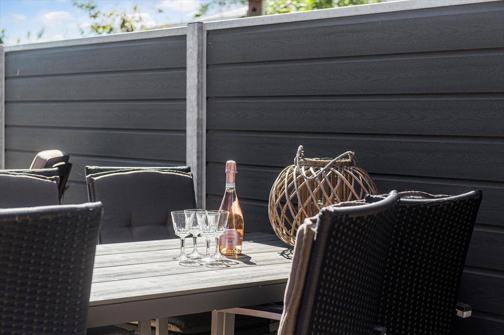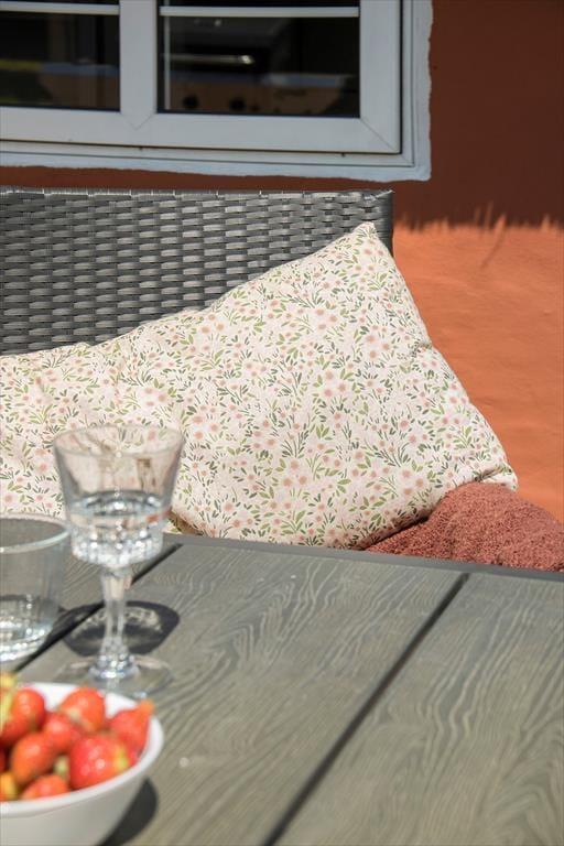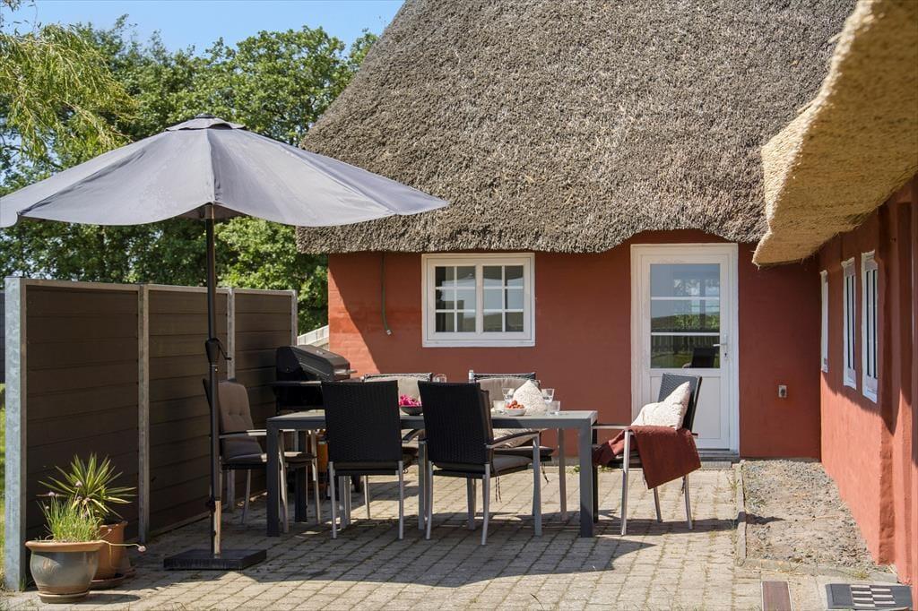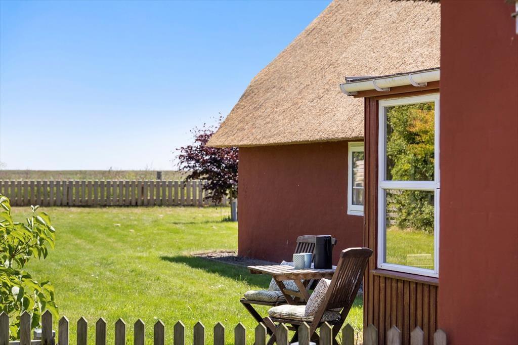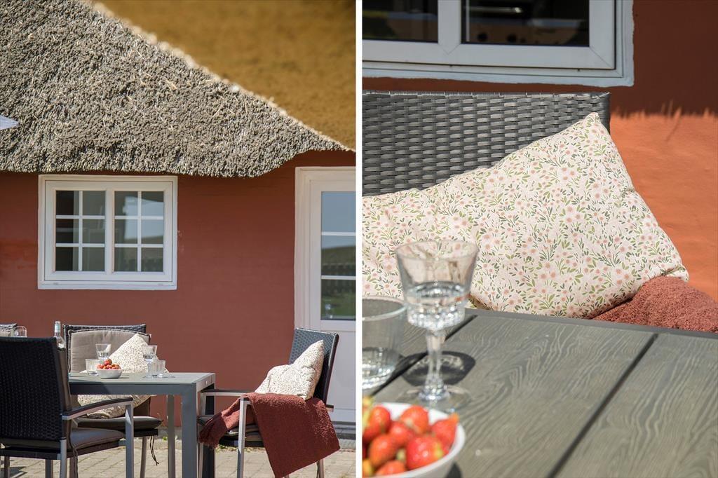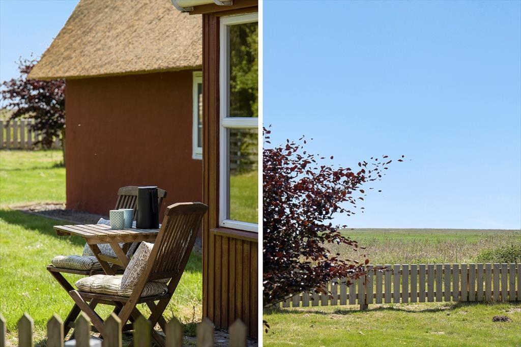Sommerhusets sydvendte terrasse ligger godt afskærmet, så det er et herligt sted at slikke sol i ugenerede og fredfyldte omgivelser. Med gasgrill, parasol og gode havemøbler kan du se frem til at nyde de skønneste sommermåltider herude i det fri – eventuelt afbrudt af en omgang vikingespil eller frisbee, hvis børnene skal underholdes mellem hovedretten og desserten. Græsplænen er god og plan, og mod øst kan du skue langt ud over Juvre Enges flade marsklandskab, der strækker sig helt mod Rømøs kyst og Vadehavet. Ud mod vejen er der god plads til at parkere, også hvis I ankommer i flere biler.