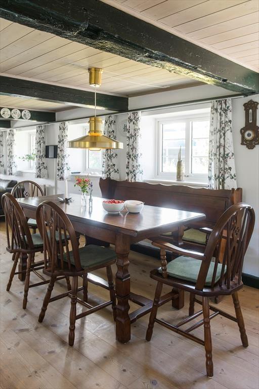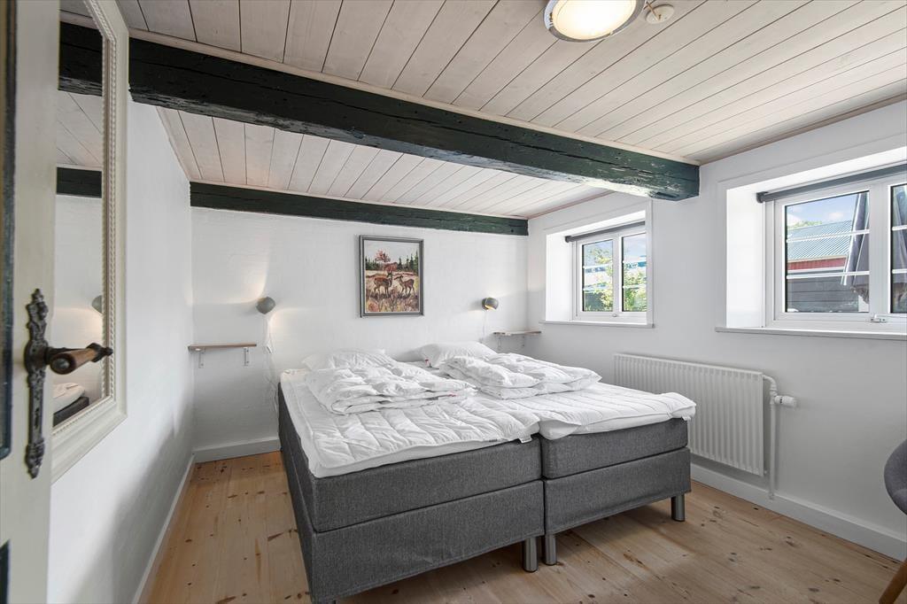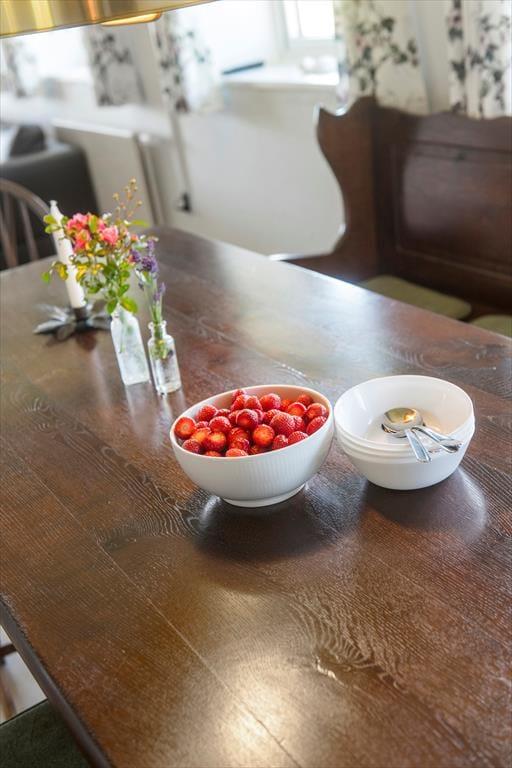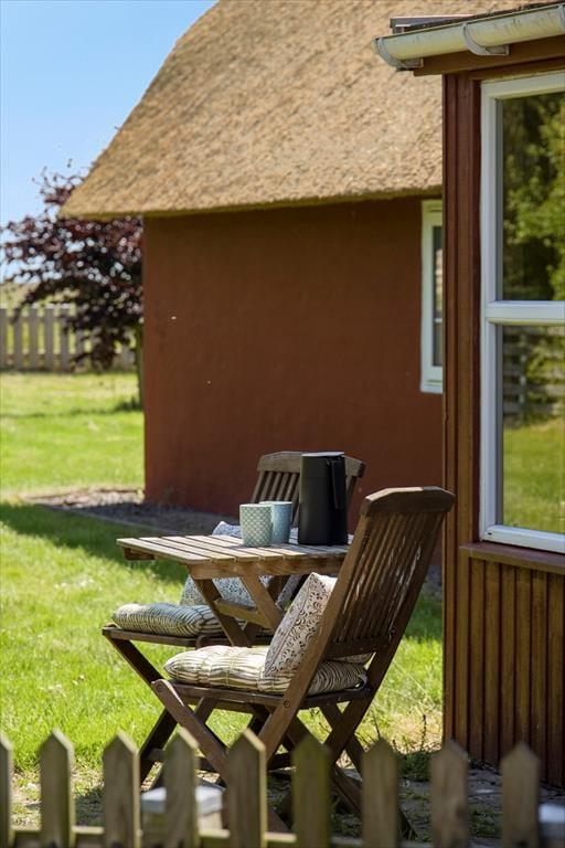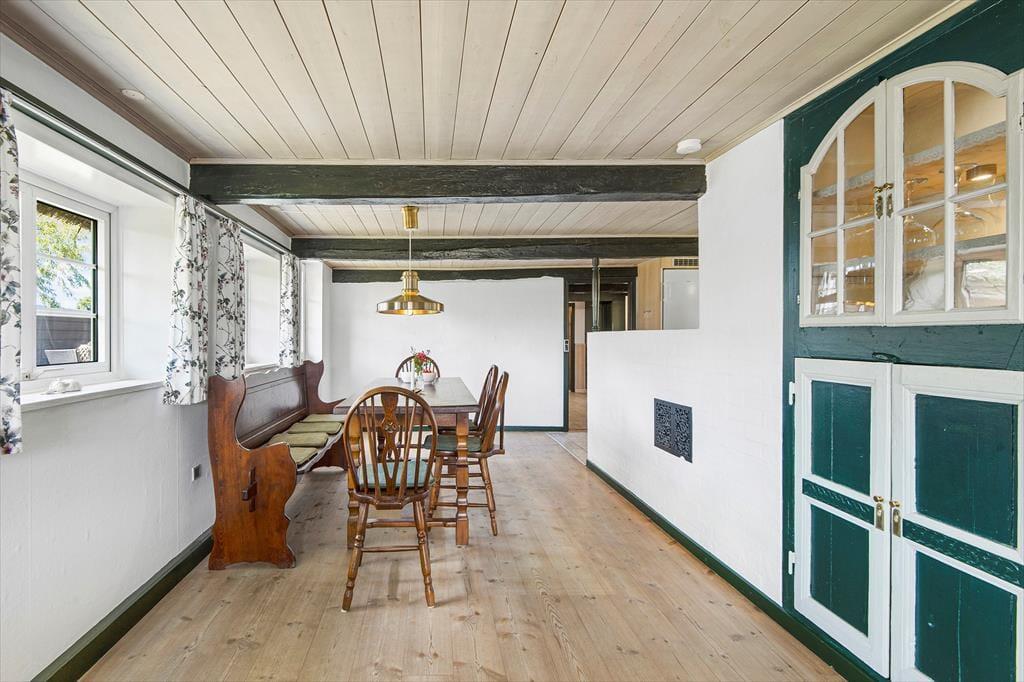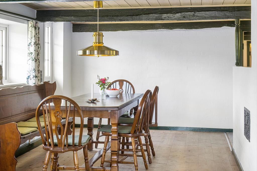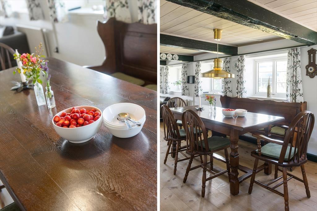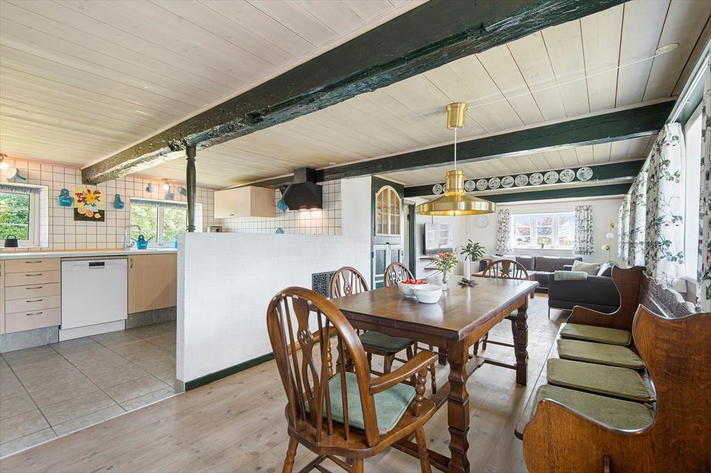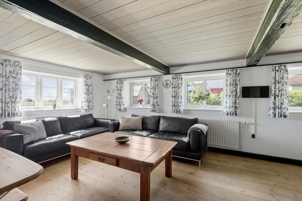 Du kan nærmest føle dig hensat til en helt anden tid, når du ankommer til den kønne gård, der lyser op med sin røde facade og hvide sprossevinduer under stråtaget. Ejendommen har stået her i mere end to århundreder, og i en periode fungerende den som Juvre Kro – men i dag er det altså dig og andre sommerhusgæster, der kan indlogere sig i de stemningsfulde rum. Inden døre er der fine historiske detaljer at glædes over, og som det kan forventes af et hus fra den tid, er loftshøjden under træbjælkerne i dele af ejendommen blot 180 cm. Samtidig sørger de moderne faciliteter for at højne komforten: For eksempel er der spabad på badeværelset, fladskærms-tv i stuen og fri wifi-forbindelse, og i aktivitetsrummet kan du udfordre familien i både pool, bordtennis og dart. I det åbne køkken kan du glæde dig til at kræse om maden, og når du ikke slapper af i stuen, er husets lille havestue et hyggeligt sted at holde til.