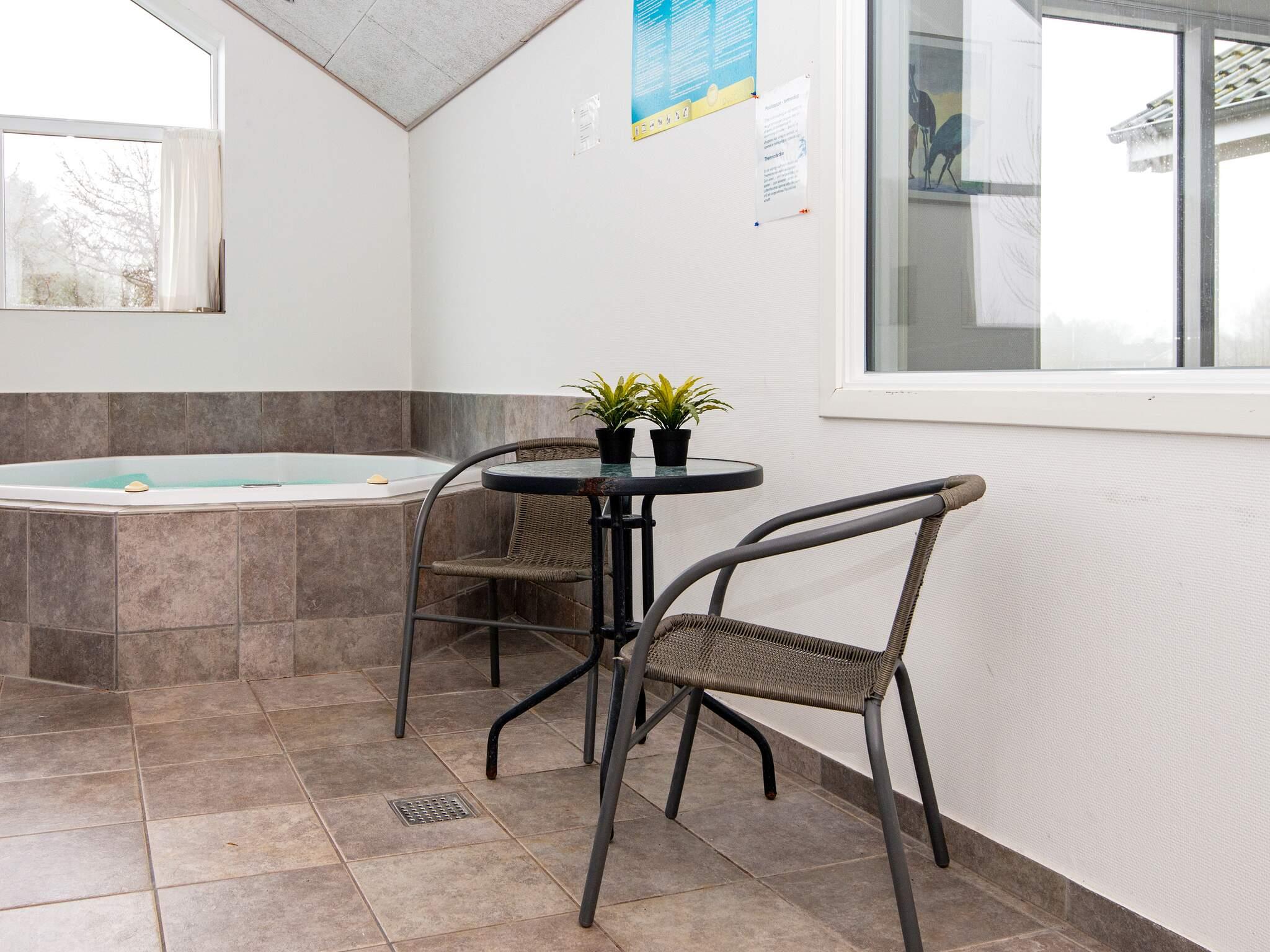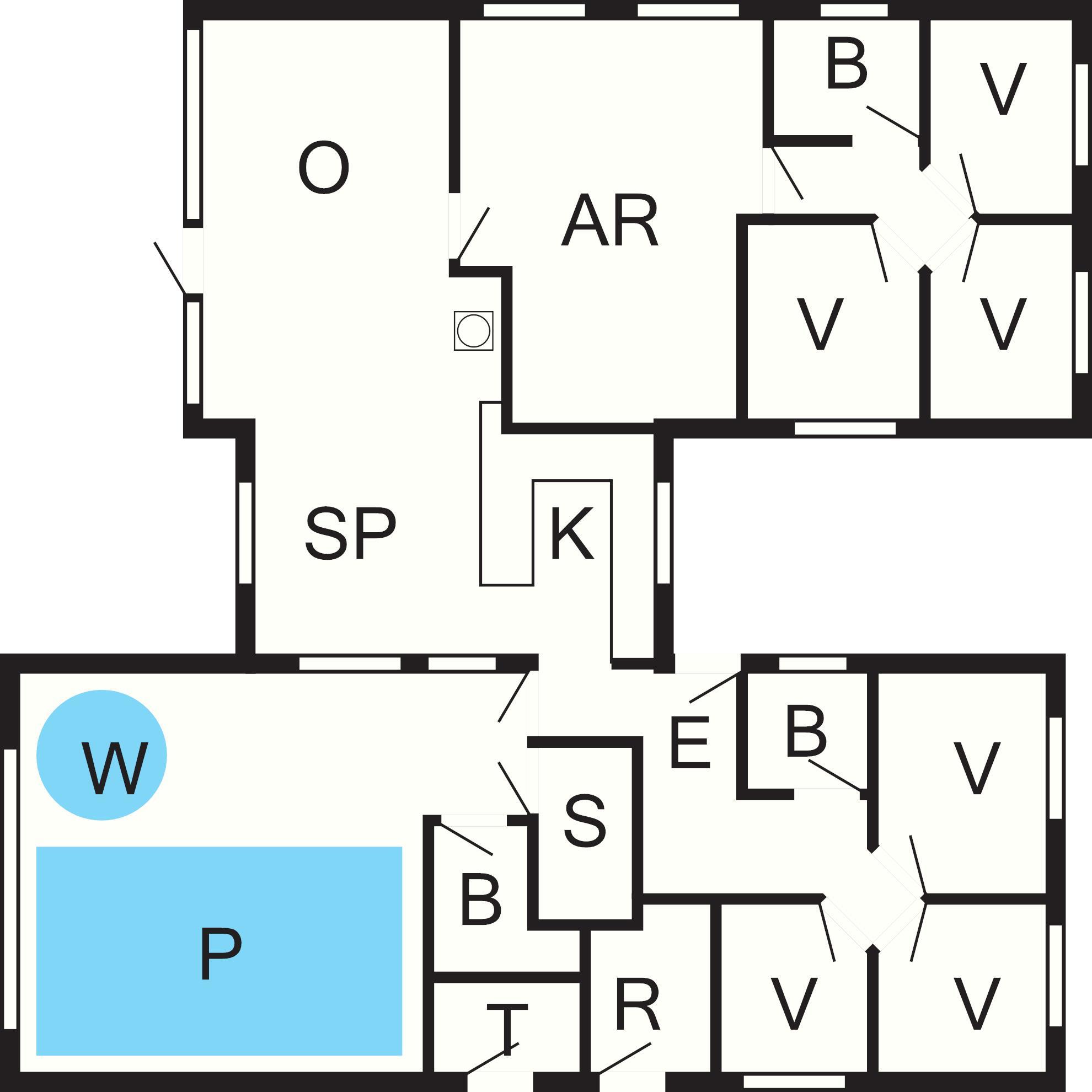 Den store poolafdeling med loft til kip rummer swimmingpool, sauna og et spabad med plads til 4-6 personer. Huset er opbygget med 2 separate soveafdelinger. Hver afdeling har eget badeværelse og i forbindelse med poolafdelingen findes endnu et badeværelse. Alle badeværelser har bruseniche og klinkegulv med gulvvarme.