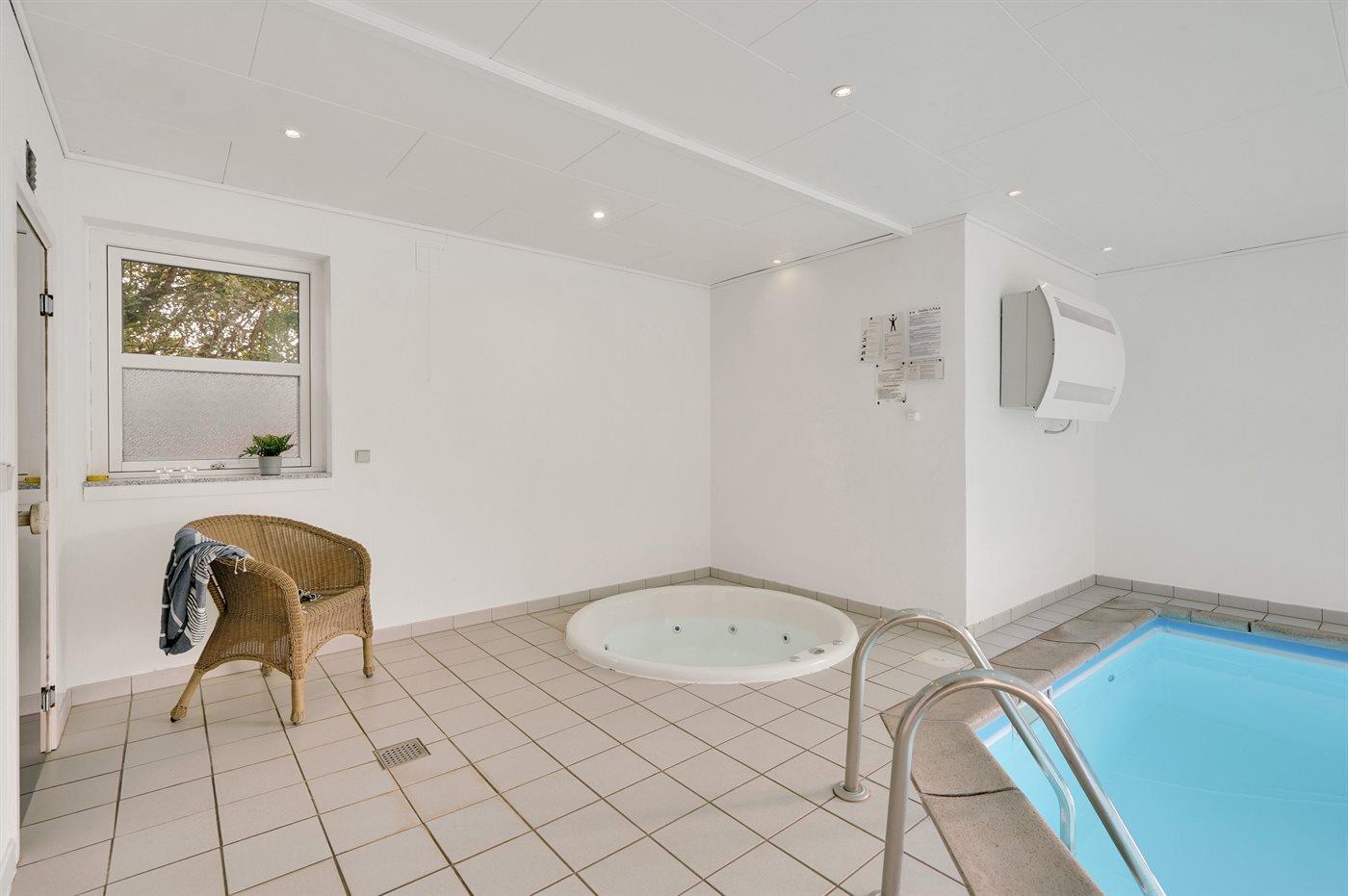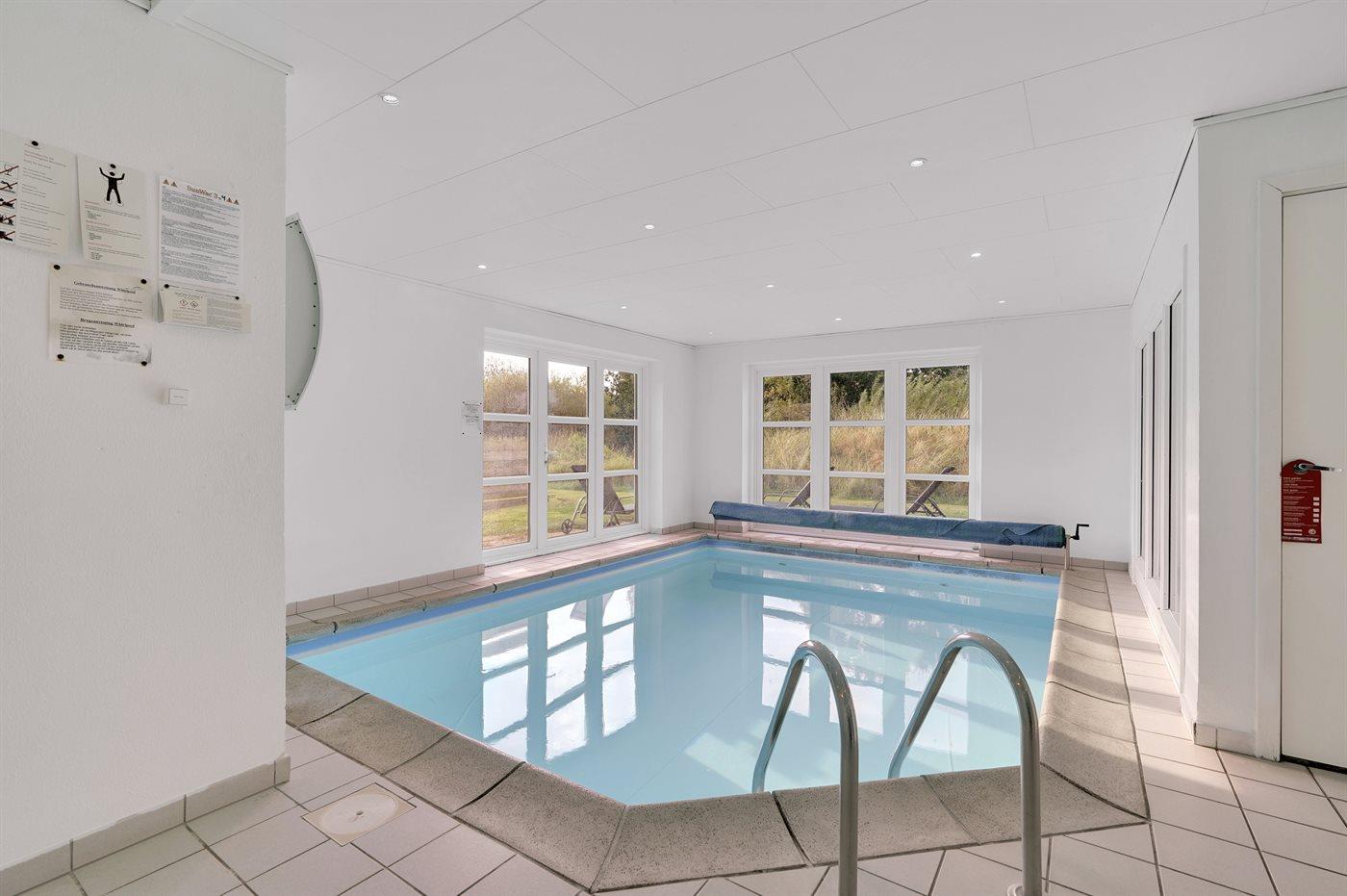 I den indendørs swimmingpool er der mulighed for leg og hyggeligt samvær. Swimmingpoolen måler op til 3,65 m i bredden, 5 m i længden og den er op til 1,4 m dyb. Vandet er mellem 24 og 28° C varmt. Der er gulvvarme i swimmingpoolområdet.