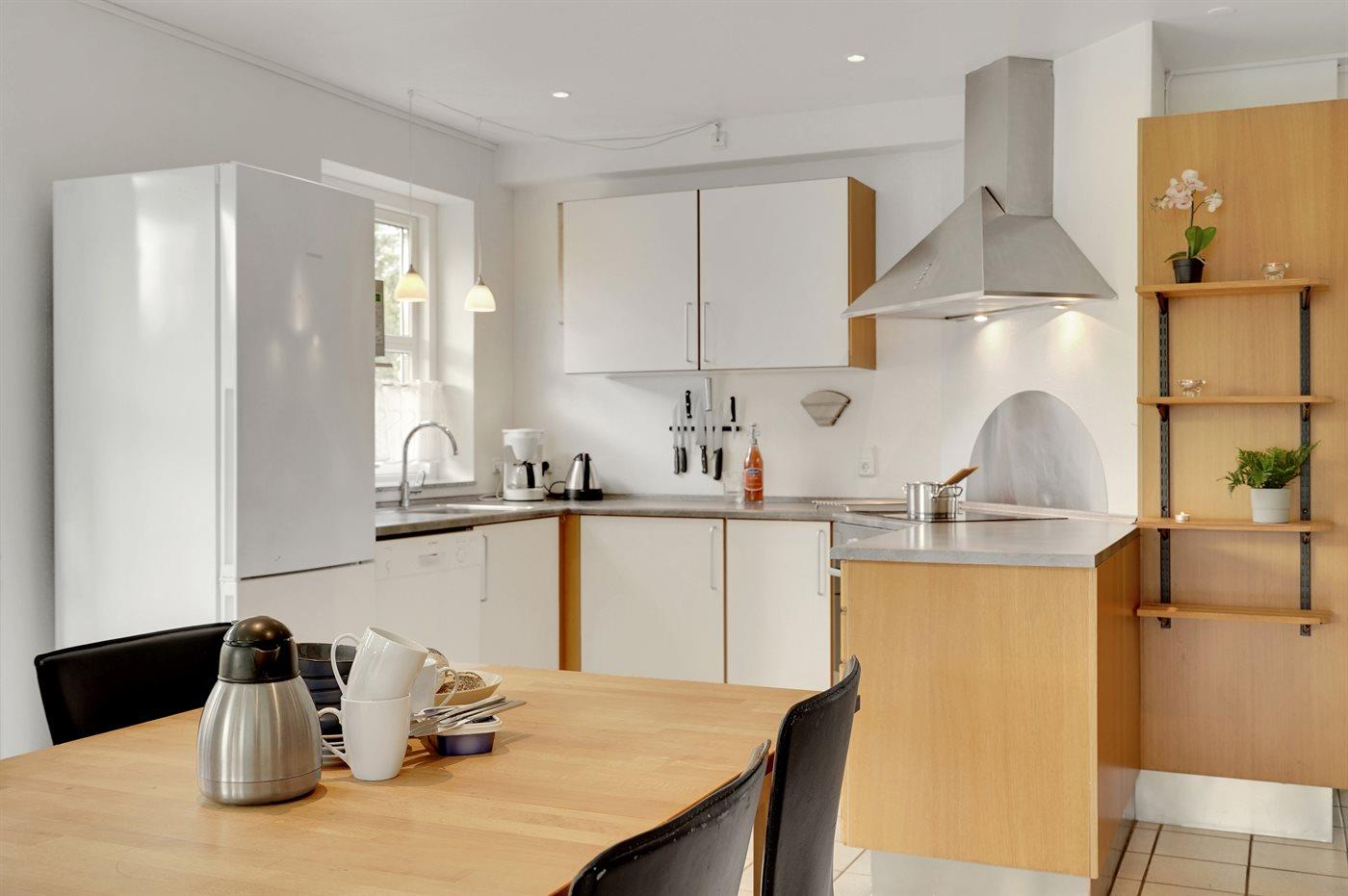 Køkkenet er udstyret med 1 køleskab. Der er 4 keramiske kogeplader, varmluftovn, mikrobølgeovn samt opvaskemaskine Der er gulvvarme i køkkenet.