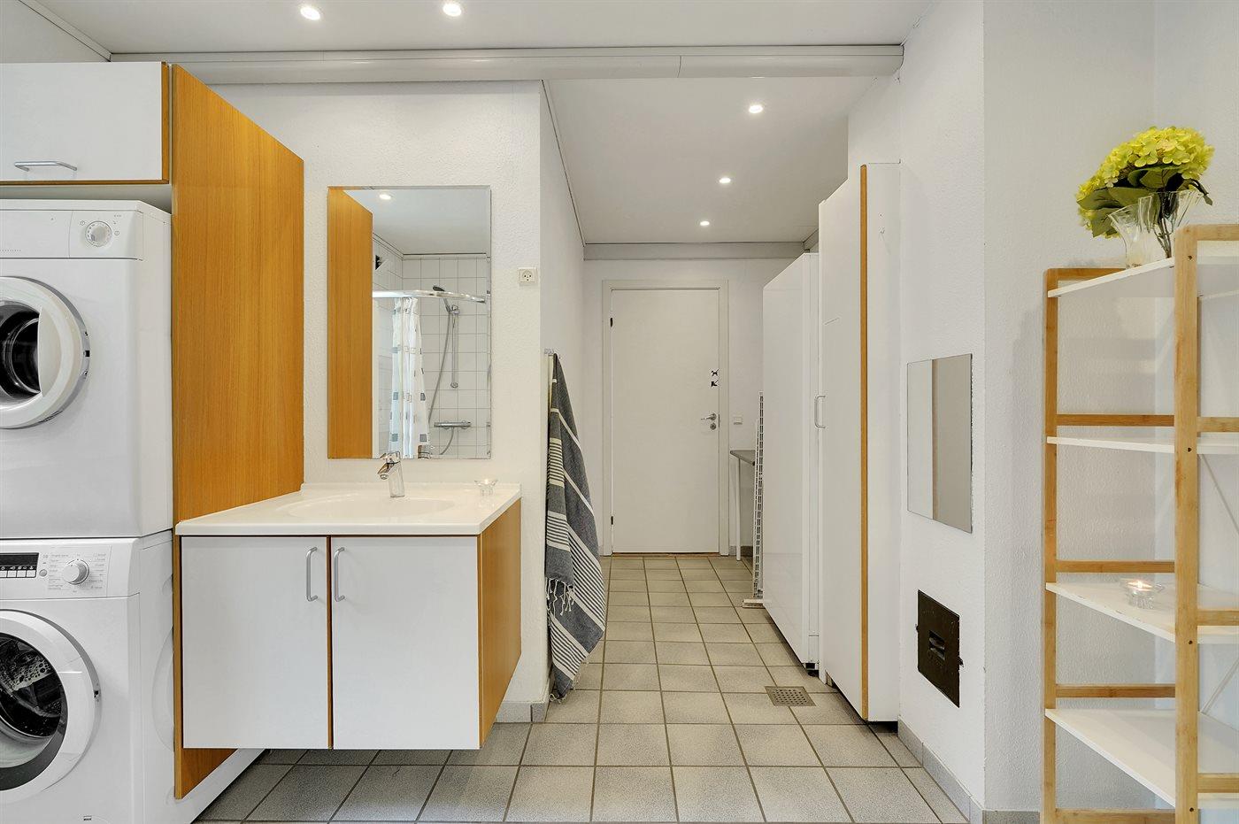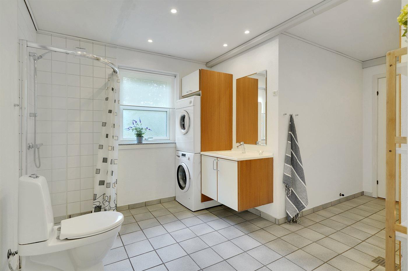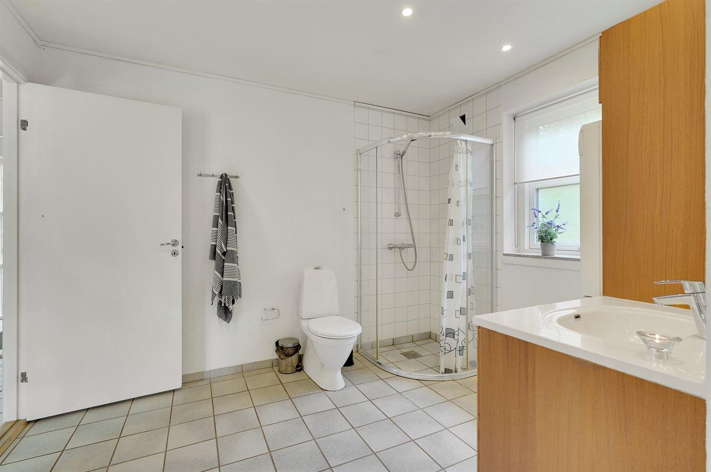 Der er 2 badeværelser med bruseniche og 2 toiletter. Der er gulvvarme på 1 badeværelse. I saunaen er der mulighed for afslapning.