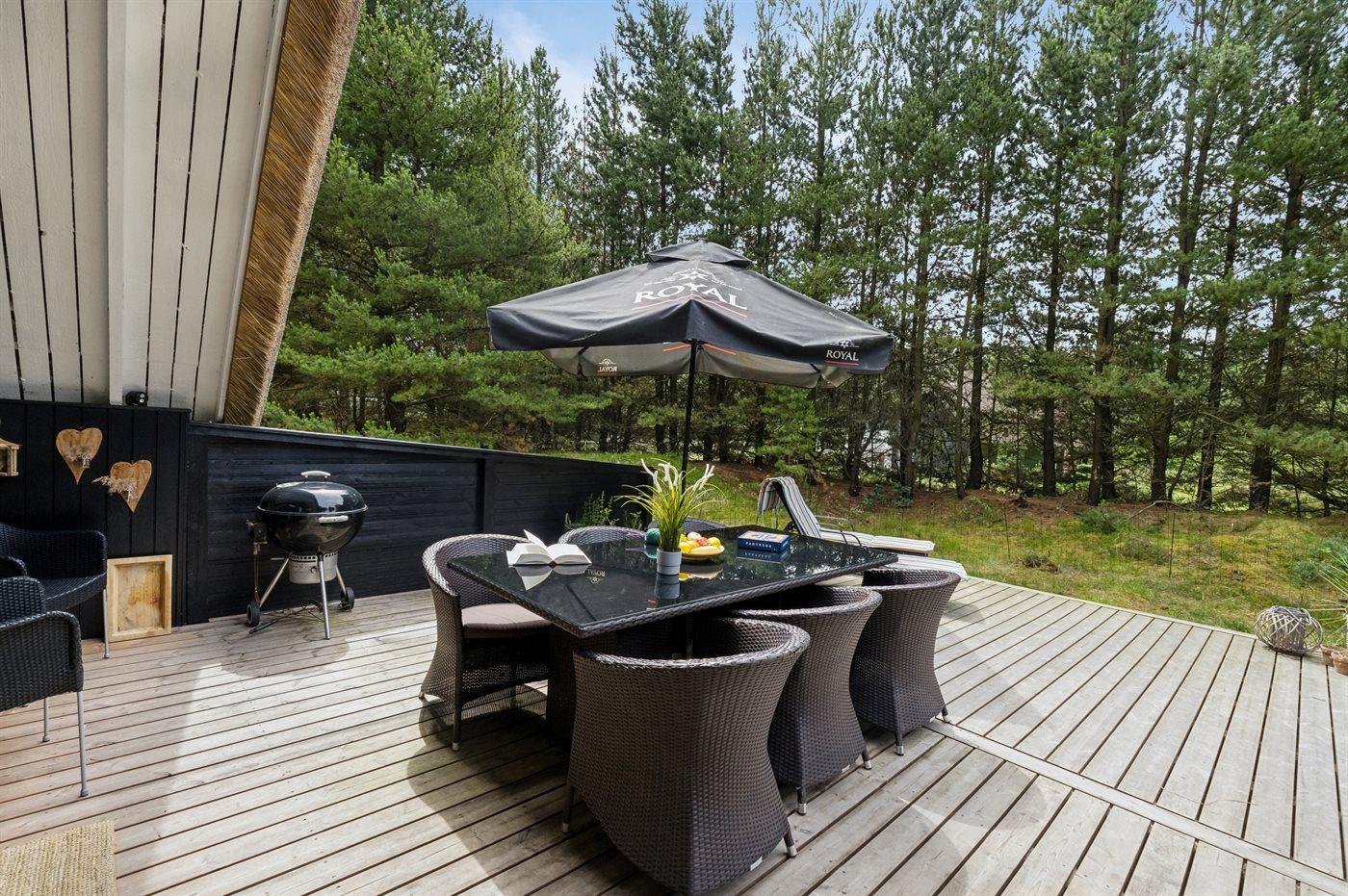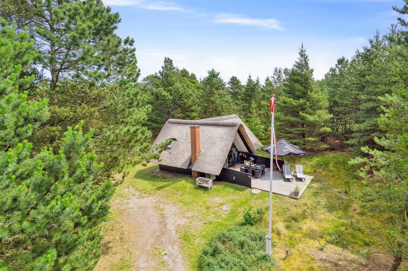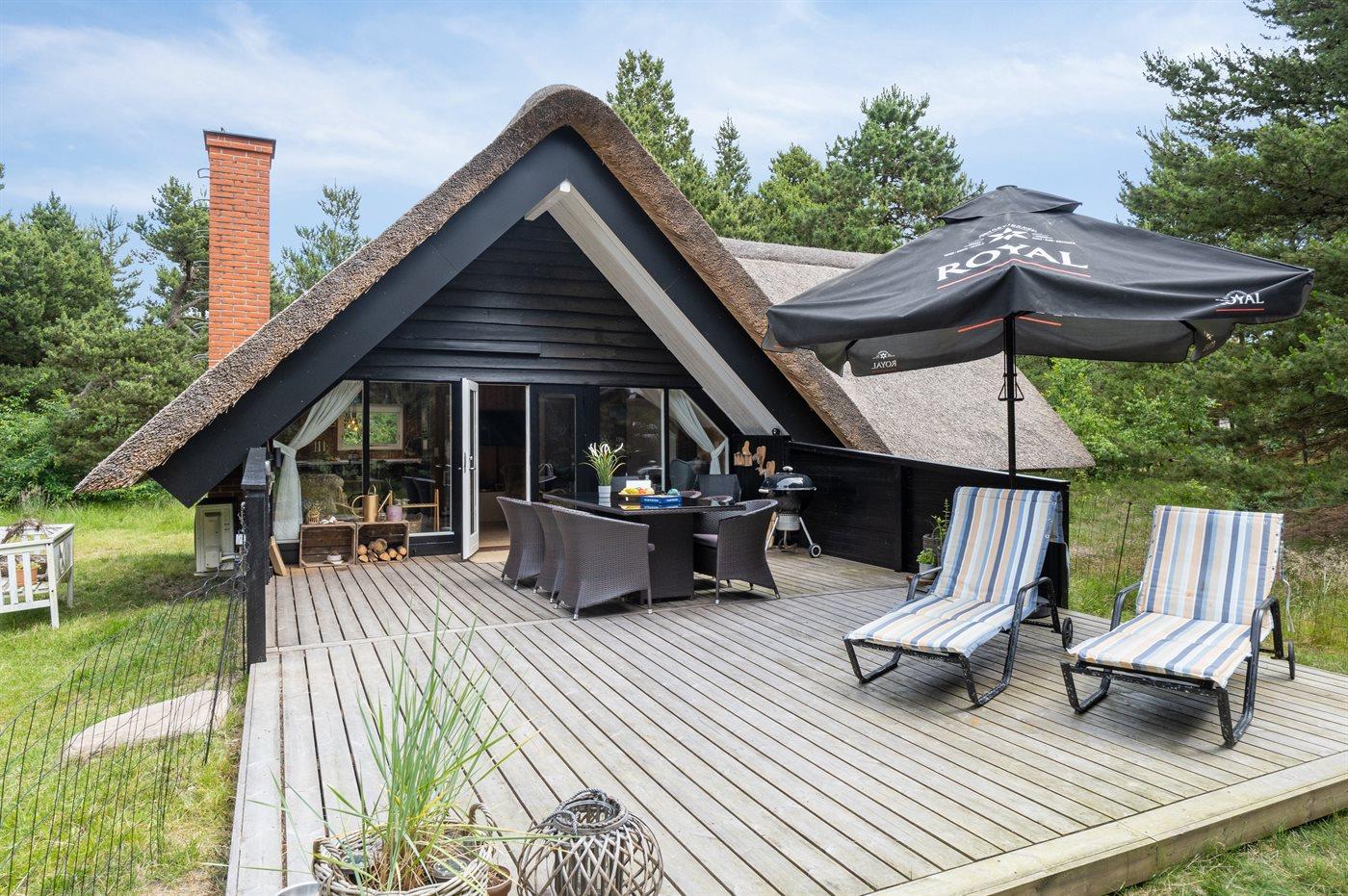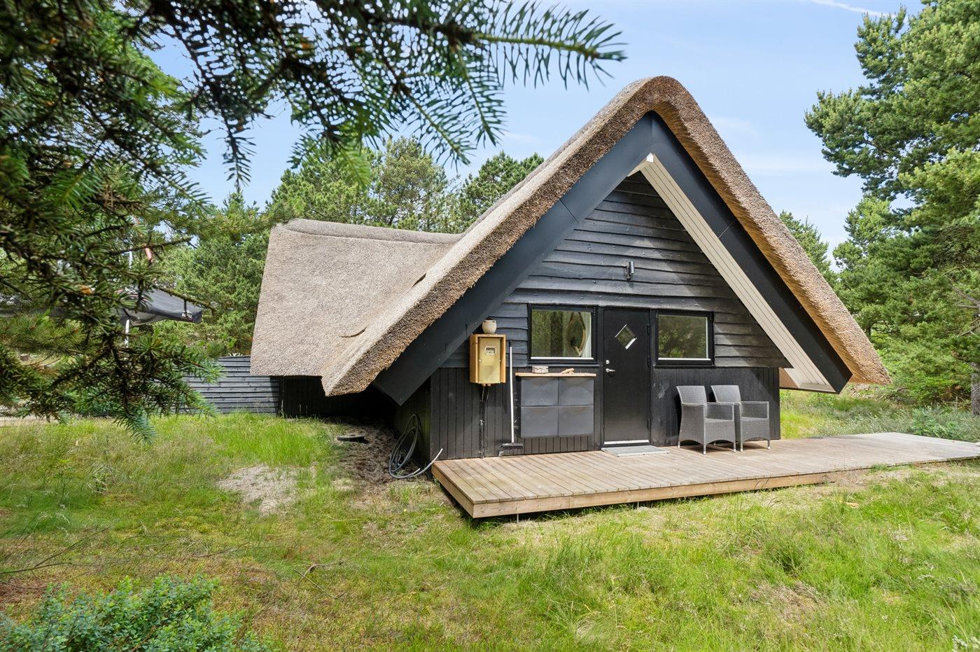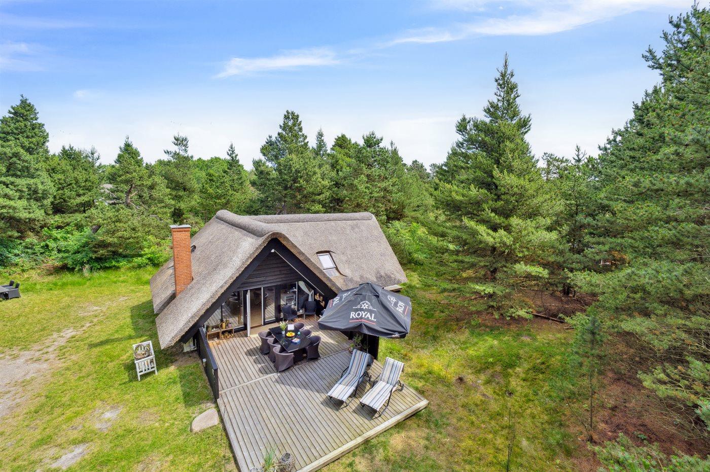 Hyggeligt stråtækt sommerhus på stor lyngklædt grund nær Vadehavet med moderne faciliteter og elbilopladning.