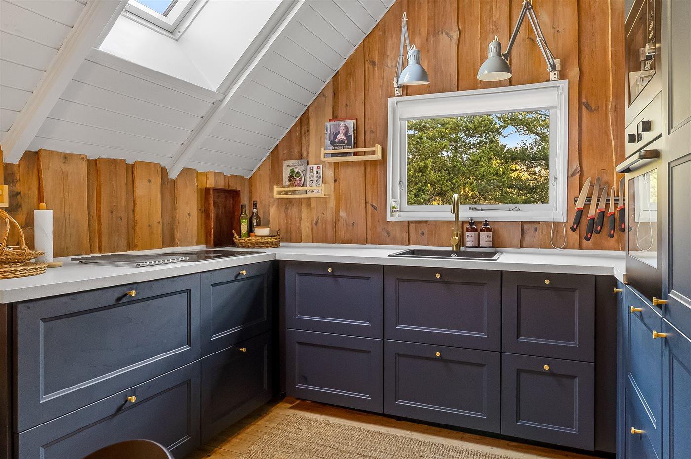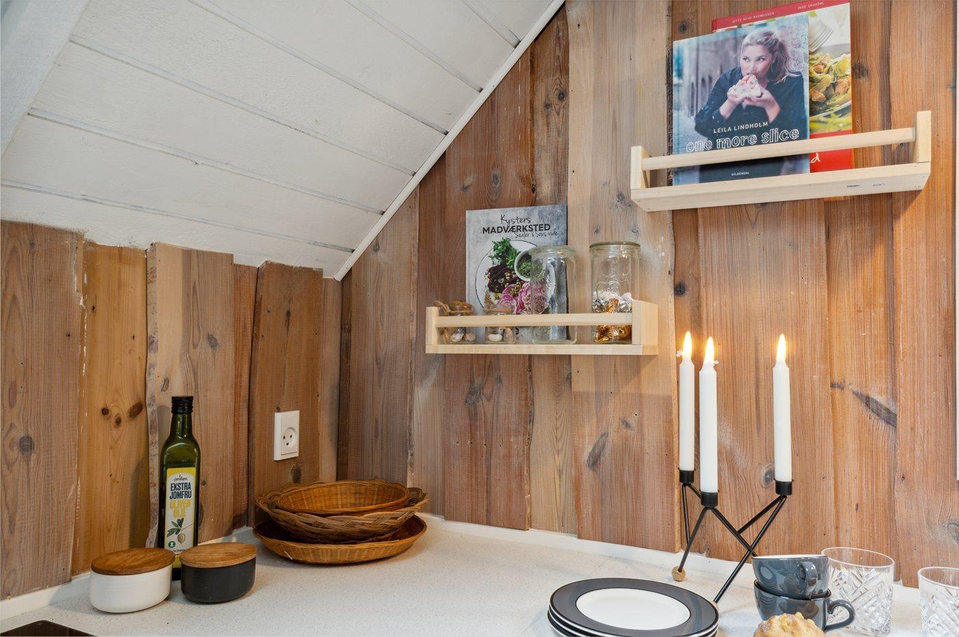 Køkkenet er udstyret med 1 køleskab. Der er 4 elkogeplader, varmluftovn, mikrobølgeovn samt opvaskemaskine.