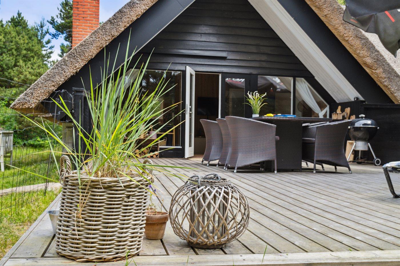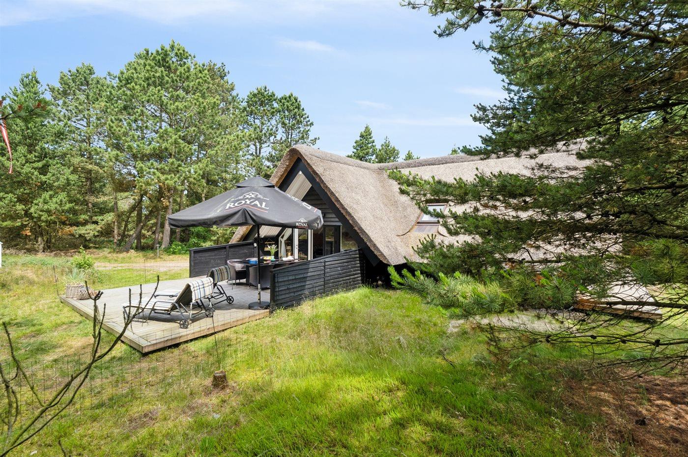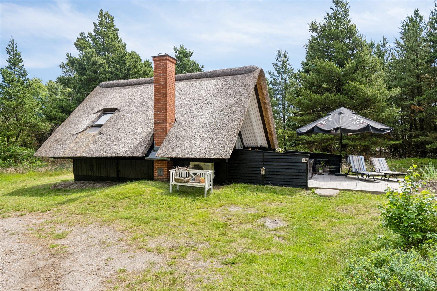 Dette hyggelige, stråtækte sommerhus ligger på en dejlig, stor og lyngklædt grund med græsplæne.