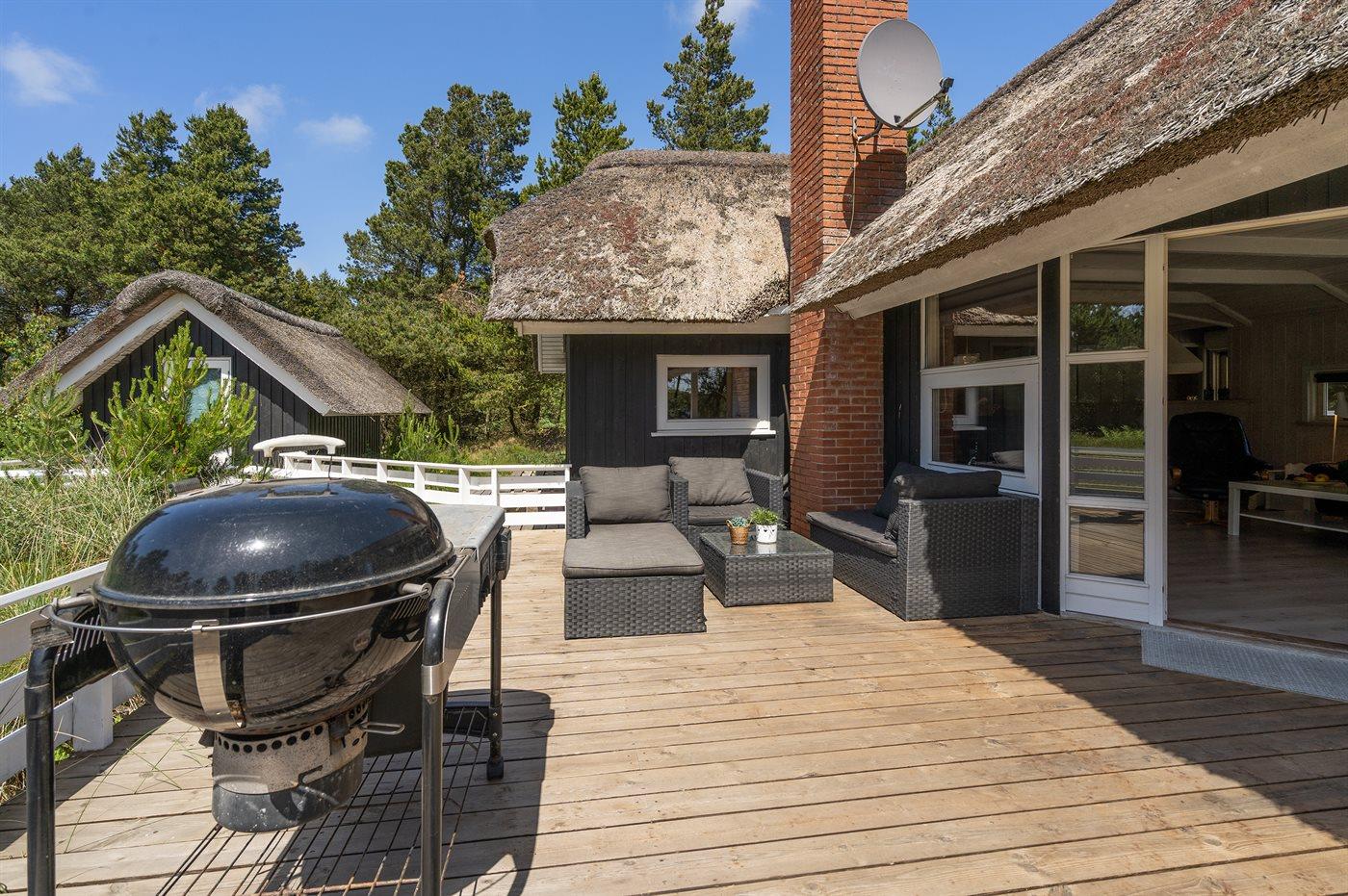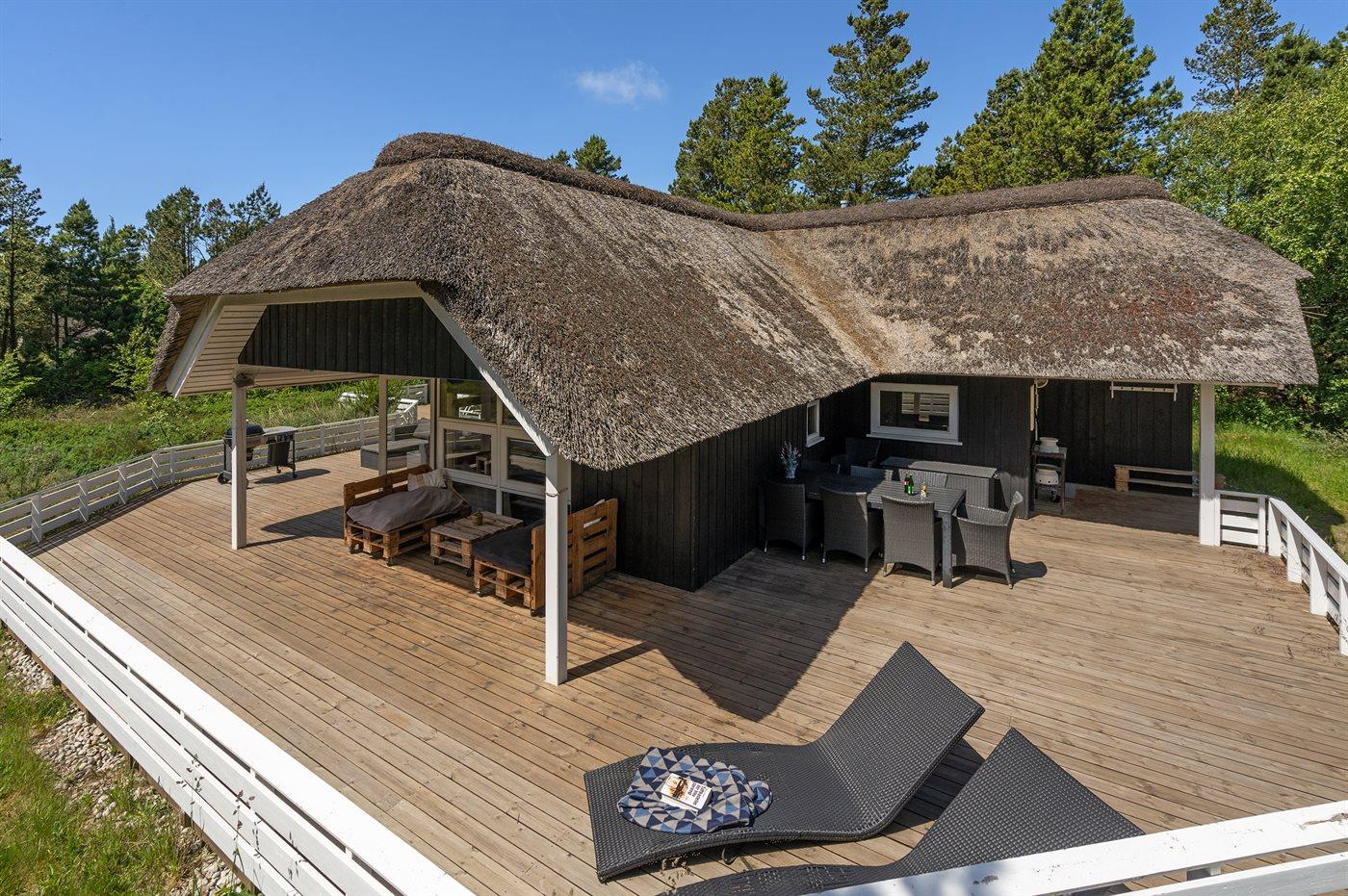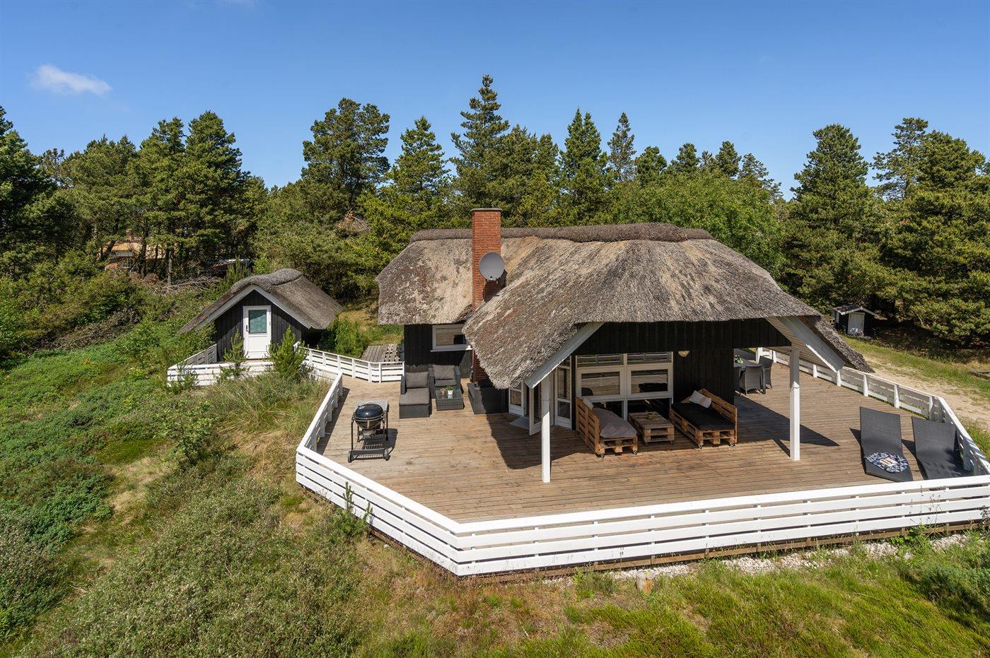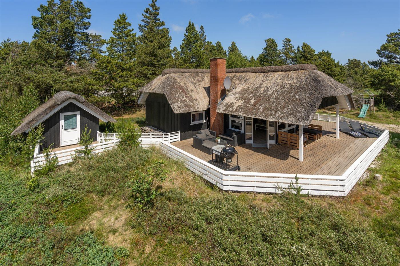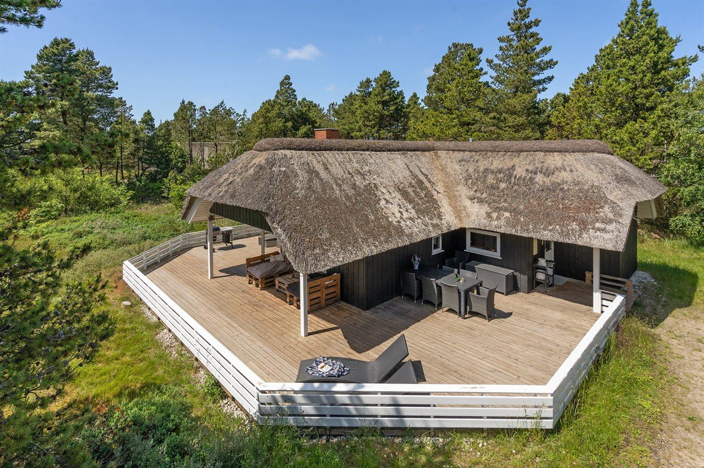 Flot, stråtækt sommerhus i træ, bygget i 1992 og renoveret i 2011, beliggende på en stor, tilbagetrukket naturgrund med lyng. Grunden ligger ugeneret og er omgivet af træer. Til huset hører en stor, afskærmet, delvist overdækket terrasse med havemøbler. Badeværelse med bl.a. 2-pers. spa, gulvvarme, bruser og direkte adgang til husets sauna. Det flotte, lyse køkken er kombineret med spisestuen og er udstyret med bl.a. opvaskemaskine, vaskemaskine og tørretumbler. Opholdsstuen er indrettet med store panoramavinduer, brændeovn, DVD-afspiller, TV med parabolantenne og stereoanlæg med CD-afspiller samt udgang til terrassen. Desuden gratis, trådløs internetforbindelse til rådighed (computer skal medbringes). Sovepladserne er fordelt på 3 værelser; 1 med dobbeltseng, 1 med dobbeltseng og 1 enkeltseng samt 1 med køjeseng og 1 enkeltseng. Til de små feriegæster er der barneseng, høj barnestol, sandkasse og gynge til rådighed.