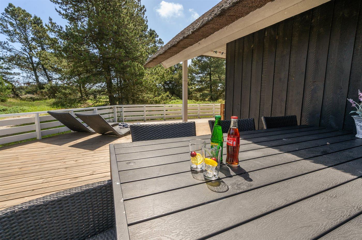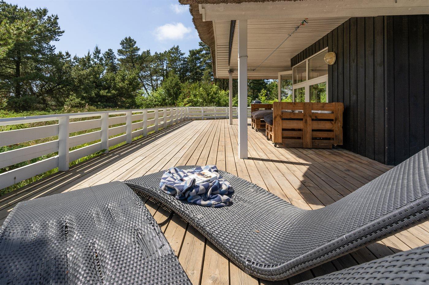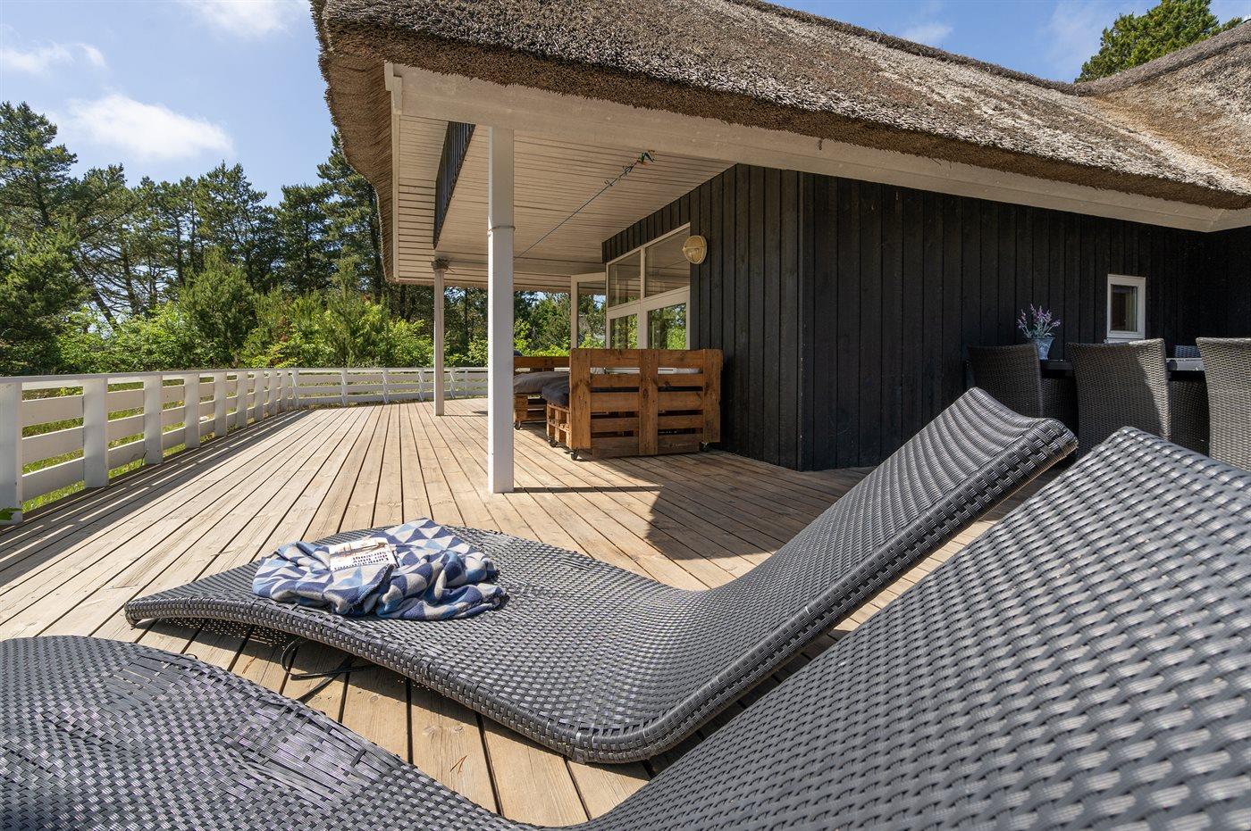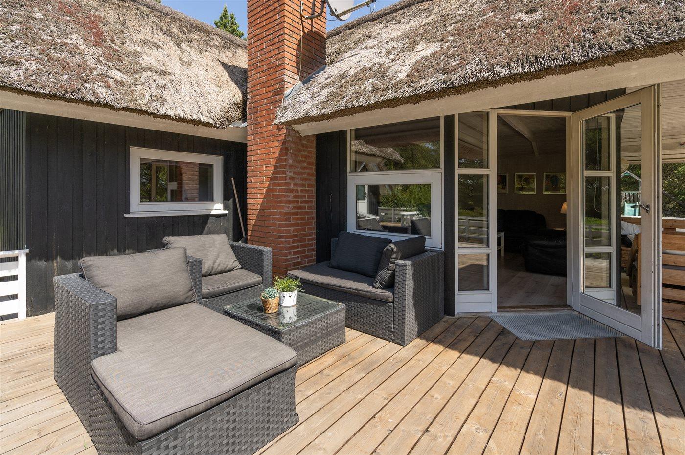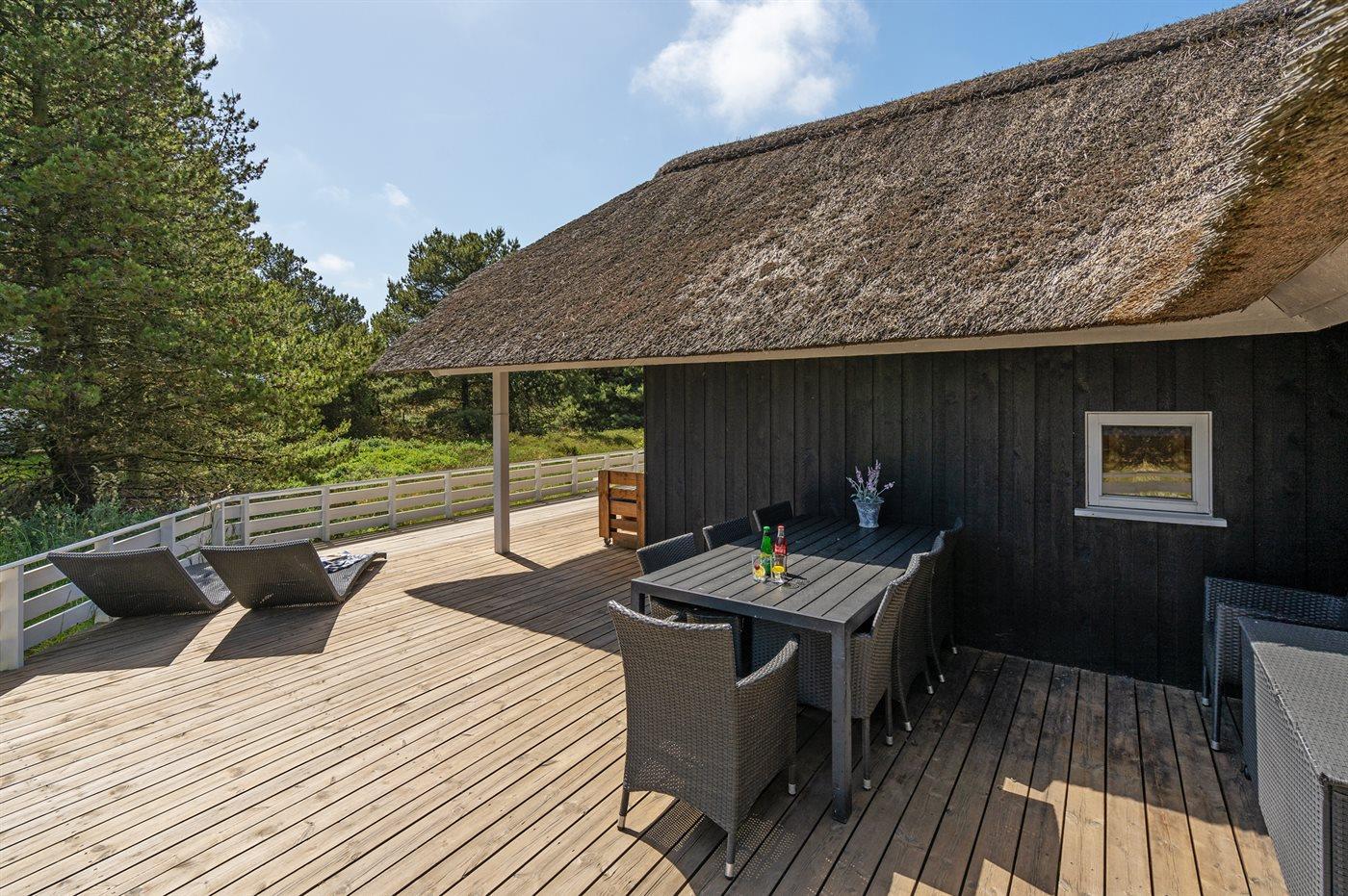 Flot, stråtækt sommerhus i træ, bygget i 1992 og renoveret i 2011, beliggende på en stor, tilbagetrukket naturgrund med lyng. Grunden ligger ugeneret og er omgivet af træer. Til huset hører en stor, afskærmet, delvist overdækket terrasse med havemøbler. Badeværelse med bl.a. 2-pers. spa, gulvvarme, bruser og direkte adgang til husets sauna. Det flotte, lyse køkken er kombineret med spisestuen og er udstyret med bl.a. opvaskemaskine, vaskemaskine og tørretumbler. Opholdsstuen er indrettet med store panoramavinduer, brændeovn, DVD-afspiller, TV med parabolantenne og stereoanlæg med CD-afspiller samt udgang til terrassen. Desuden gratis, trådløs internetforbindelse til rådighed (computer skal medbringes). Sovepladserne er fordelt på 3 værelser; 1 med dobbeltseng, 1 med dobbeltseng og 1 enkeltseng samt 1 med køjeseng og 1 enkeltseng. Til de små feriegæster er der barneseng, høj barnestol, sandkasse og gynge til rådighed.