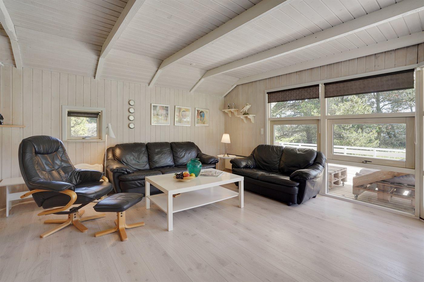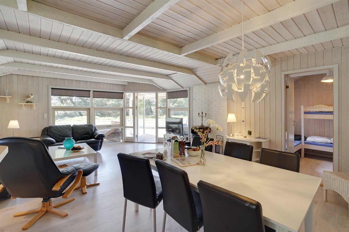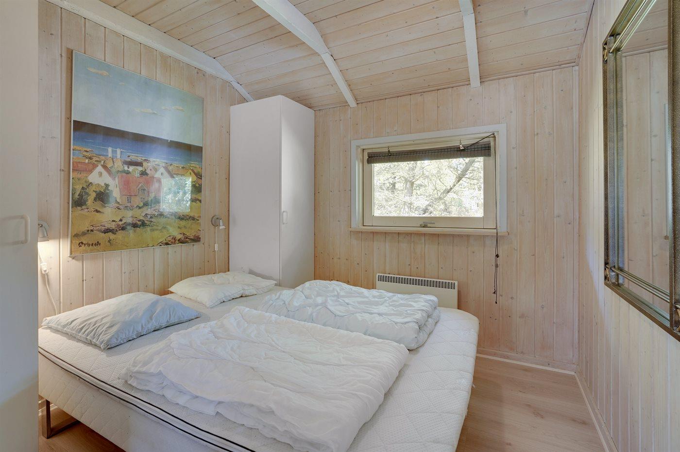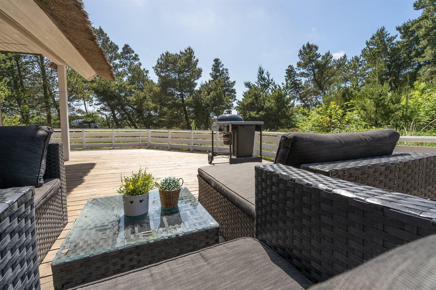 Flot, stråtækt sommerhus i træ, bygget i 1992 og renoveret i 2011, beliggende på en stor, tilbagetrukket naturgrund med lyng. Grunden ligger ugeneret og er omgivet af træer. Til huset hører en stor, afskærmet, delvist overdækket terrasse med havemøbler. Badeværelse med bl.a. 2-pers. spa, gulvvarme, bruser og direkte adgang til husets sauna. Det flotte, lyse køkken er kombineret med spisestuen og er udstyret med bl.a. opvaskemaskine, vaskemaskine og tørretumbler. Opholdsstuen er indrettet med store panoramavinduer, brændeovn, DVD-afspiller, TV med parabolantenne og stereoanlæg med CD-afspiller samt udgang til terrassen. Desuden gratis, trådløs internetforbindelse til rådighed (computer skal medbringes). Sovepladserne er fordelt på 3 værelser; 1 med dobbeltseng, 1 med dobbeltseng og 1 enkeltseng samt 1 med køjeseng og 1 enkeltseng. Til de små feriegæster er der barneseng, høj barnestol, sandkasse og gynge til rådighed.