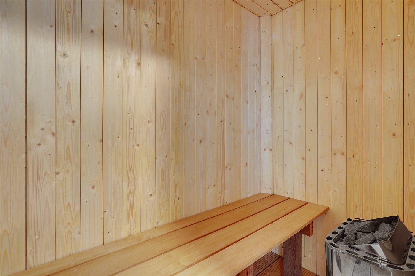 Der er 1 badeværelse med bruseniche og 2 toiletter, heraf 1 gæstetoilet. Der er gulvvarme på 1 badeværelse. Der er gulvvarme på gæstetoilettet.. Badekar. I saunaen er der mulighed for afslapning.