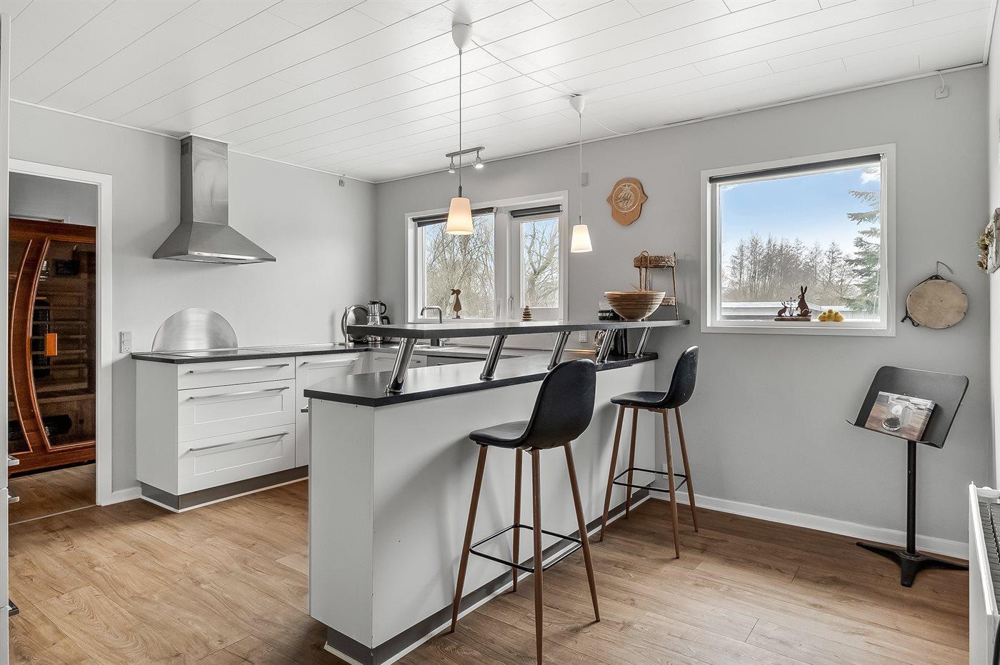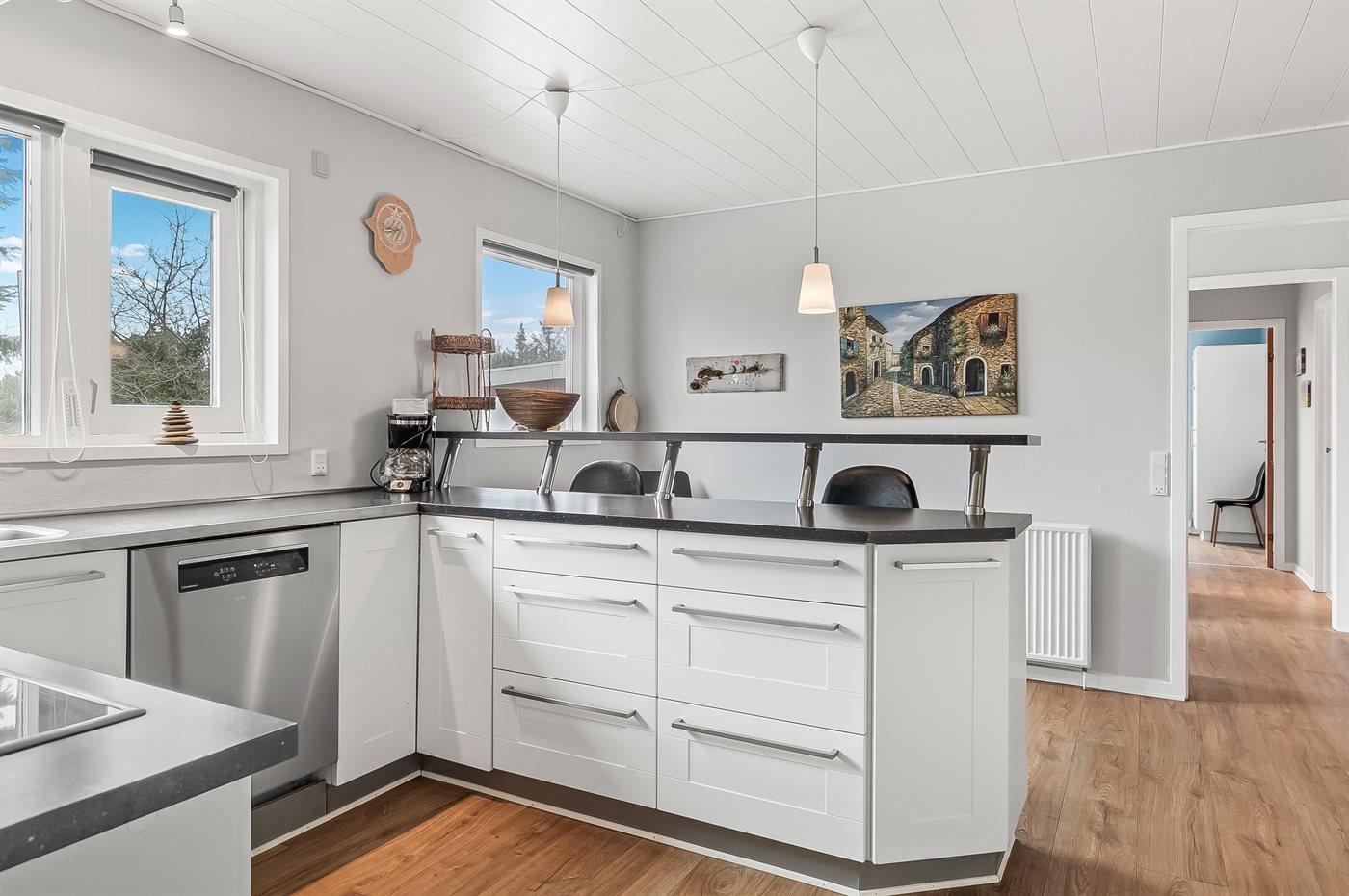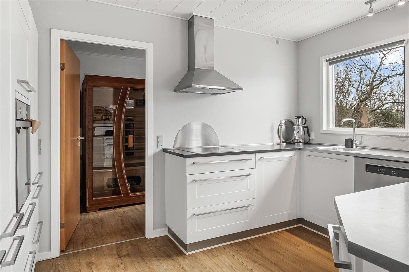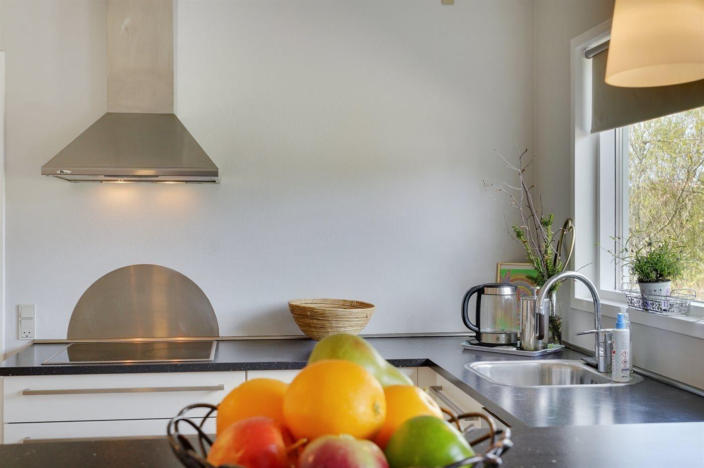 Køkkenet er udstyret med 1 køleskab. Der er 4 keramiske kogeplader, varmluftovn samt opvaskemaskine.