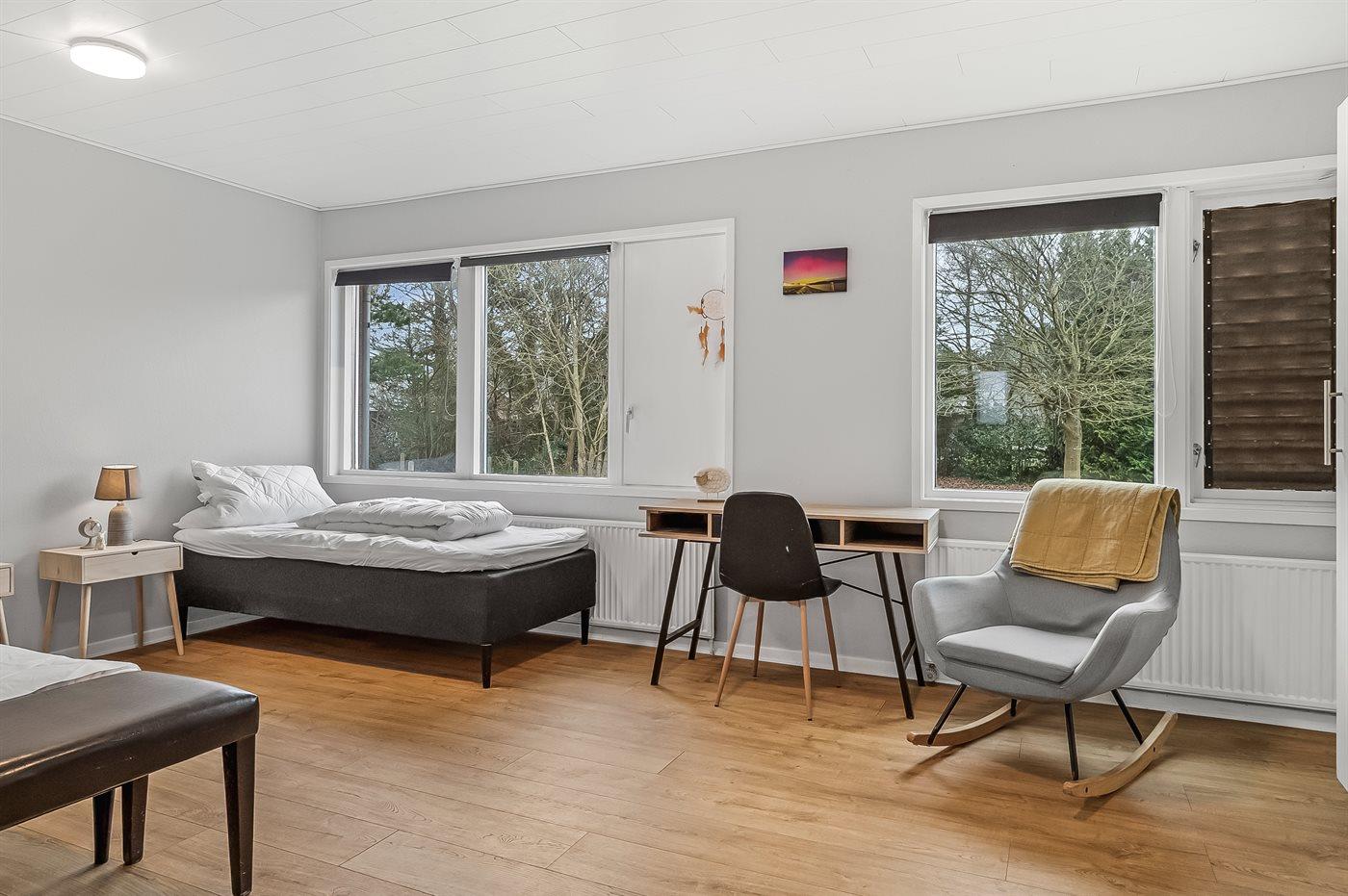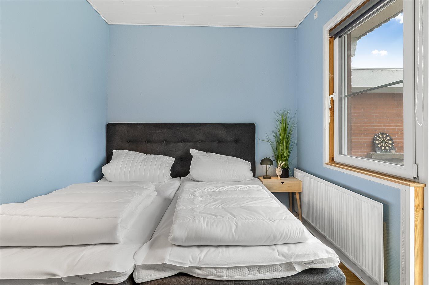 Der er i alt 2 soveværelser. Sovepladserne fordeler sig på: 2 sovepladser i dobbeltseng. 2 sovepladser i enkeltsenge. 2 sovepladser i sovesofa (dobbelt). 2 af disse sovepladser befinder sig i stuen.