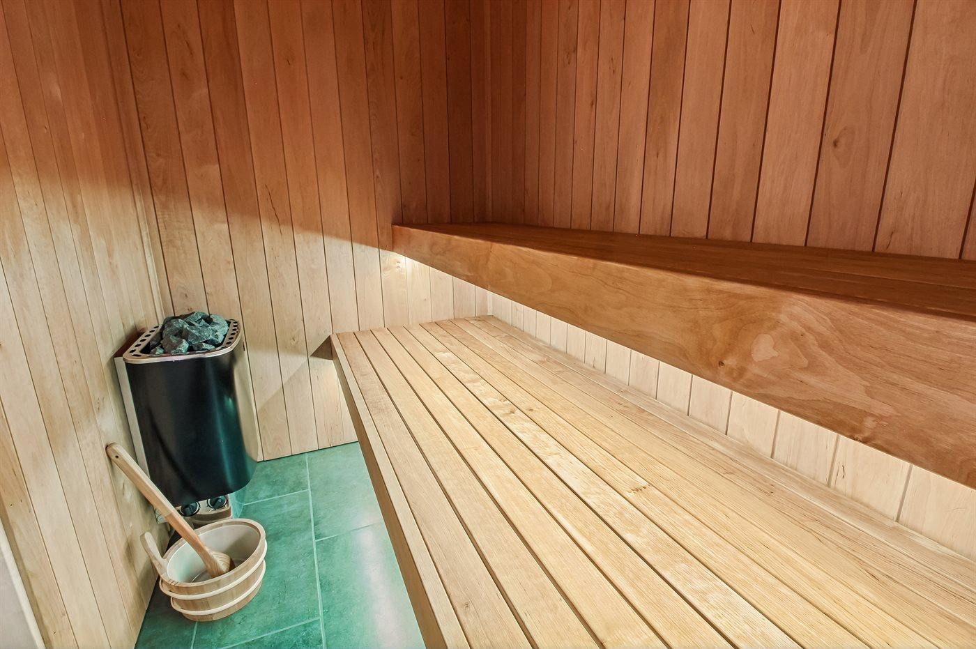 Der er 2 badeværelser med bruser og 2 toiletter. Der er gulvvarme på 2 badeværelser. I saunaen er der mulighed for afslapning.